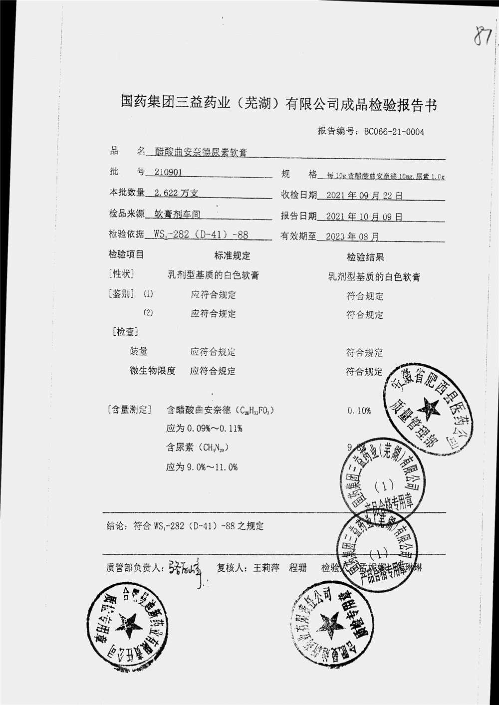 醋酸曲安奈德尿素软膏 | 10g(每10g含醋酸曲安奈德10mg,尿素1.0g) | 210901 | 查看详情 |