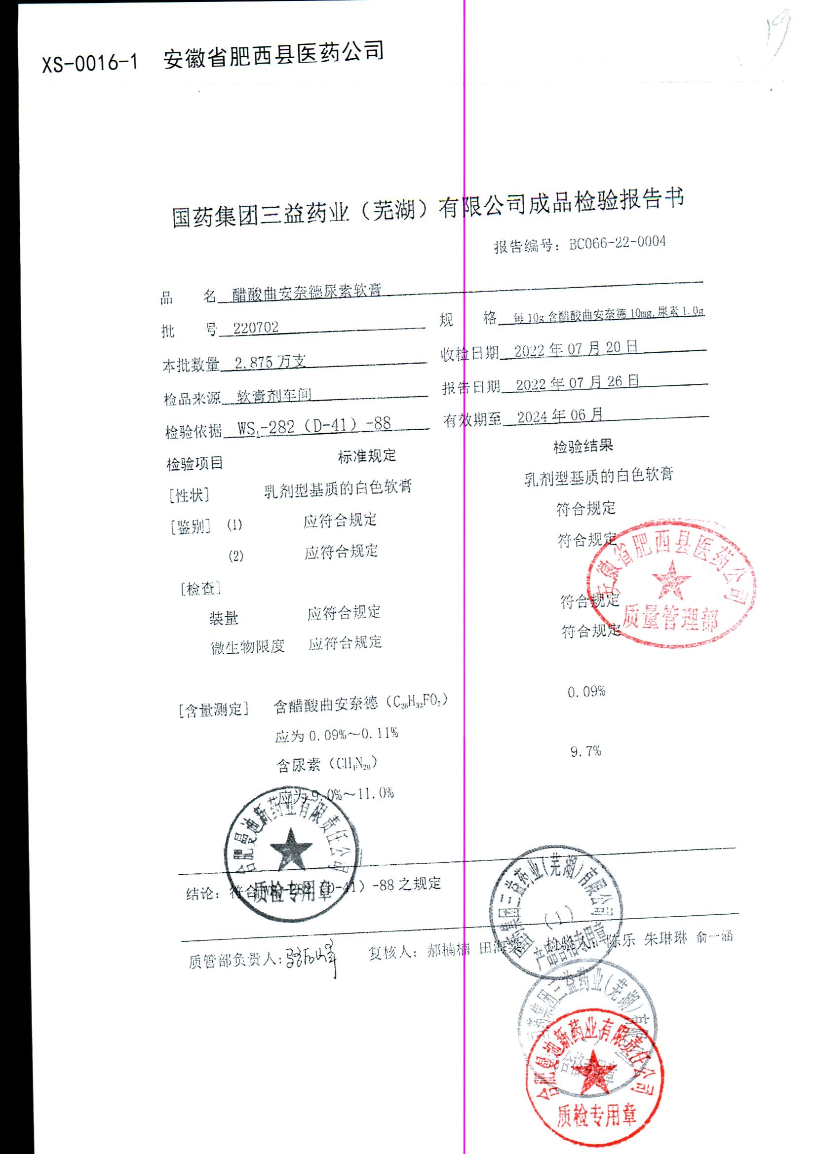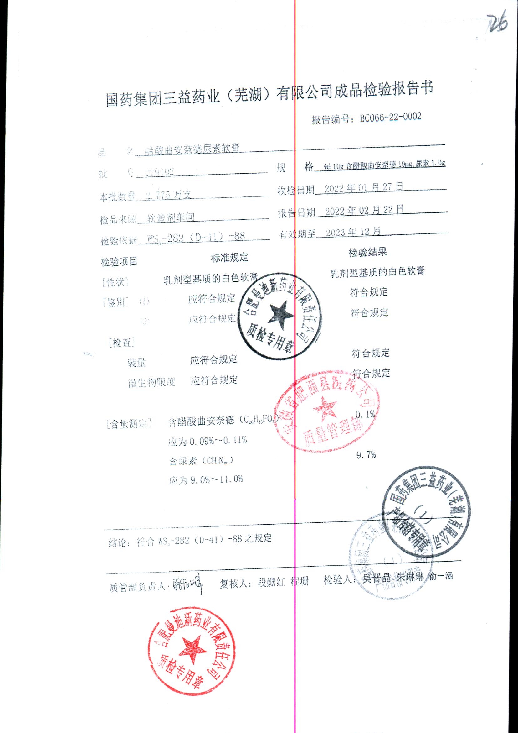 醋酸曲安奈德尿素软膏 | 10g(每10g含醋酸曲安奈德10mg,尿素1.0g) | 220702 | 查看详情 |