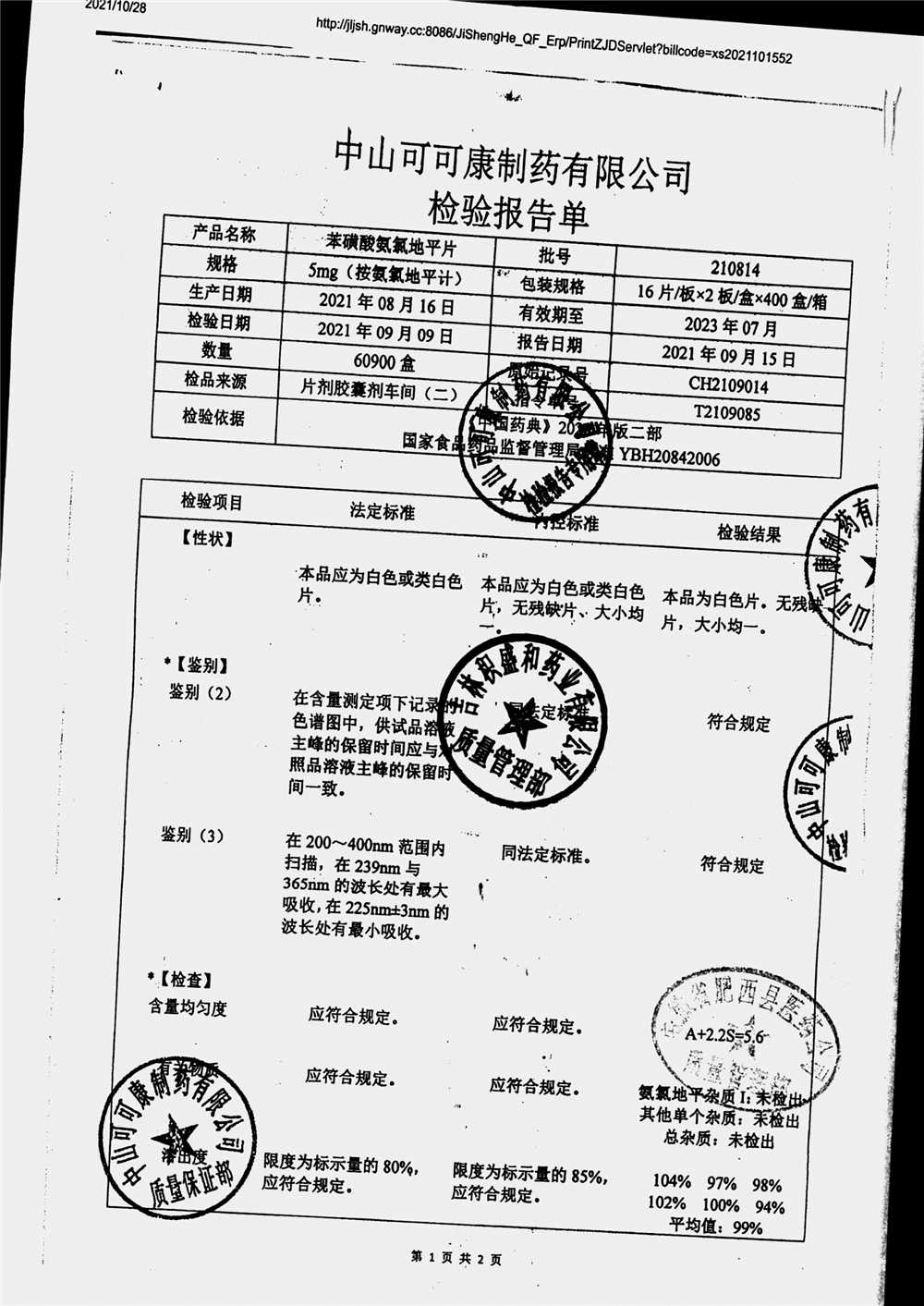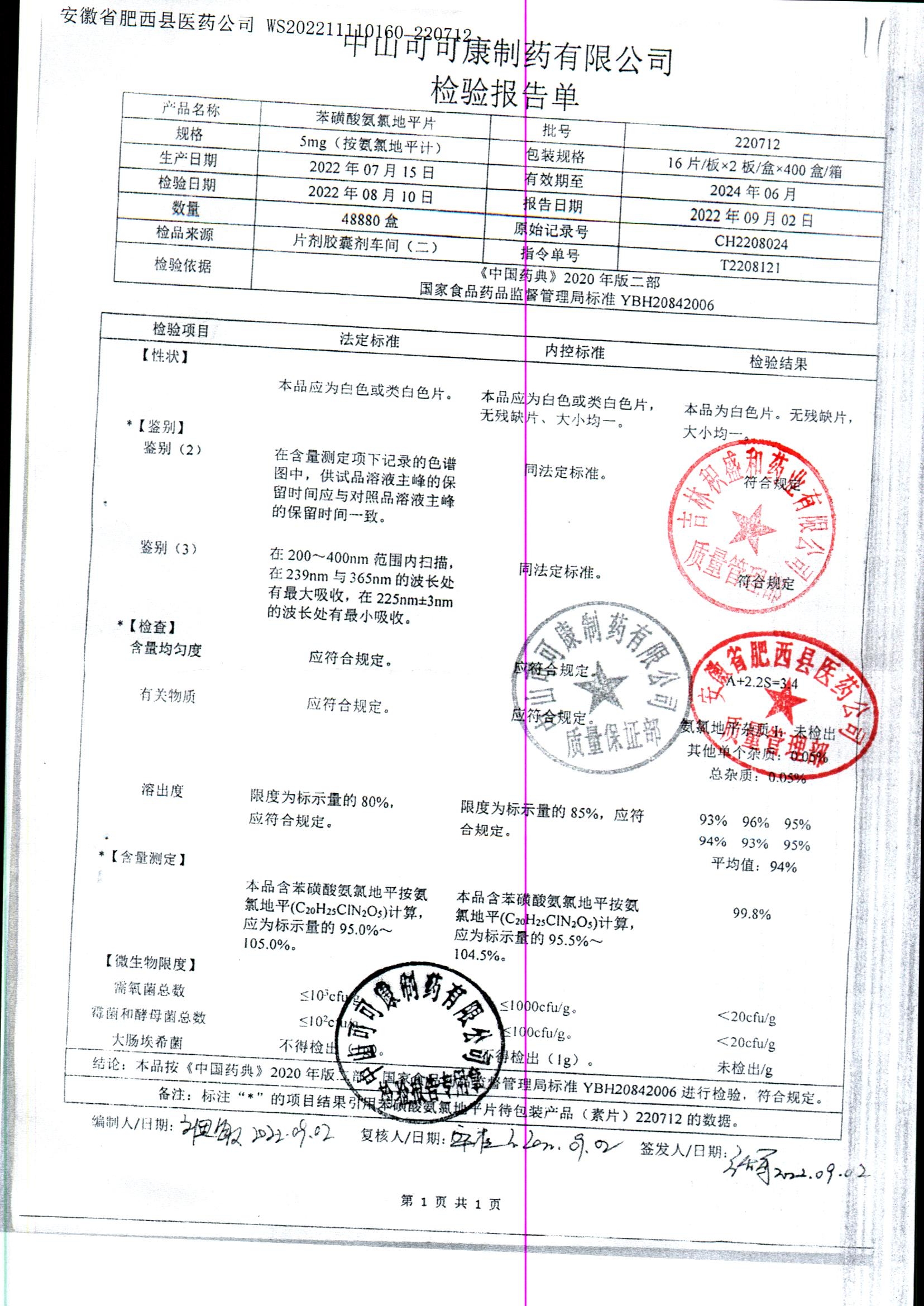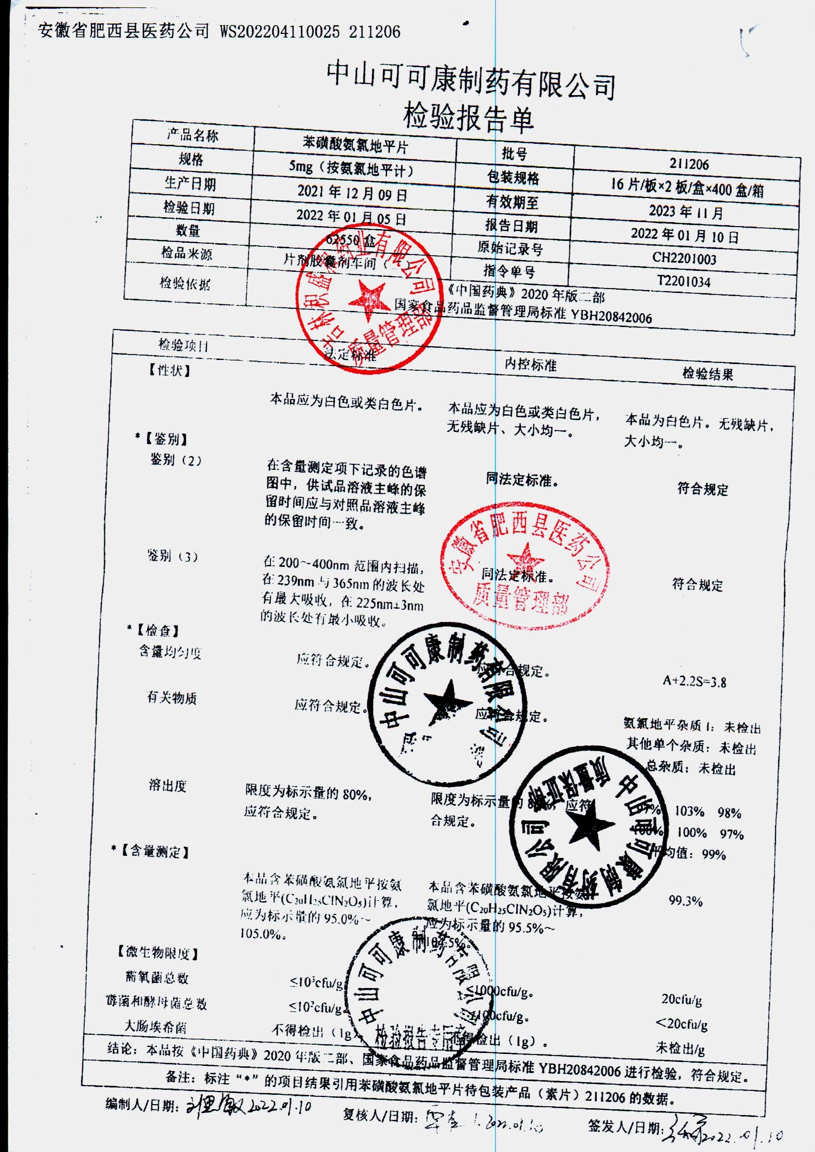苯磺酸氨氯地平片 | 5mg*32片 | 211206 | 查看详情 |