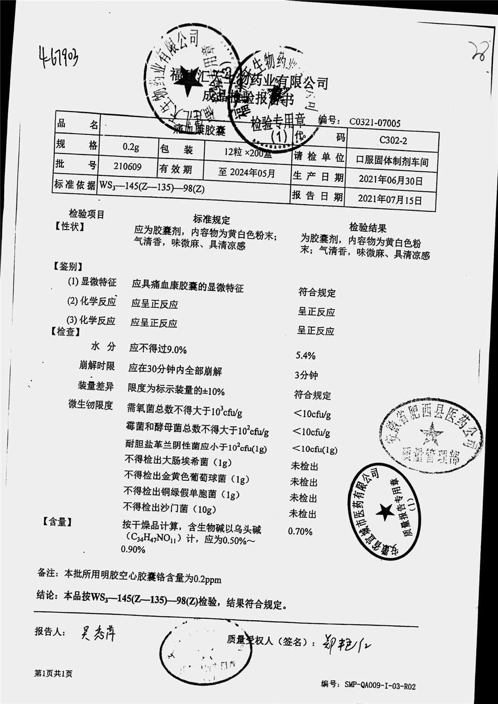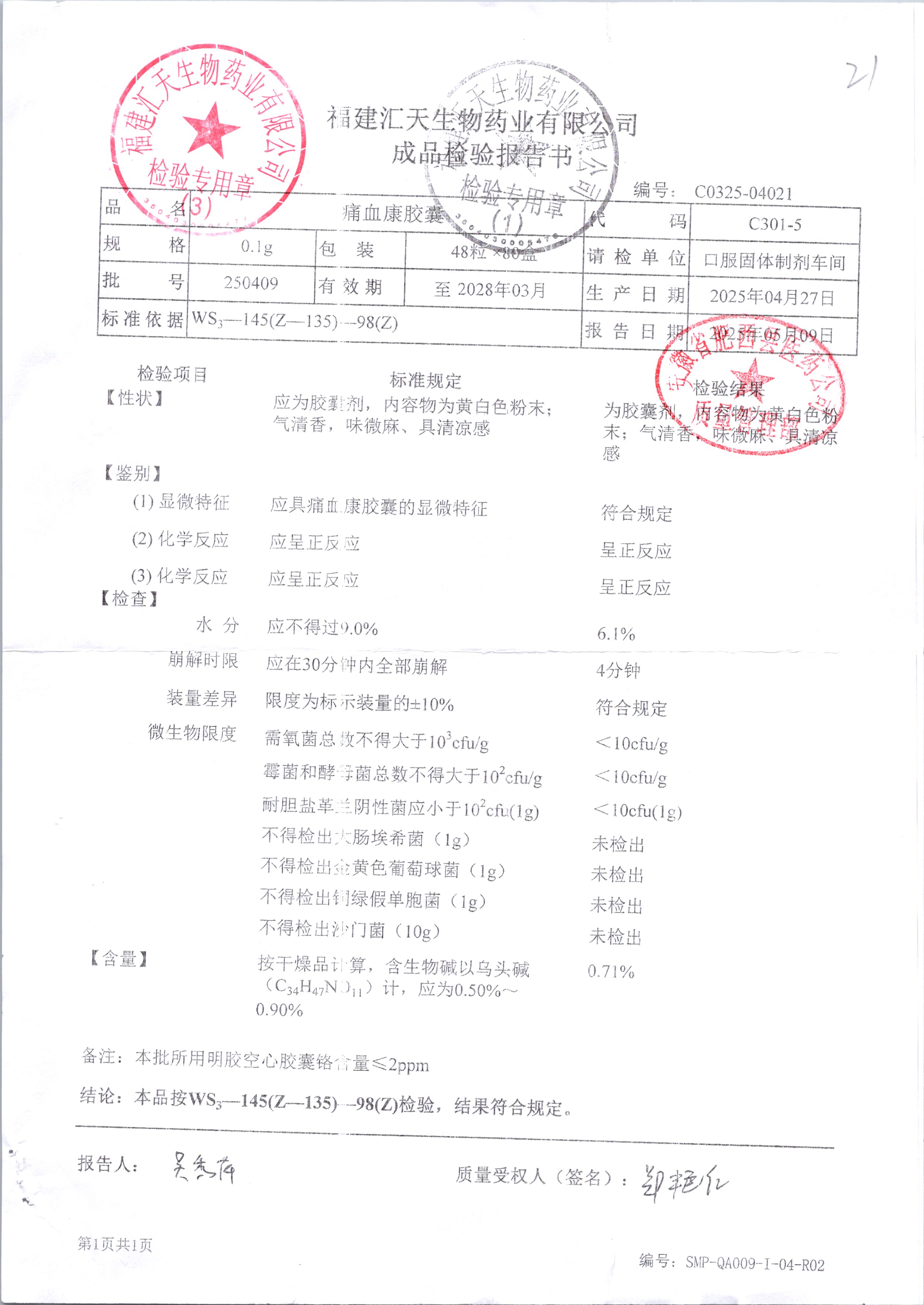 痛血康胶囊 | 0.2g*12s | 210609 | 查看详情 |