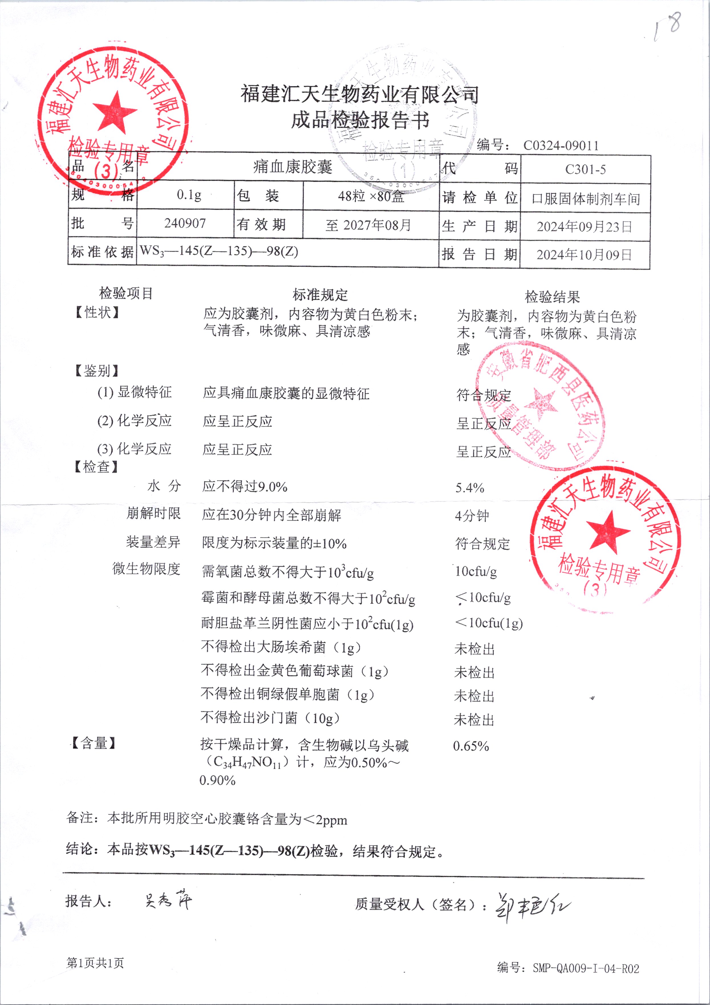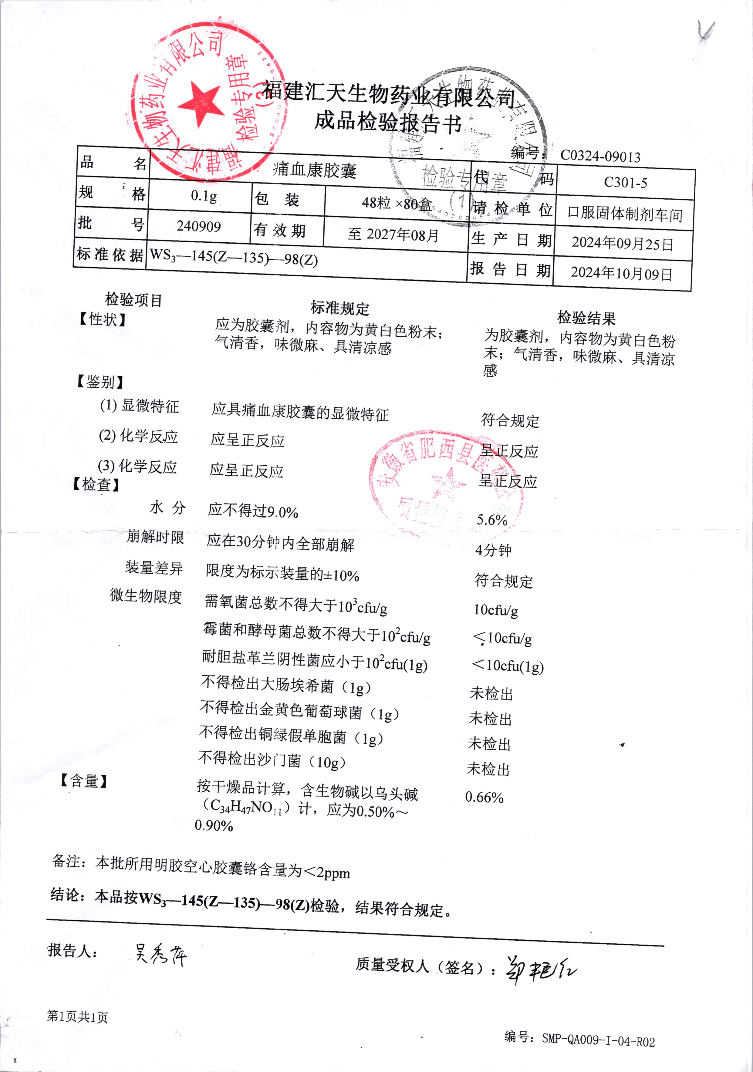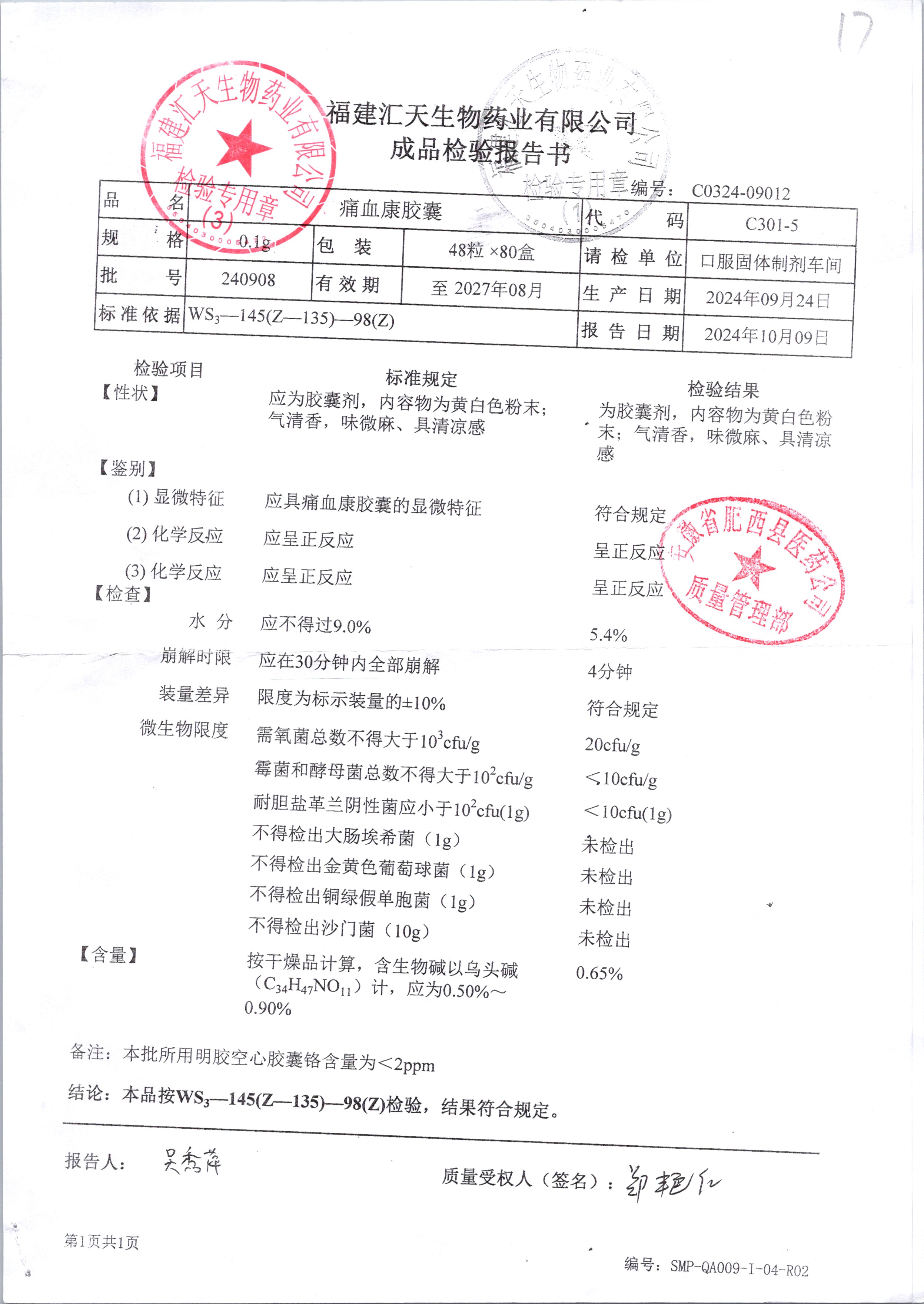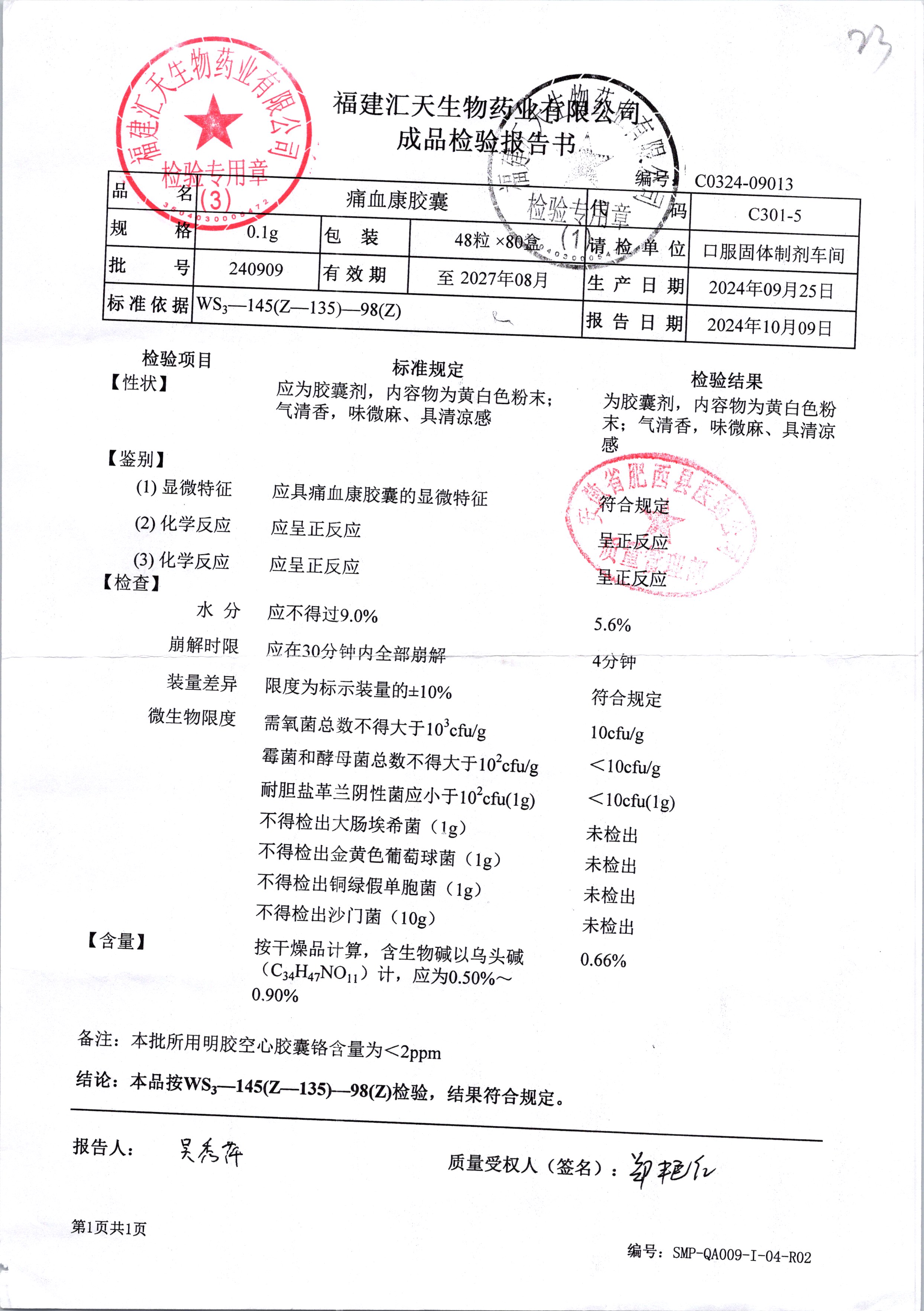 痛血康胶囊 | 0.2g*12s | 240908 | 查看详情 |