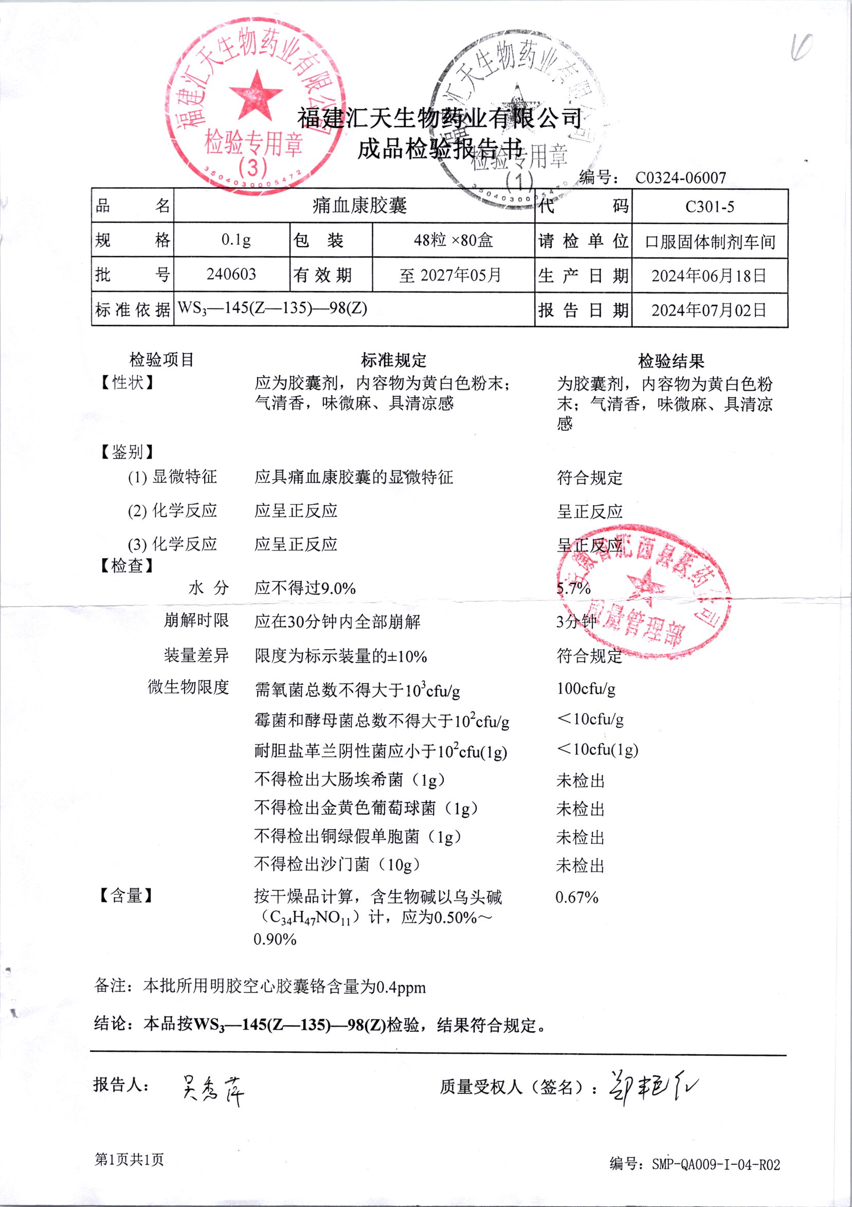 痛血康胶囊 | 0.2g*12s | 240603 | 查看详情 |
