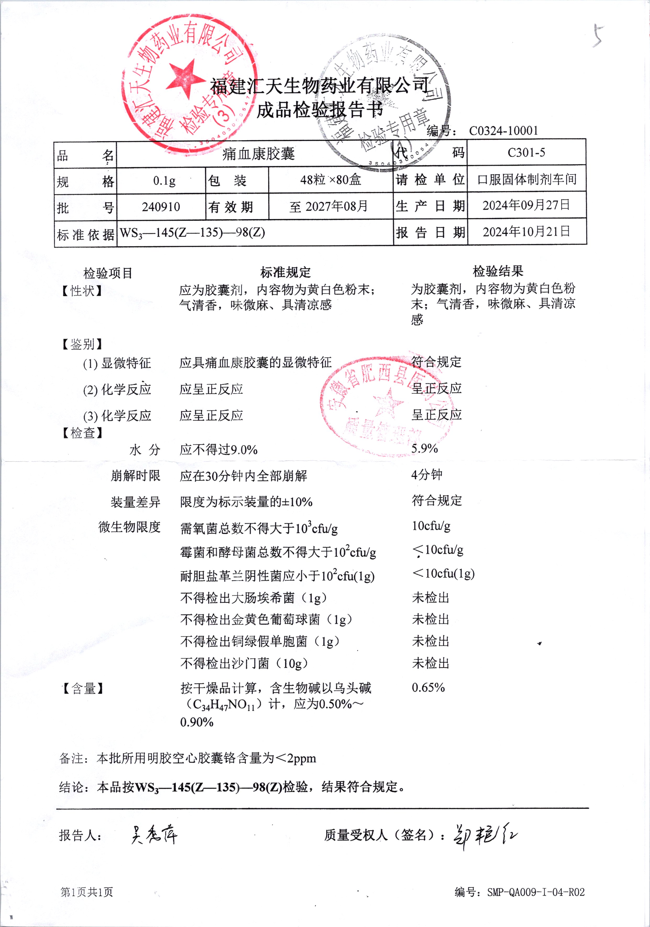 痛血康胶囊 | 0.2g*12s | 240910 | 查看详情 |