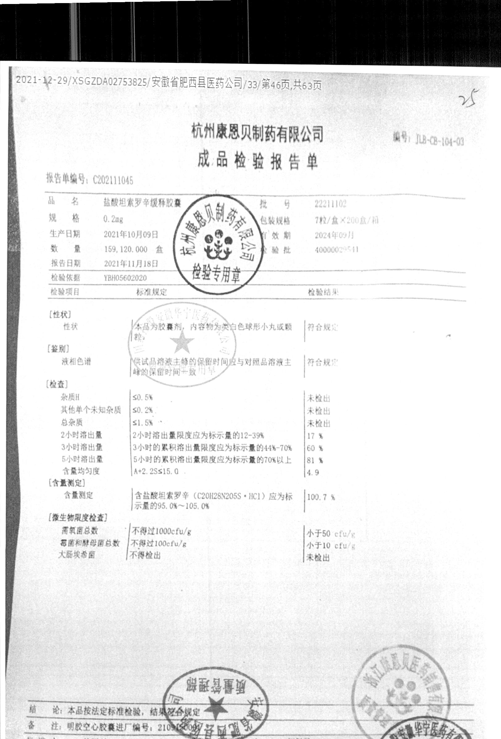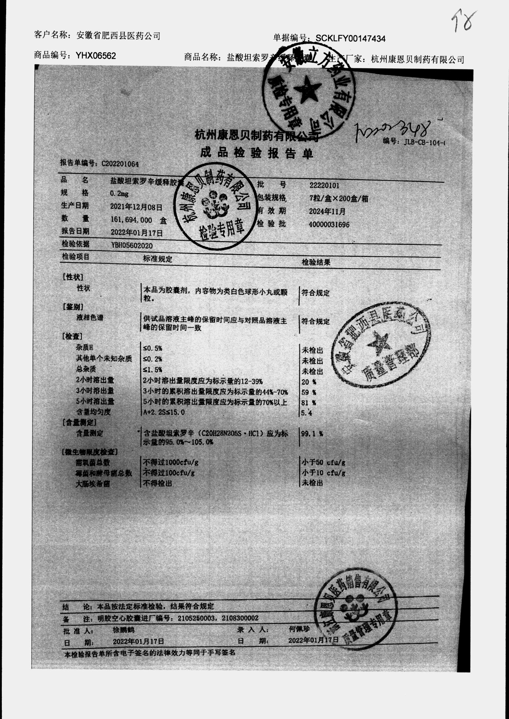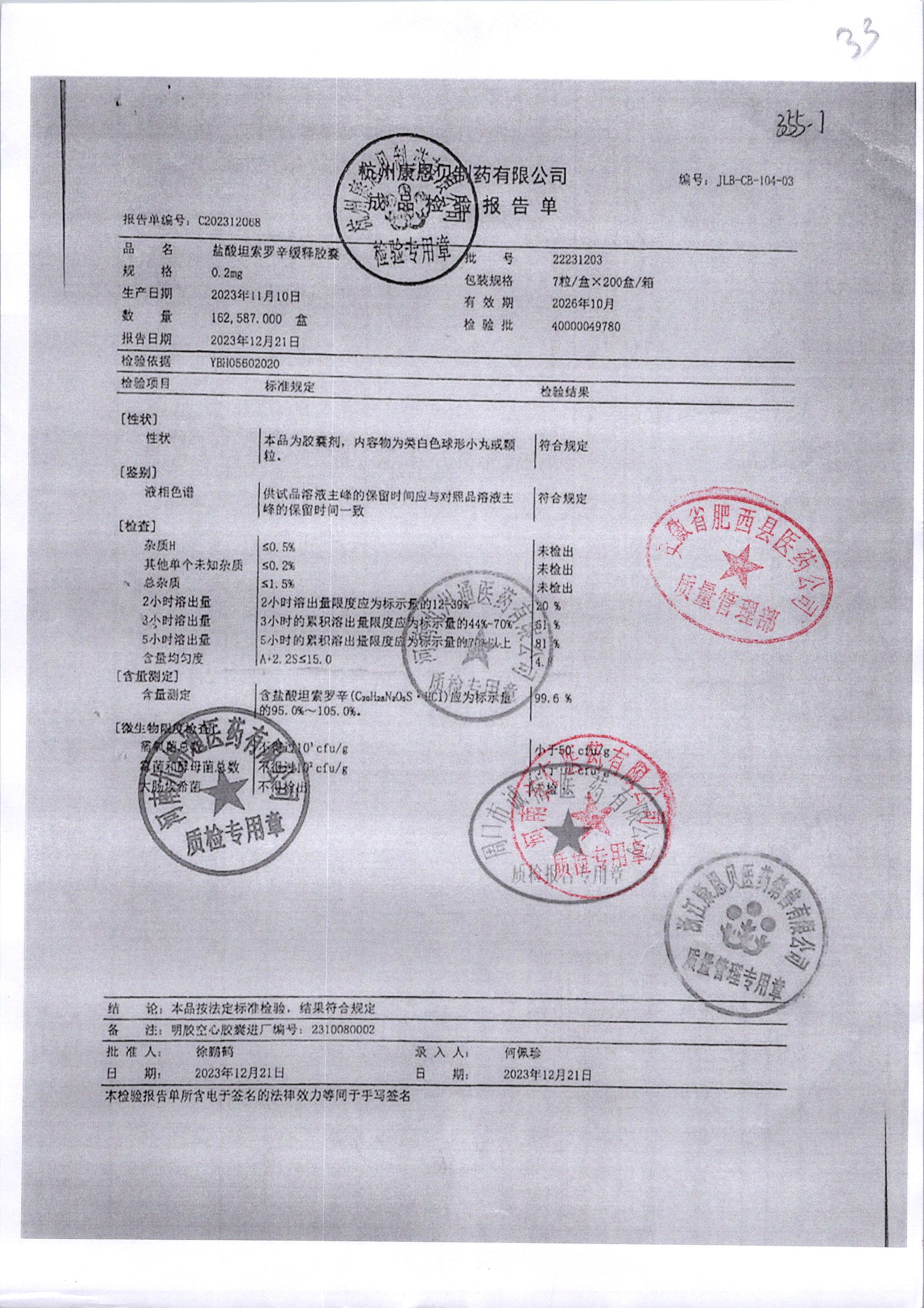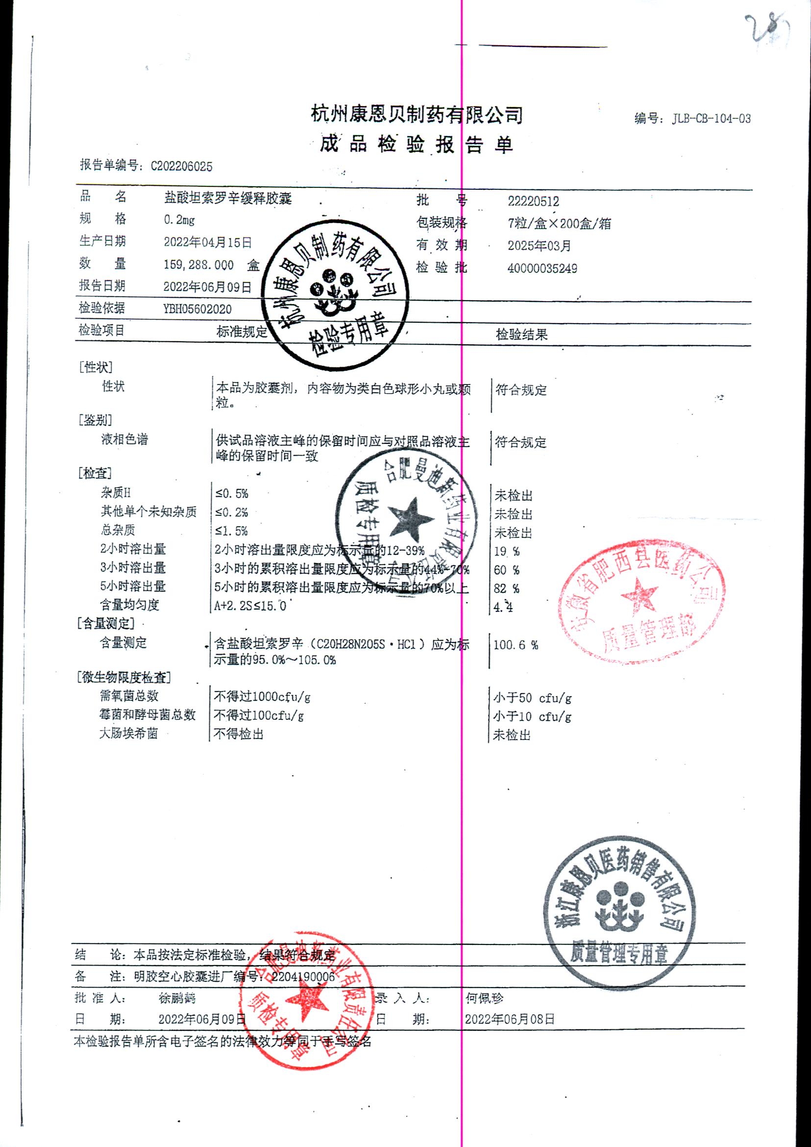 盐酸坦索罗辛缓释胶囊 | 0.2mg*7s | 22210702(1/2) | 查看详情 |