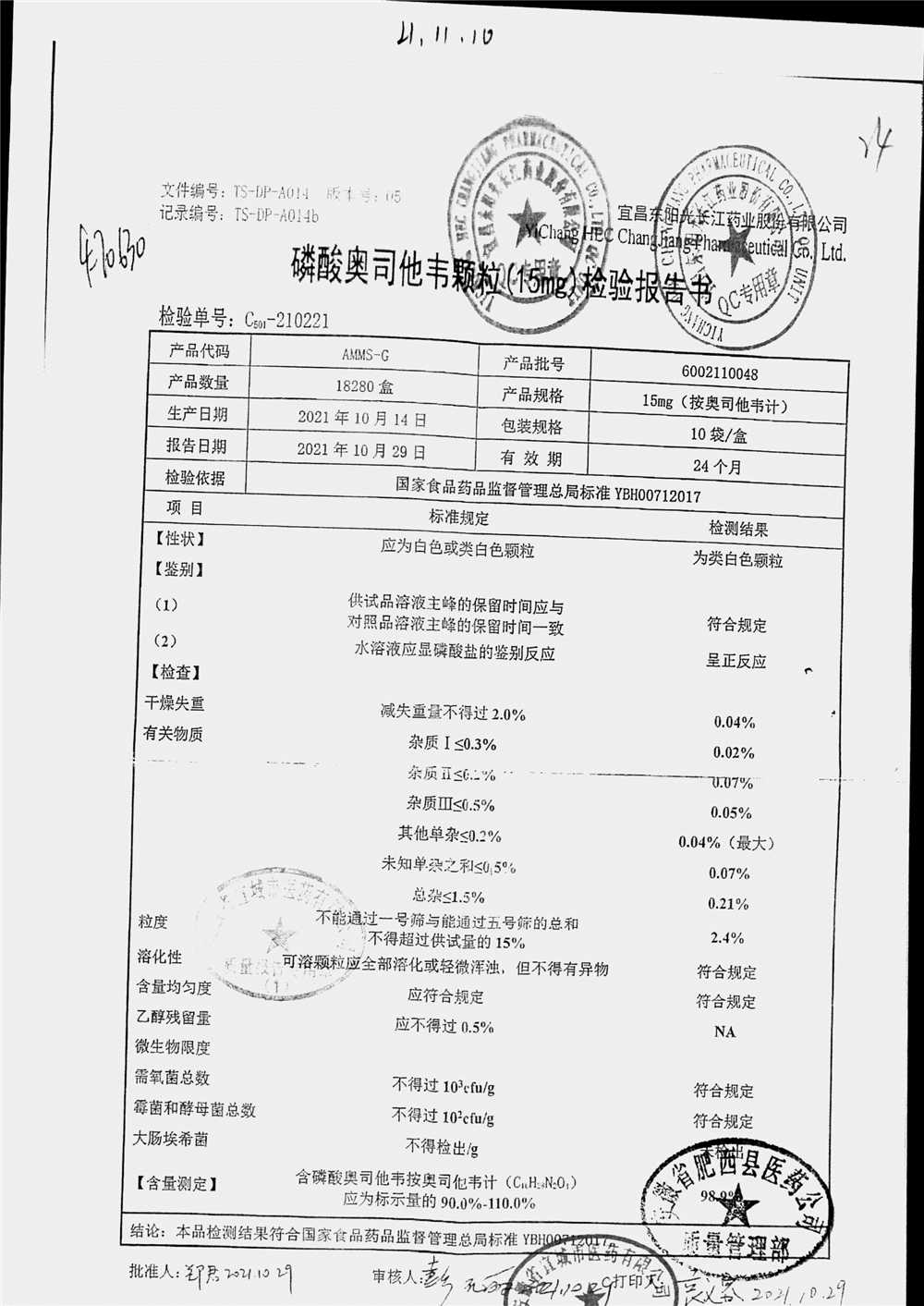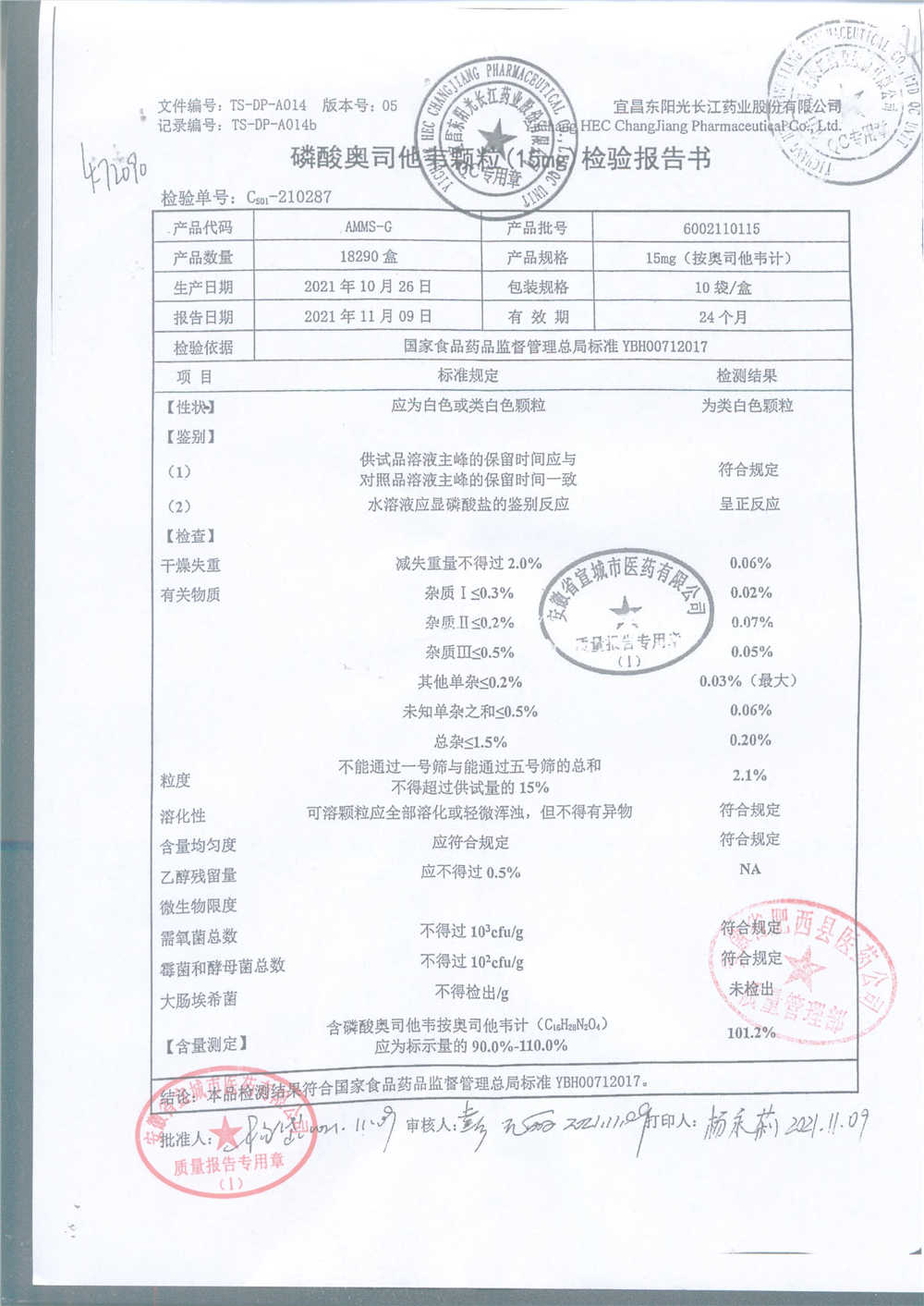 名称 | 规格 | 批号 | 药检报告 |