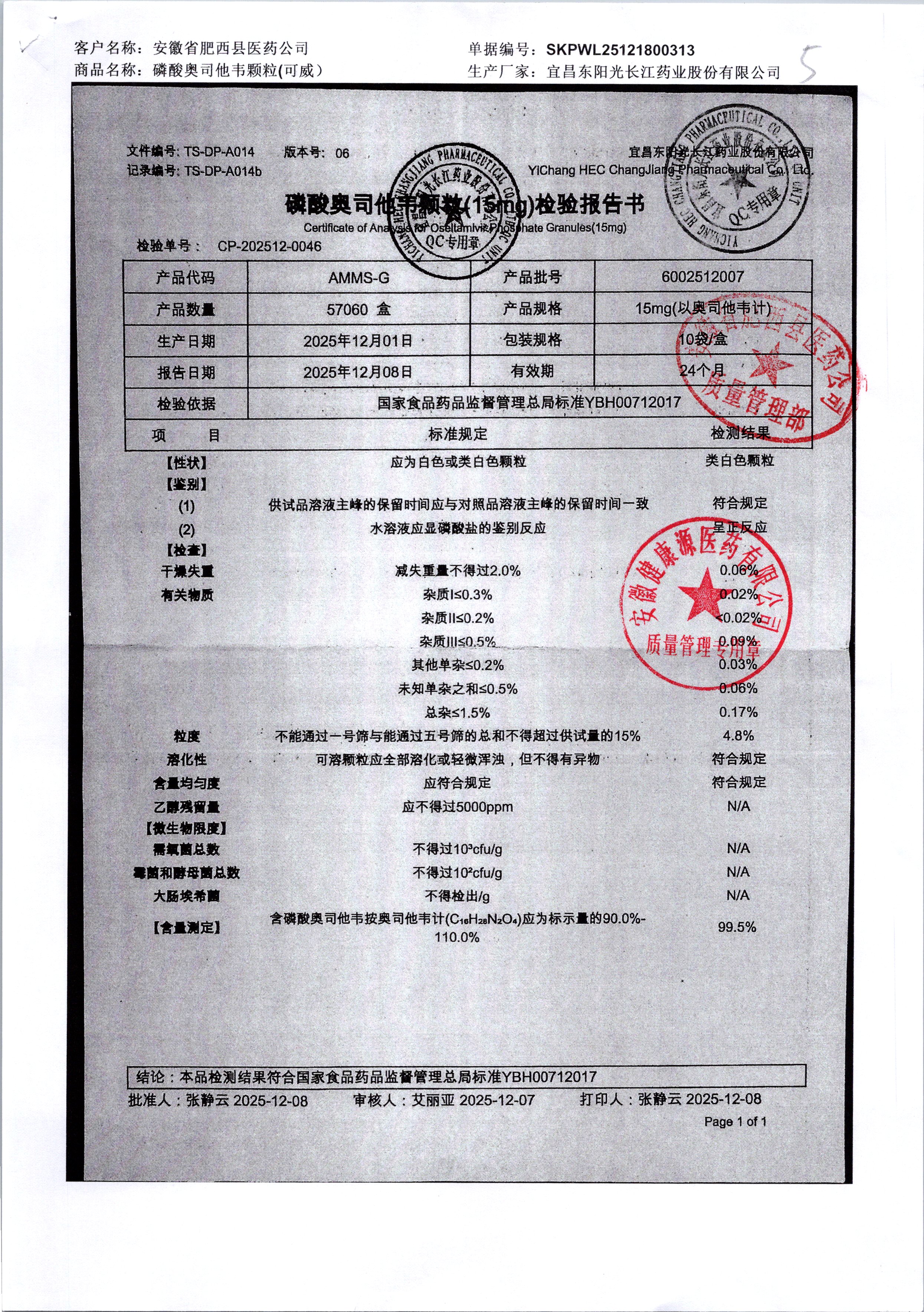 | 磷酸奥司他韦颗粒 | 15mg*10袋 | 6002110048 | 查看详情 |
