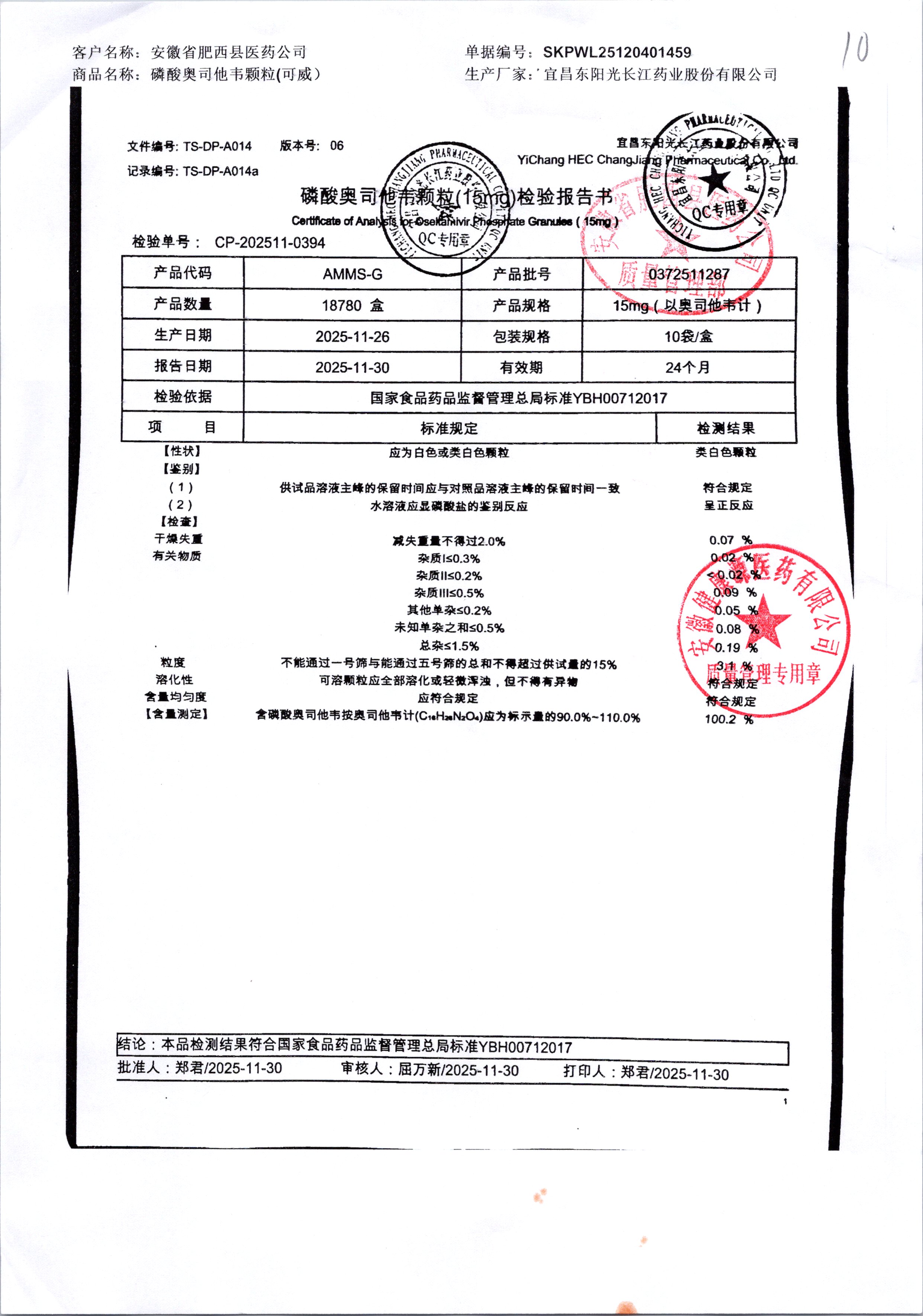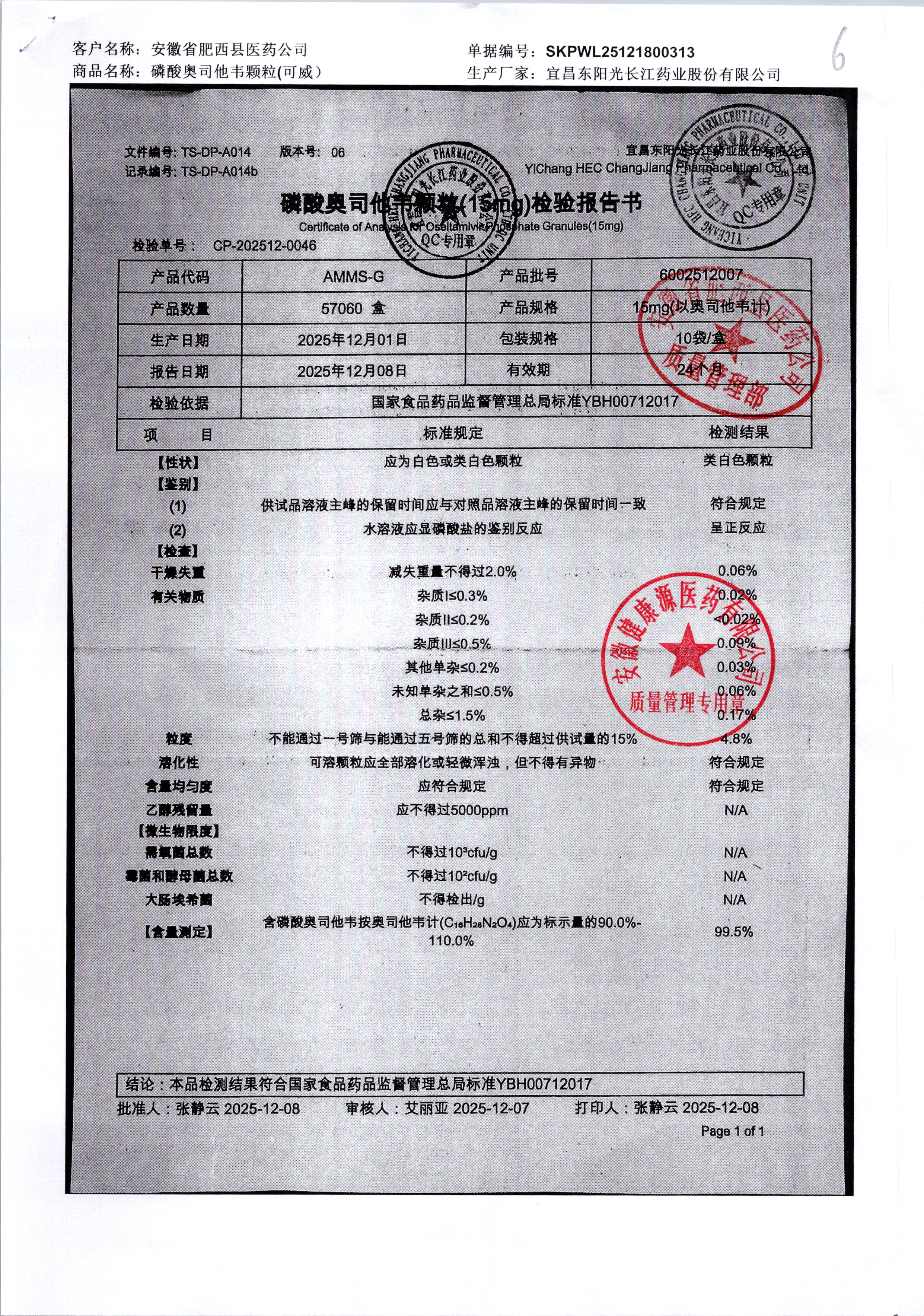 | 磷酸奥司他韦颗粒 | 15mg*10袋 | 6002110115 | 查看详情 |