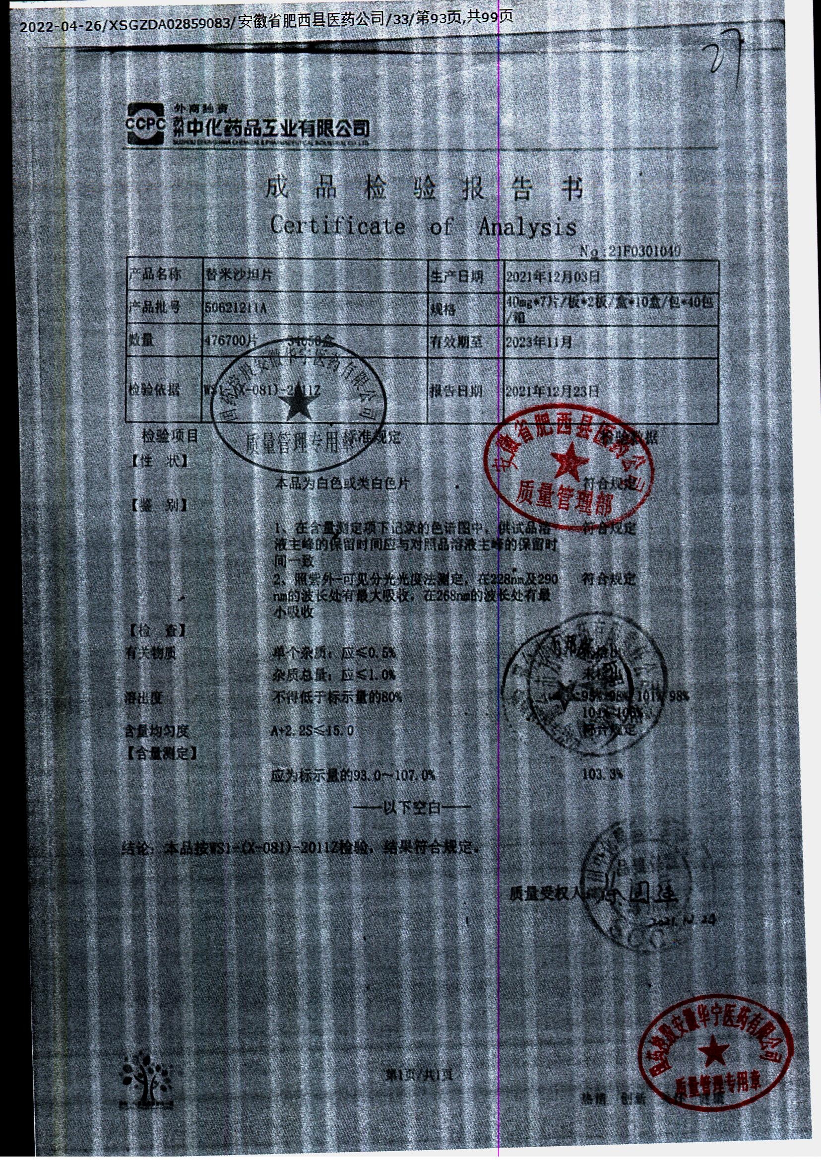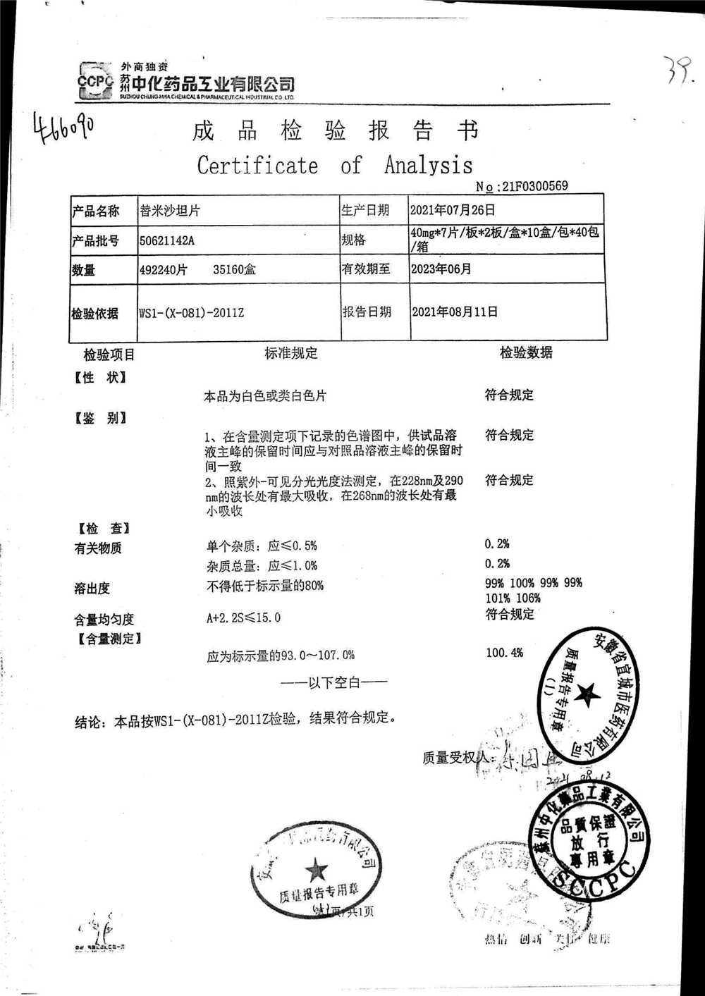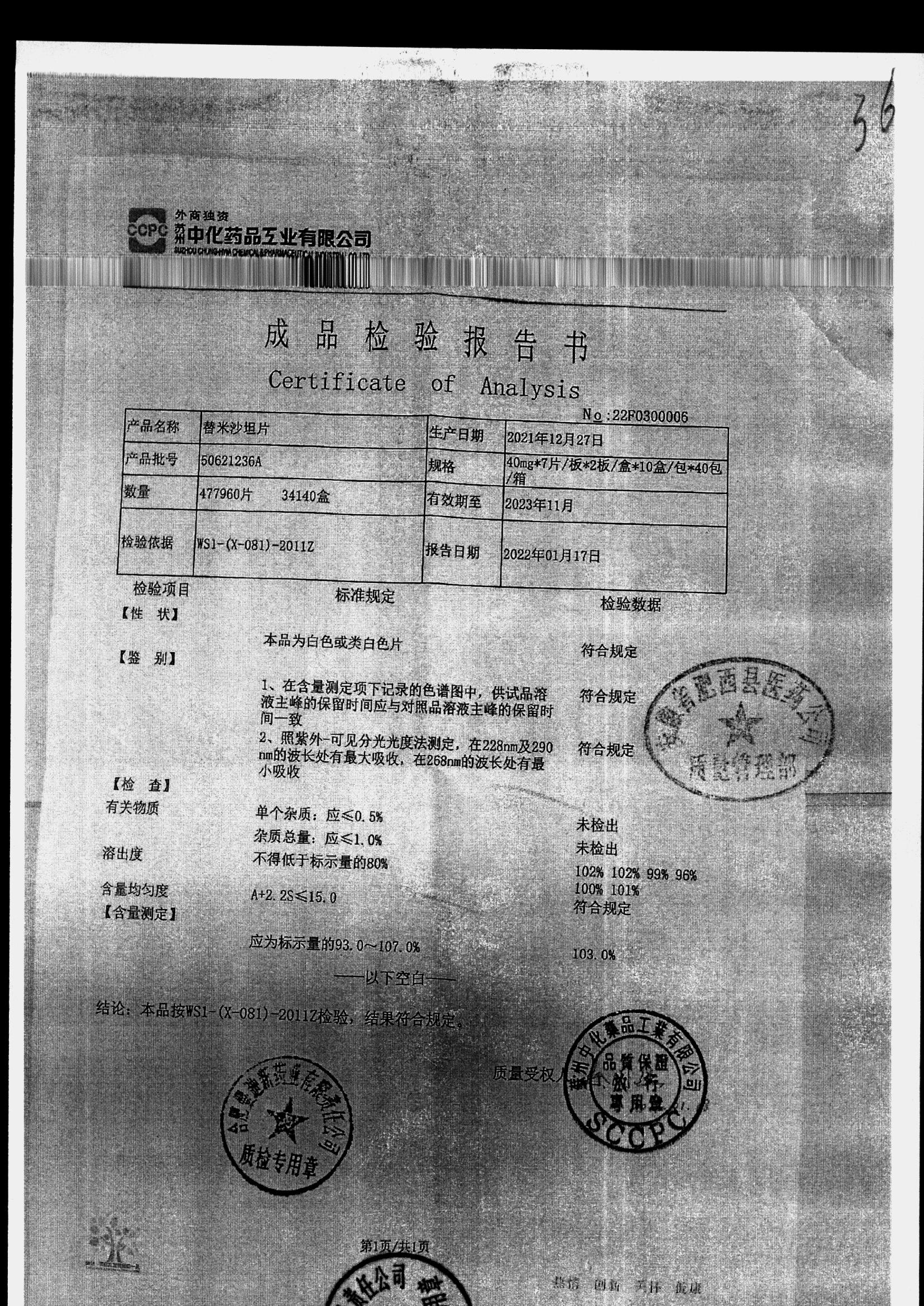 名称 | 规格 | 批号 | 药检报告 |