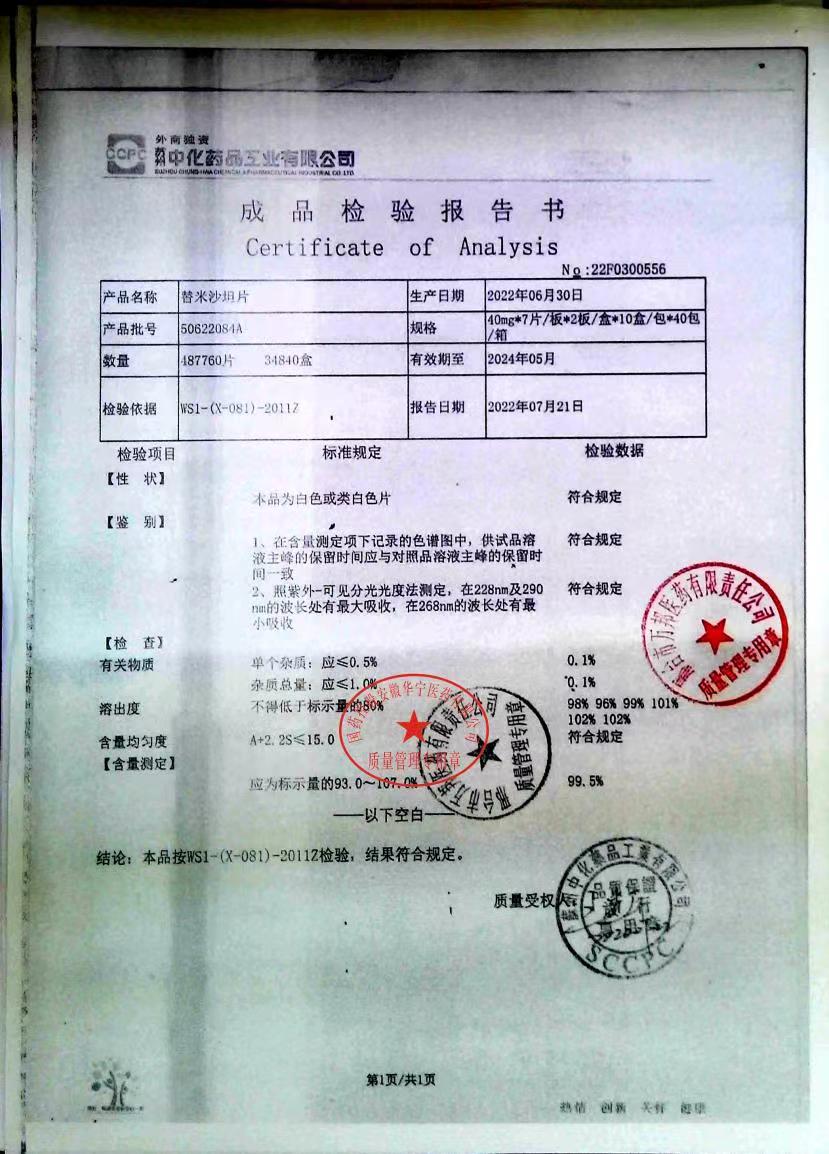 替米沙坦片 | 40mg*7片*2板 | 50622055A | 查看详情 |