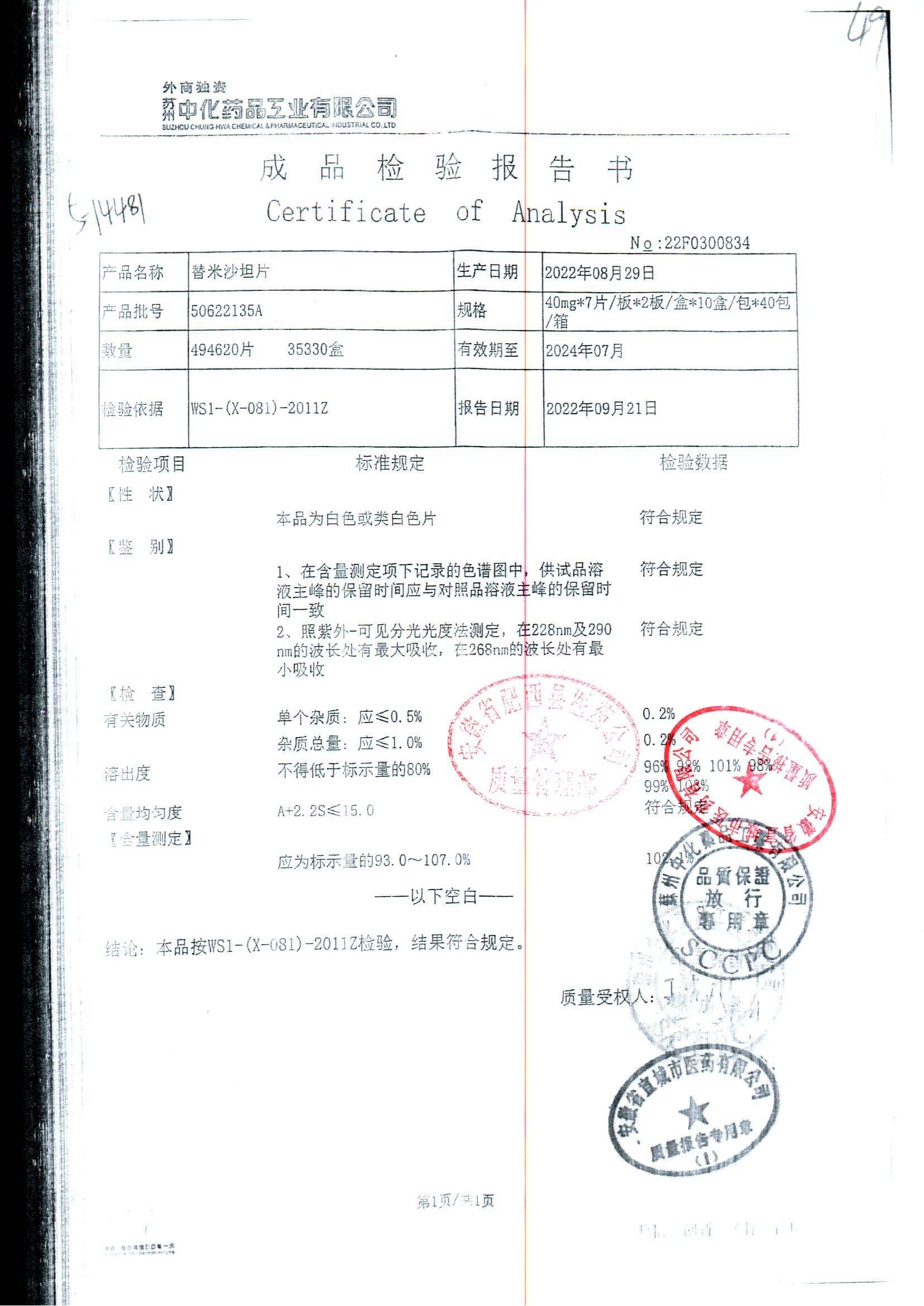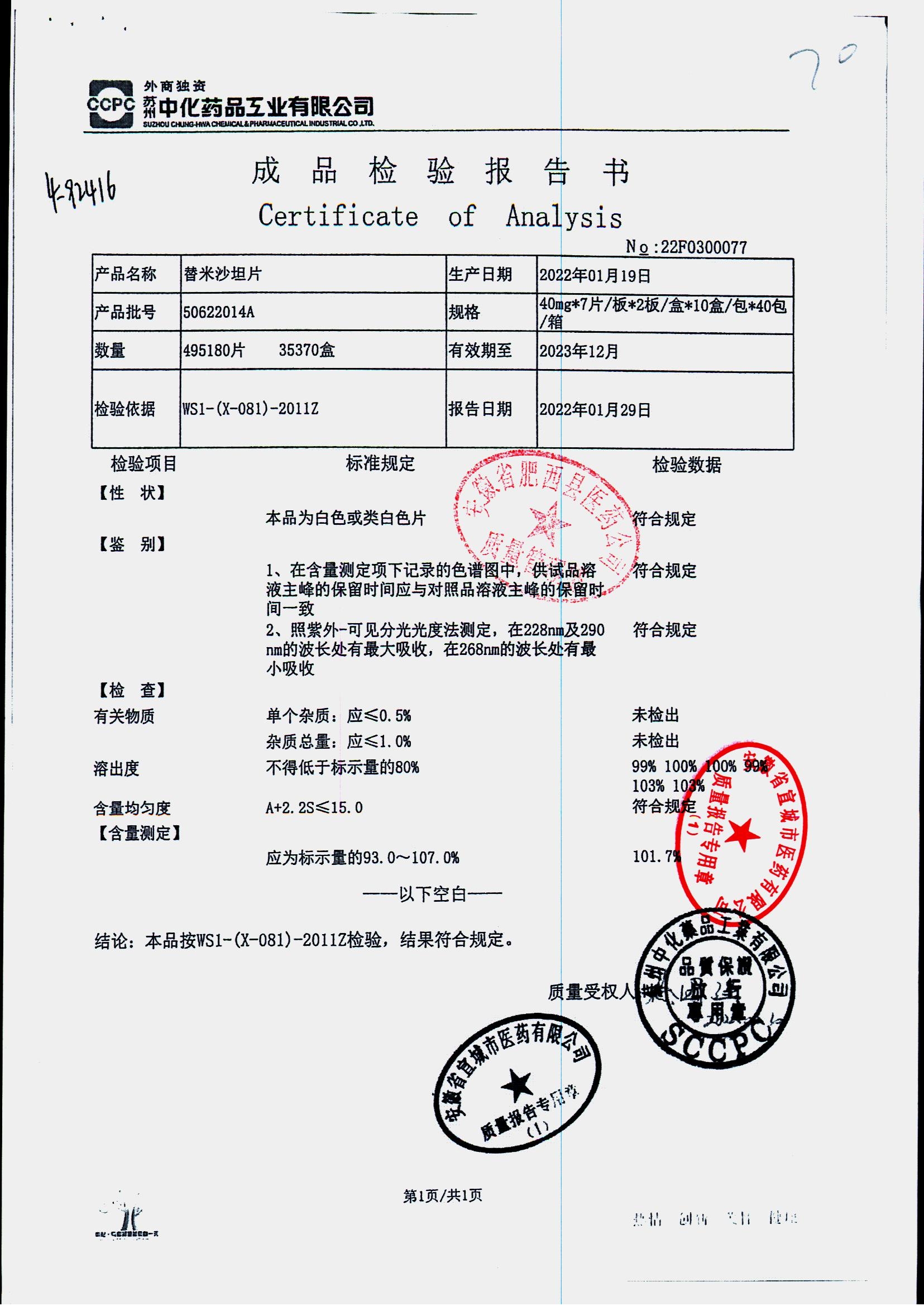替米沙坦片 | 40mg*7片*2板 | 50622014A | 查看详情 |