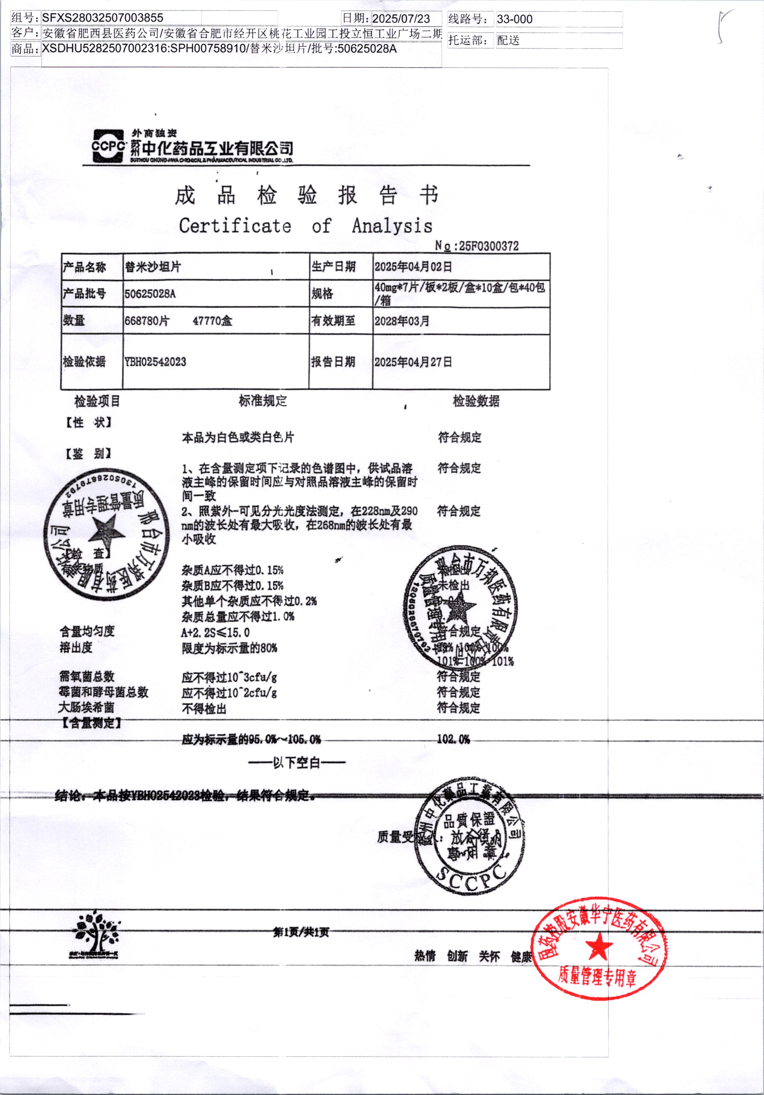 替米沙坦片 | 40mg*7片*2板 | 50625028A | 查看详情 |