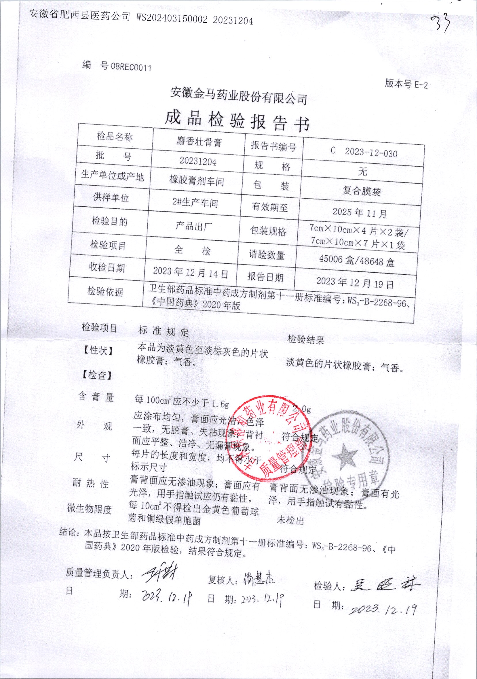 麝香壮骨膏 | 7cm*10cm*7片/袋 | 20231204 | 查看详情 |