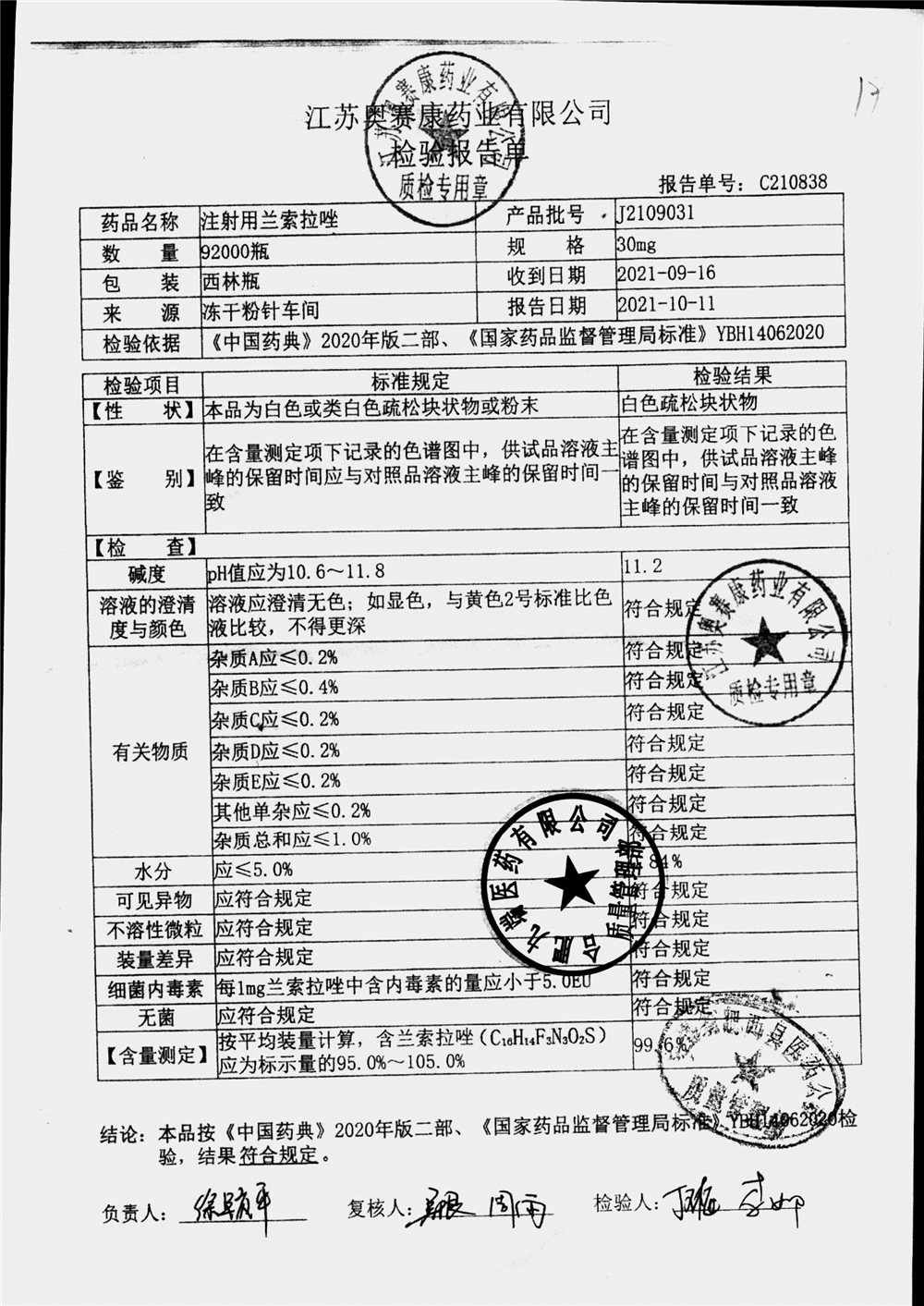 注射用兰索拉唑 | 30mg*10瓶 | J2109031 | 查看详情 |