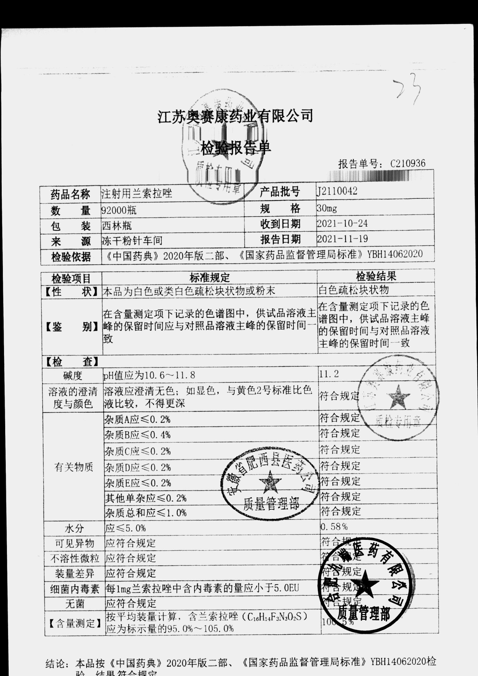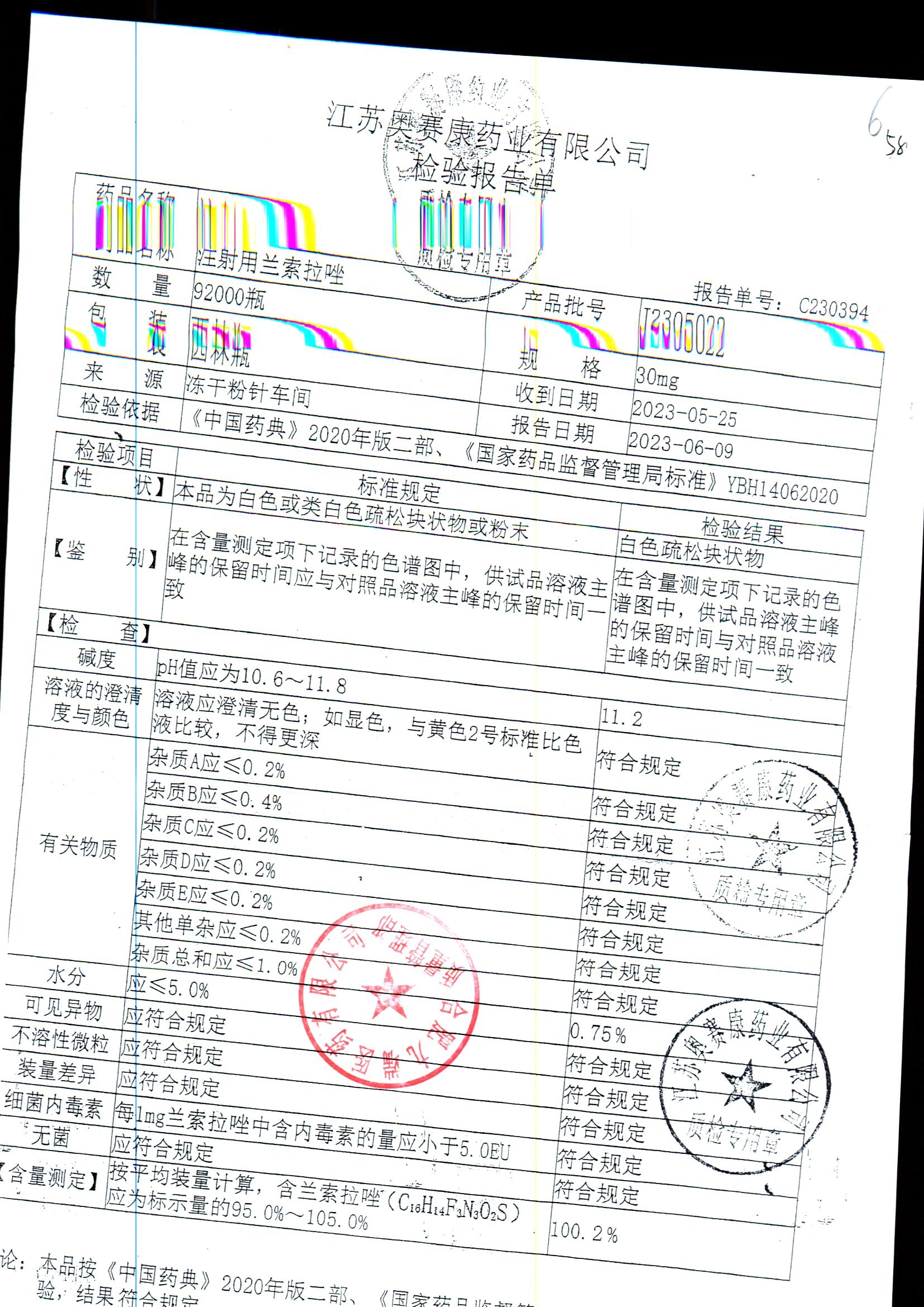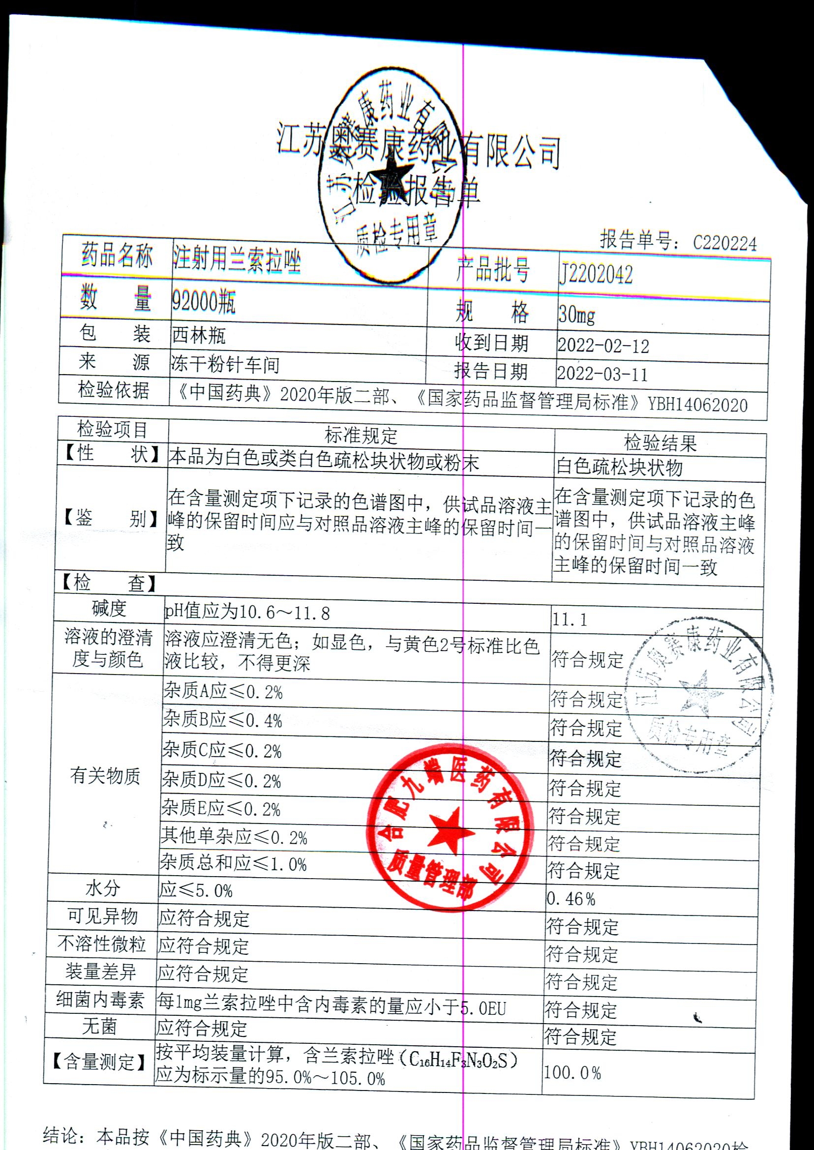 注射用兰索拉唑 | 30mg*10瓶 | J2305022 | 查看详情 |