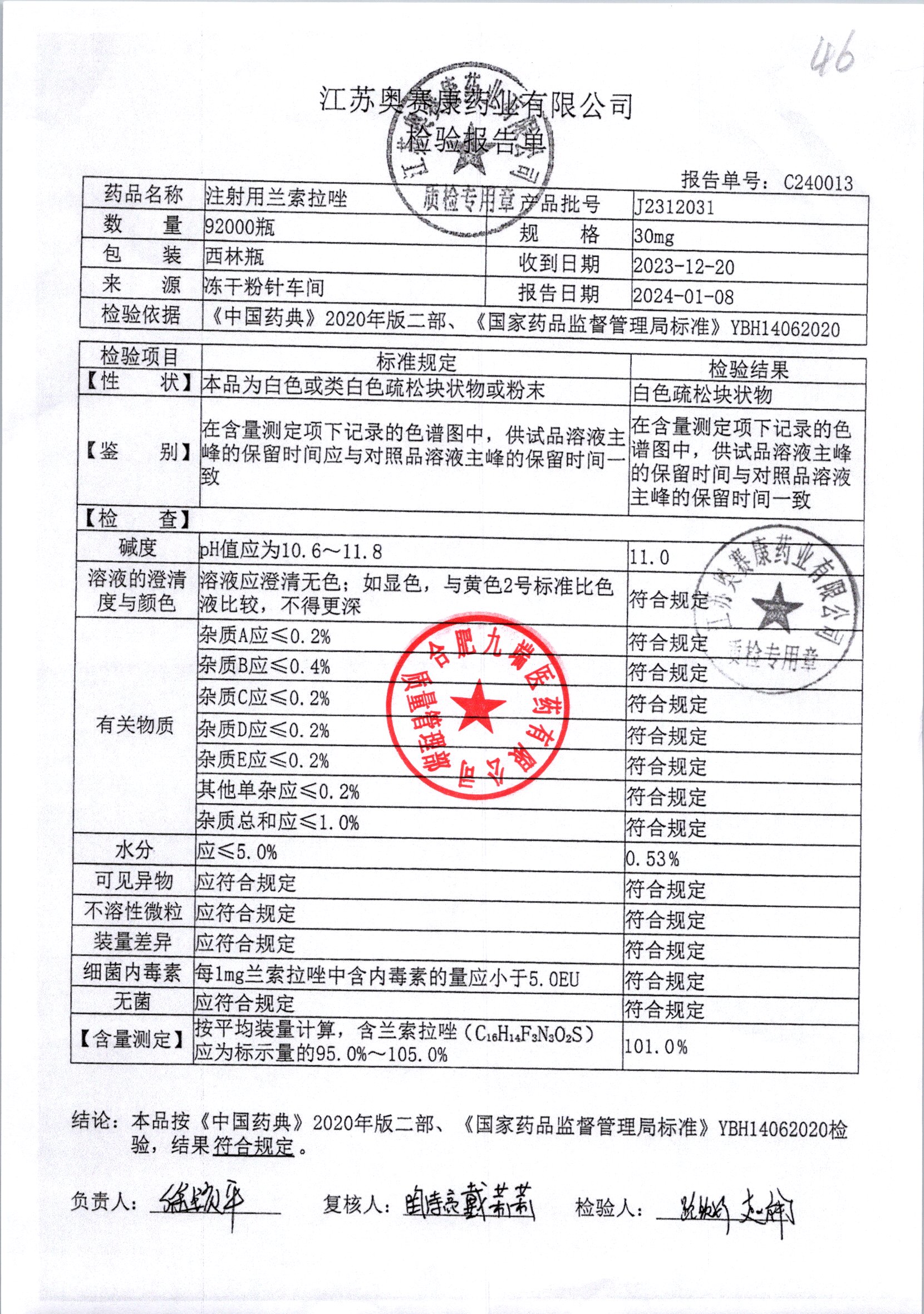 注射用兰索拉唑 | 30mg*10瓶 | J2312031 | 查看详情 |