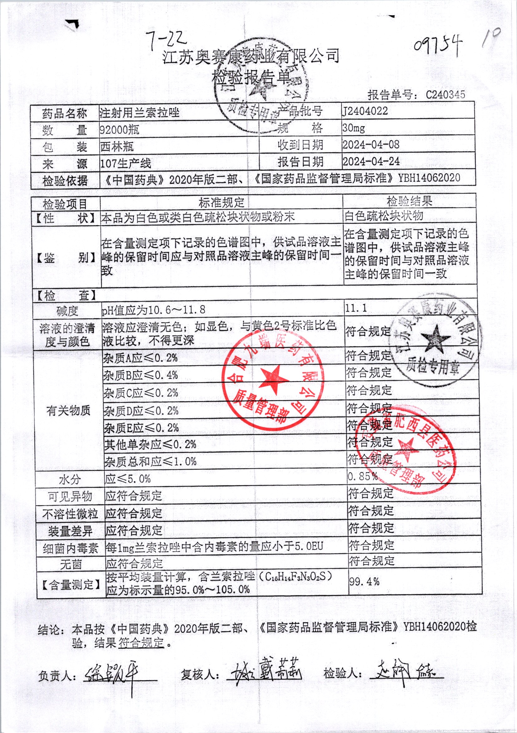 注射用兰索拉唑 | 30mg*10瓶 | J2404022 | 查看详情 |