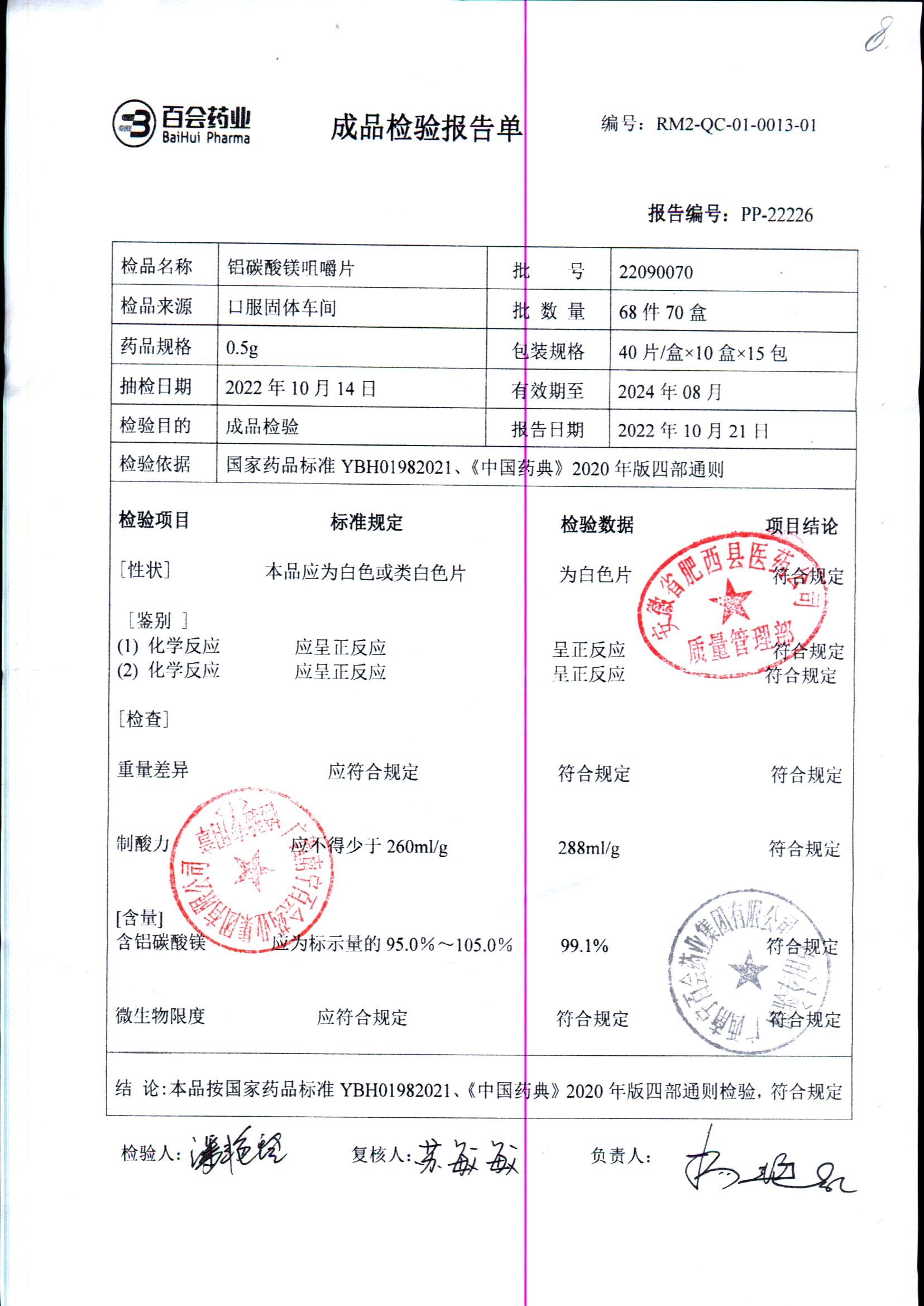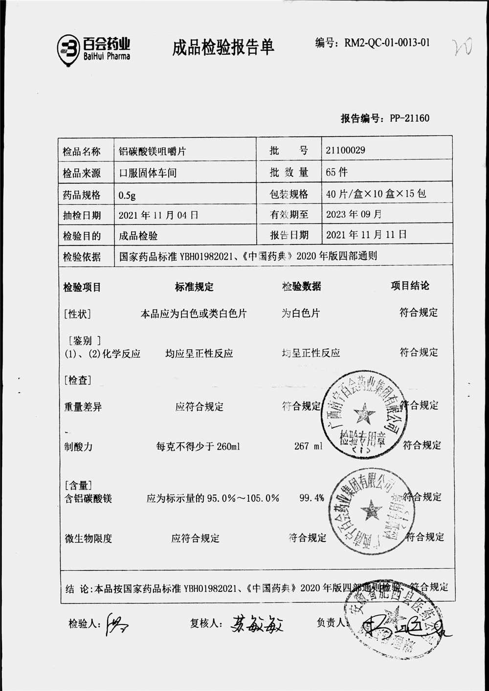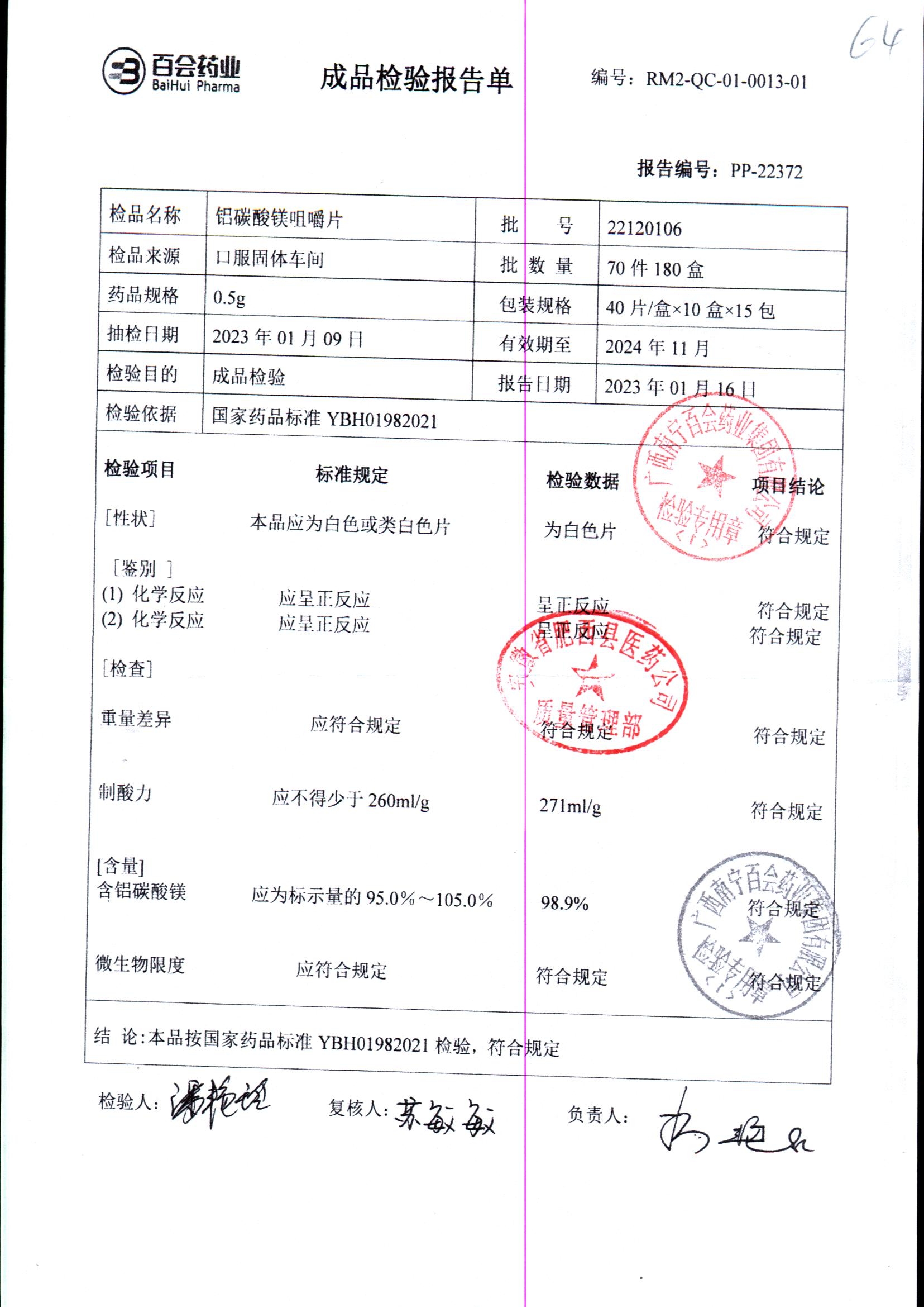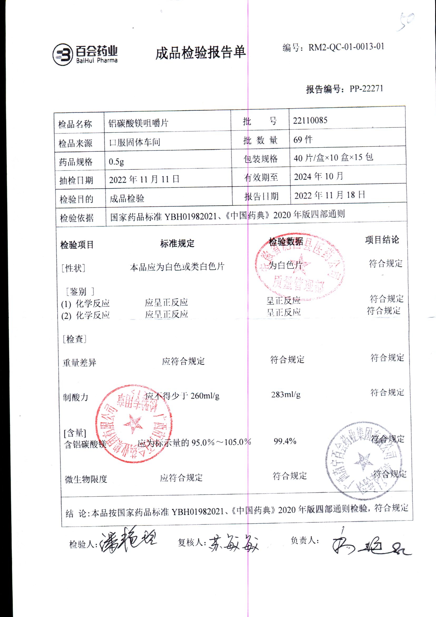 铝碳酸镁咀嚼片 | 0.5g*40片 | 22110085 | 查看详情 |