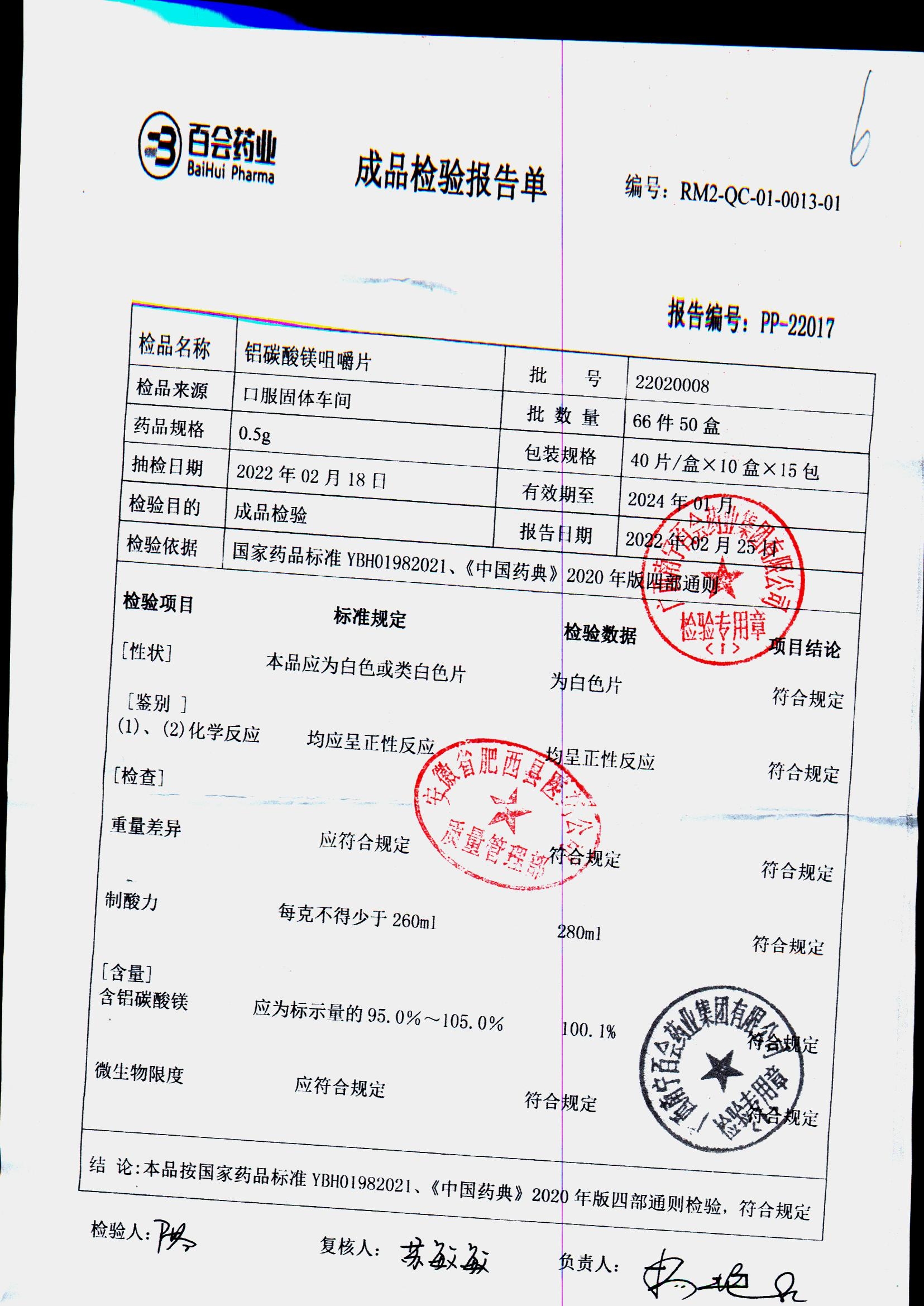 铝碳酸镁咀嚼片 | 0.5g*40片 | 22020008 | 查看详情 |