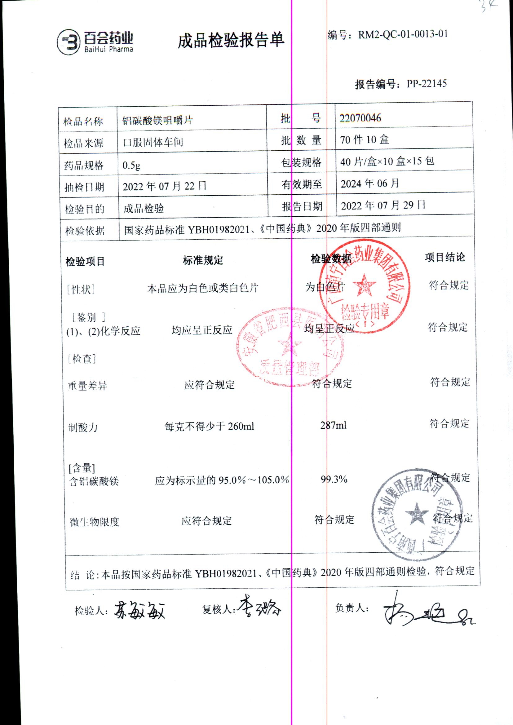 铝碳酸镁咀嚼片 | 0.5g*40片 | 22070046 | 查看详情 |