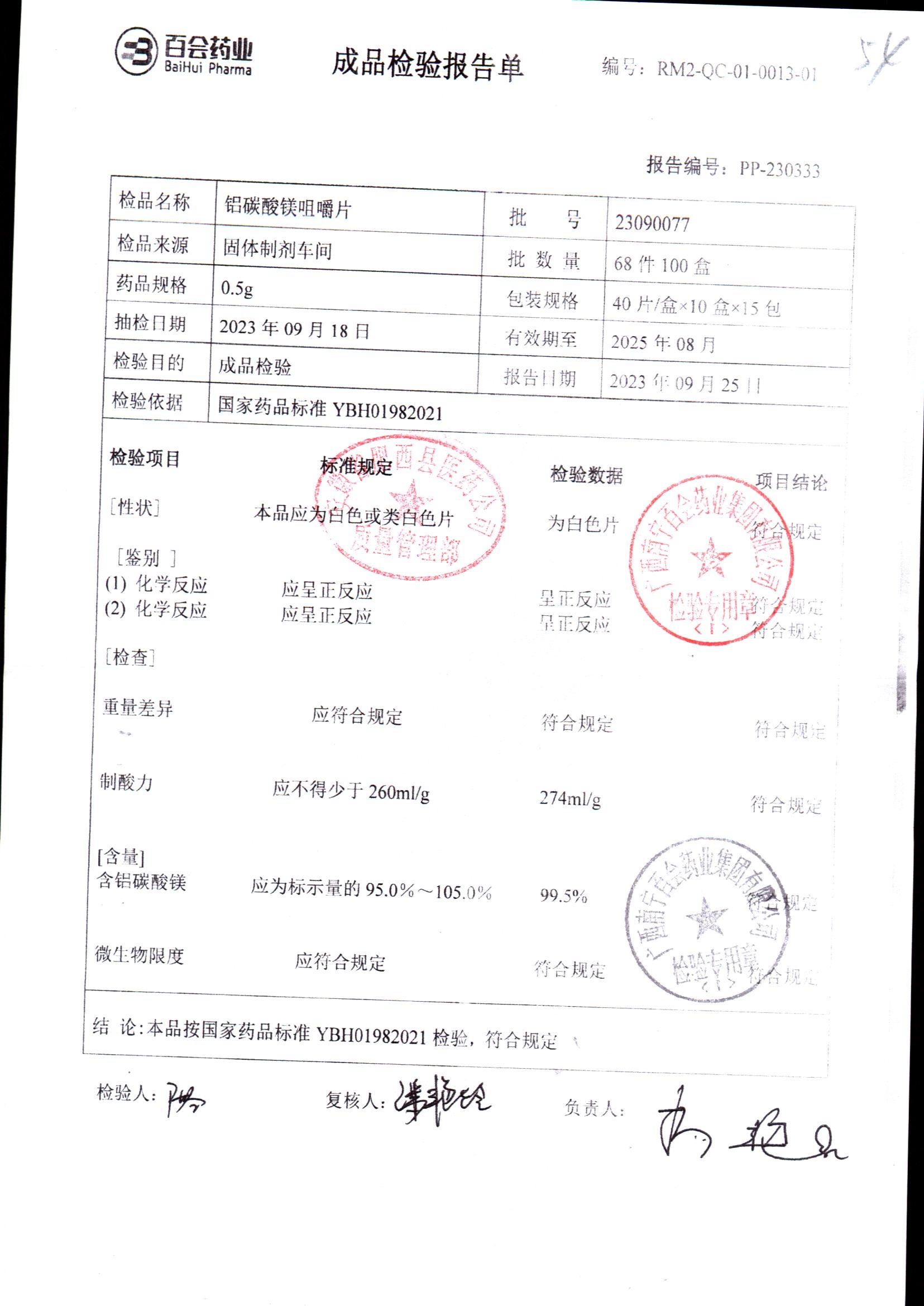 铝碳酸镁咀嚼片 | 0.5g*40片 | 23090077 | 查看详情 |