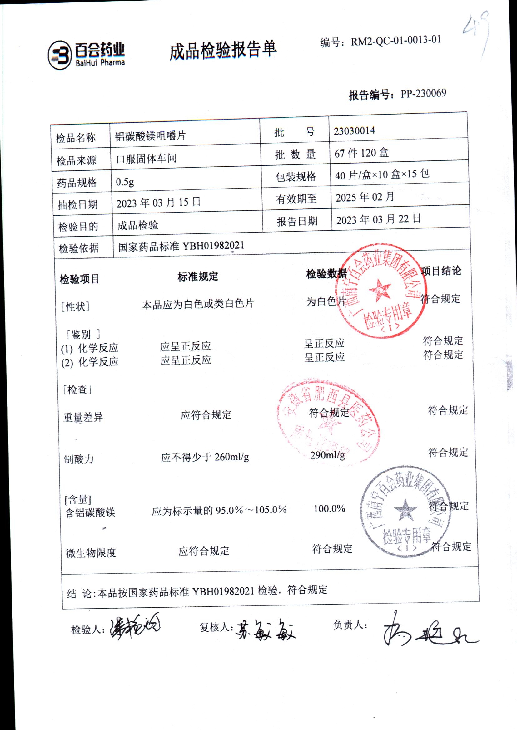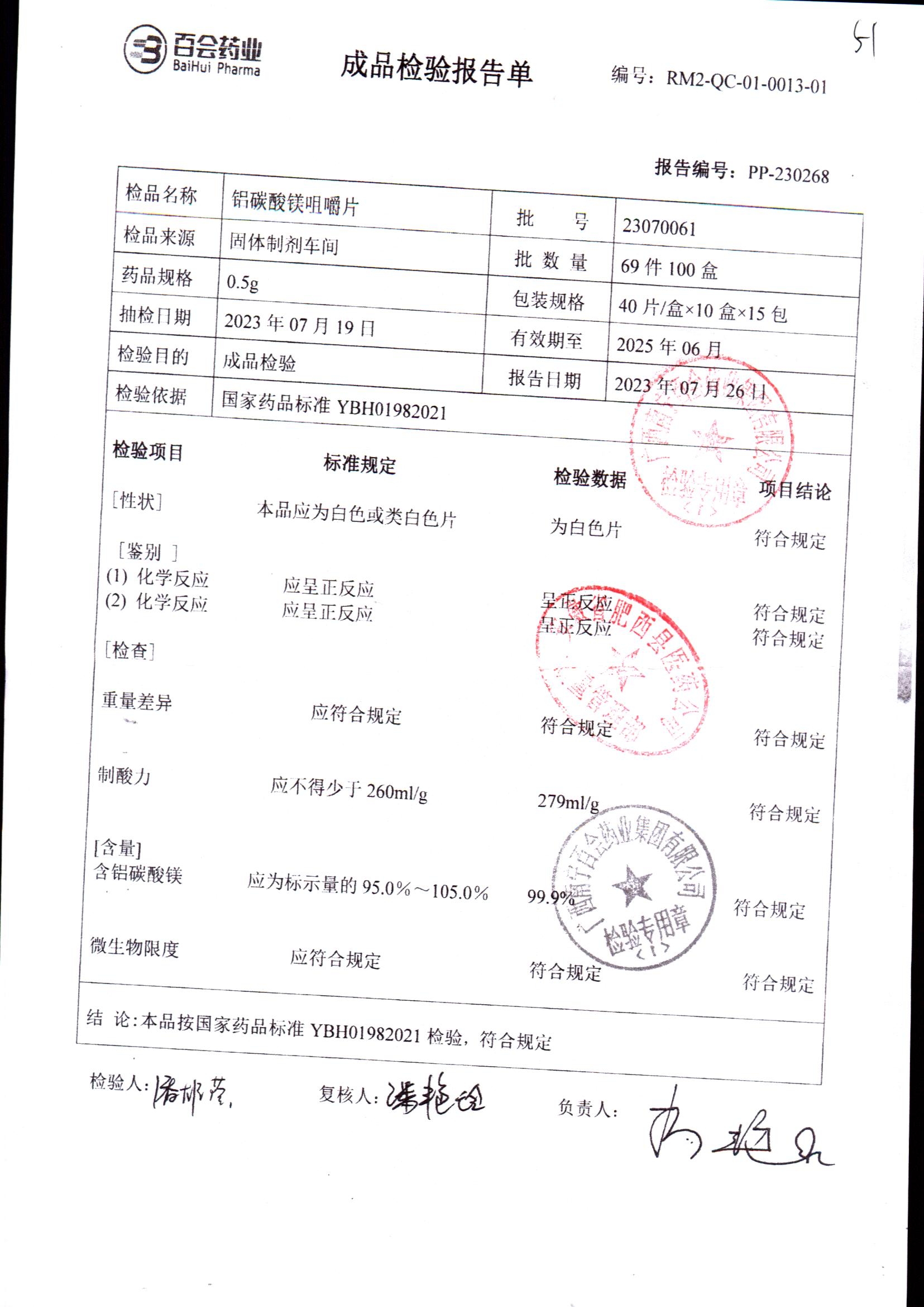铝碳酸镁咀嚼片 | 0.5g*40片 | 23070061 | 查看详情 |