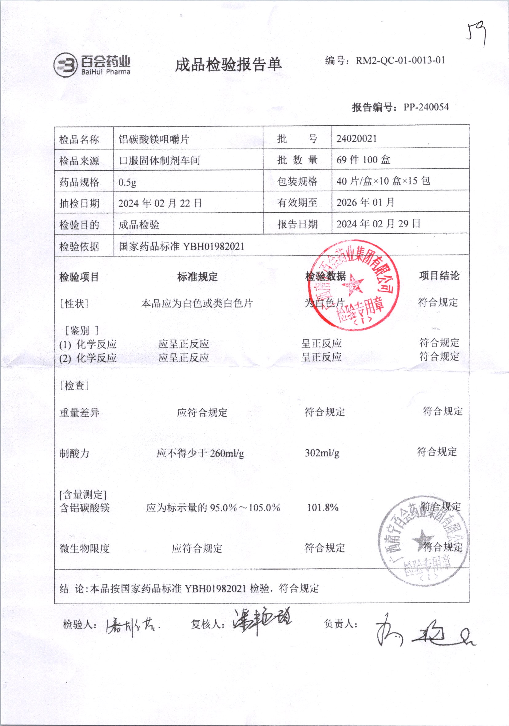 铝碳酸镁咀嚼片 | 0.5g*40片 | 24020020 | 查看详情 |