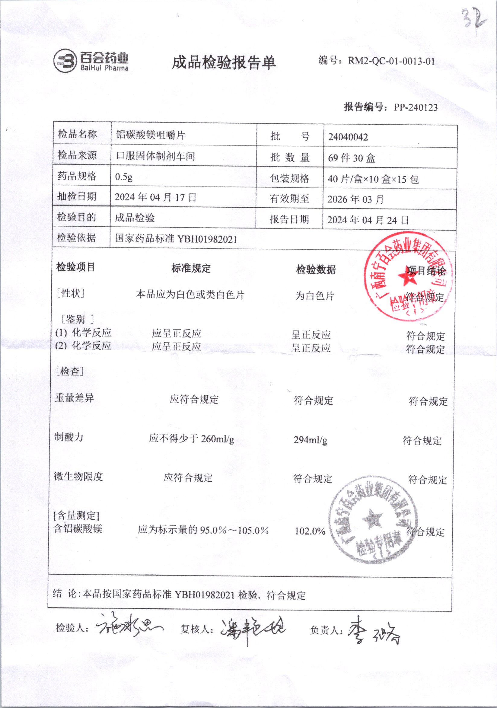 铝碳酸镁咀嚼片 | 0.5g*40片 | 24040042 | 查看详情 |