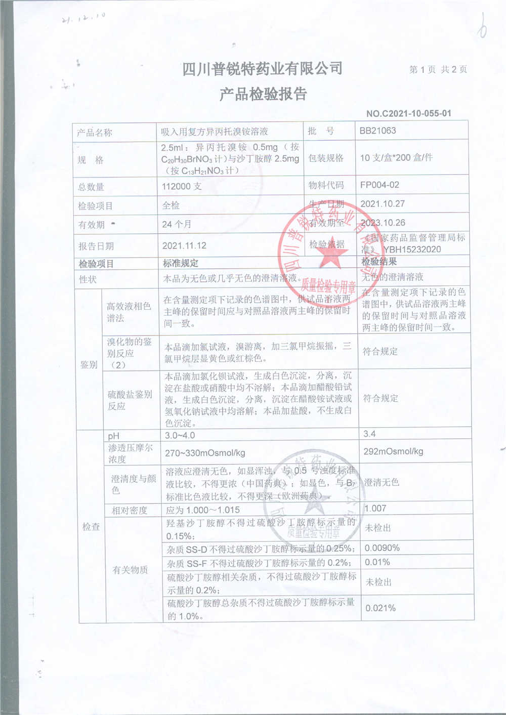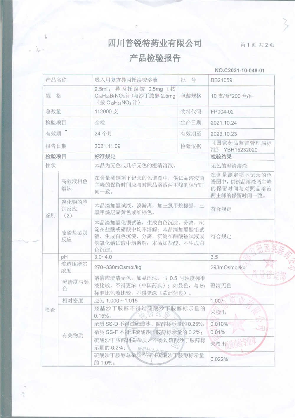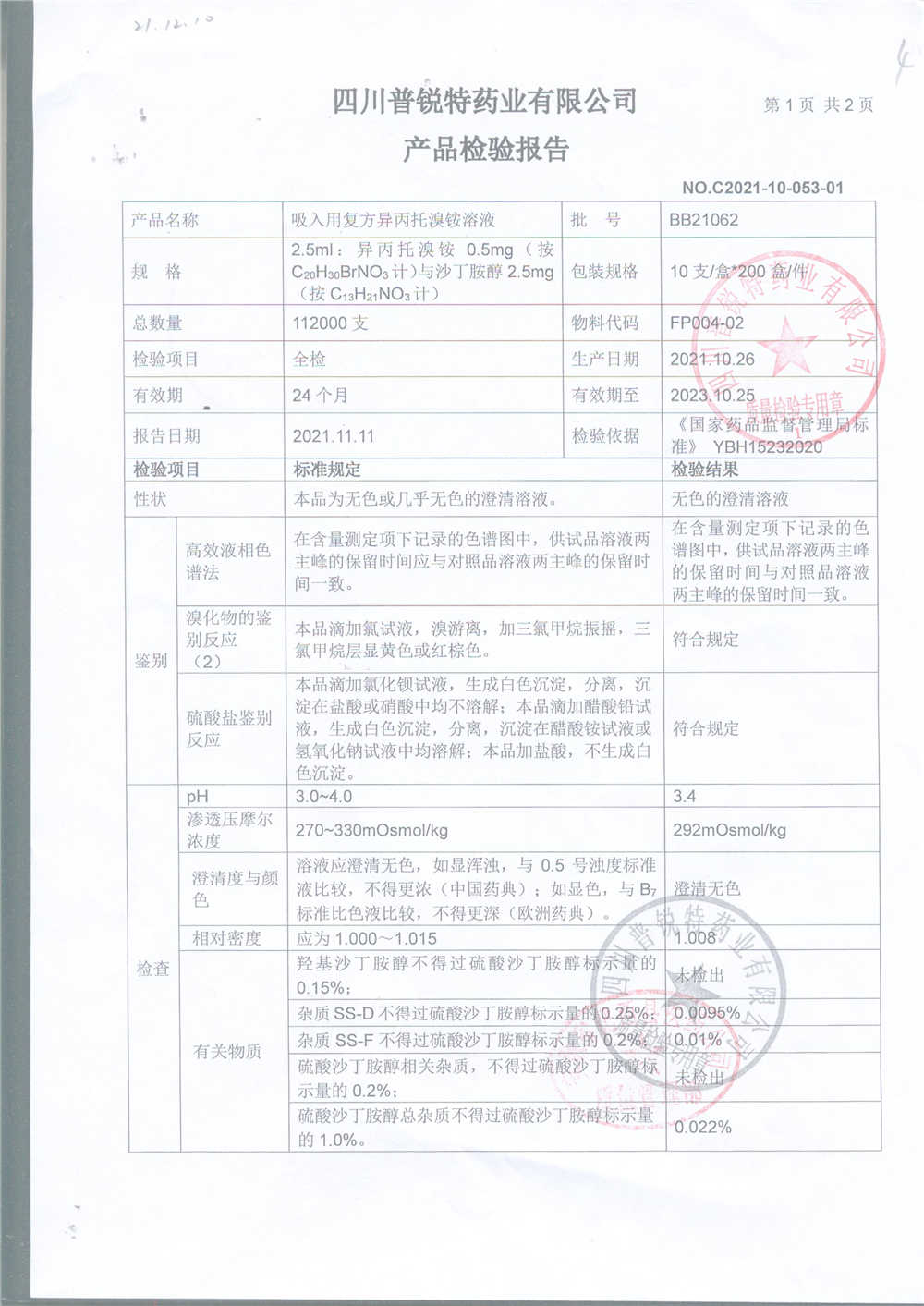 吸入用复方异丙托溴铵溶液 | 2.5ml*10支(异丙托溴铵0.5mg与沙丁胺醇2.5mg) | BB21061(1/2) | 查看详情 |