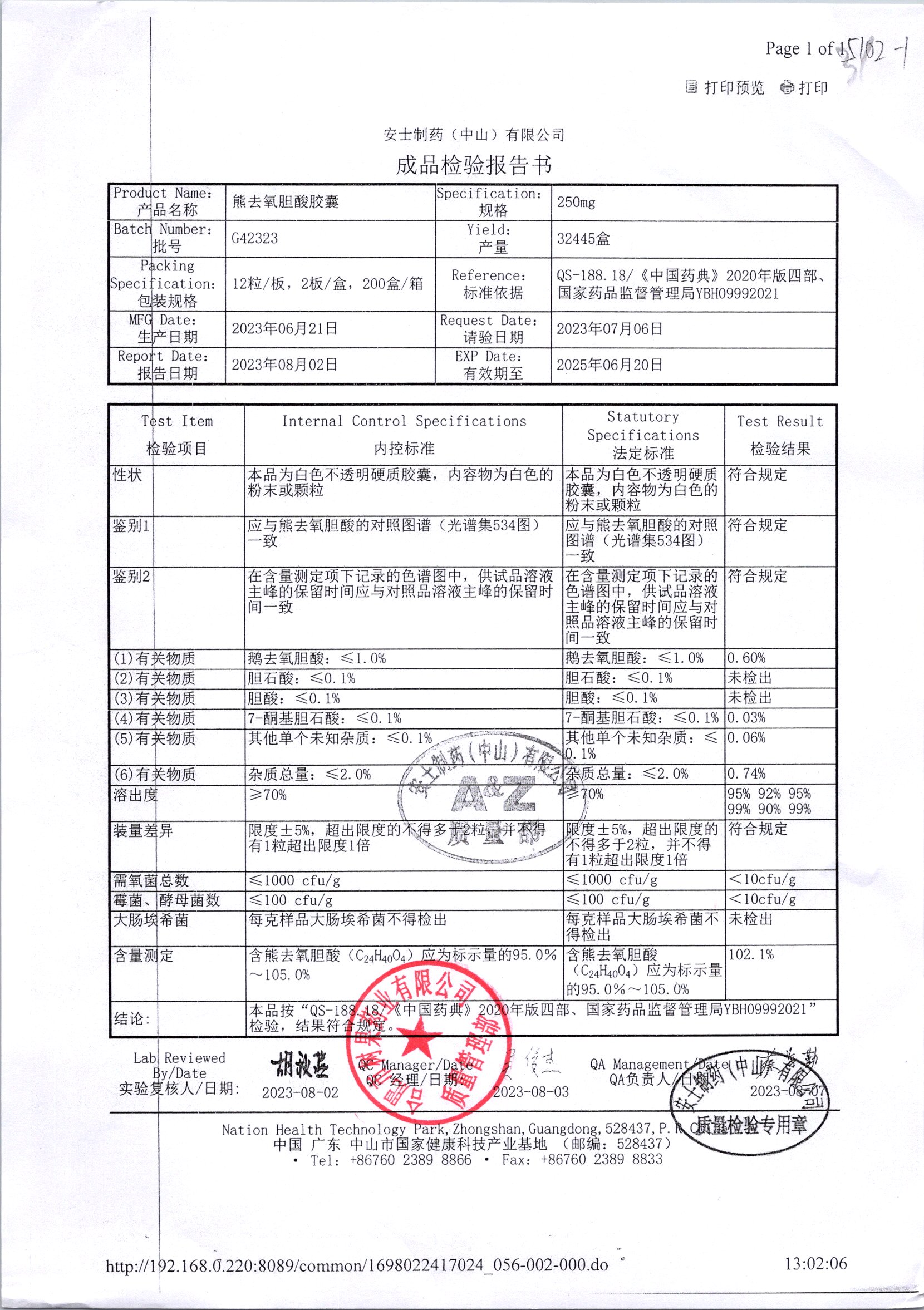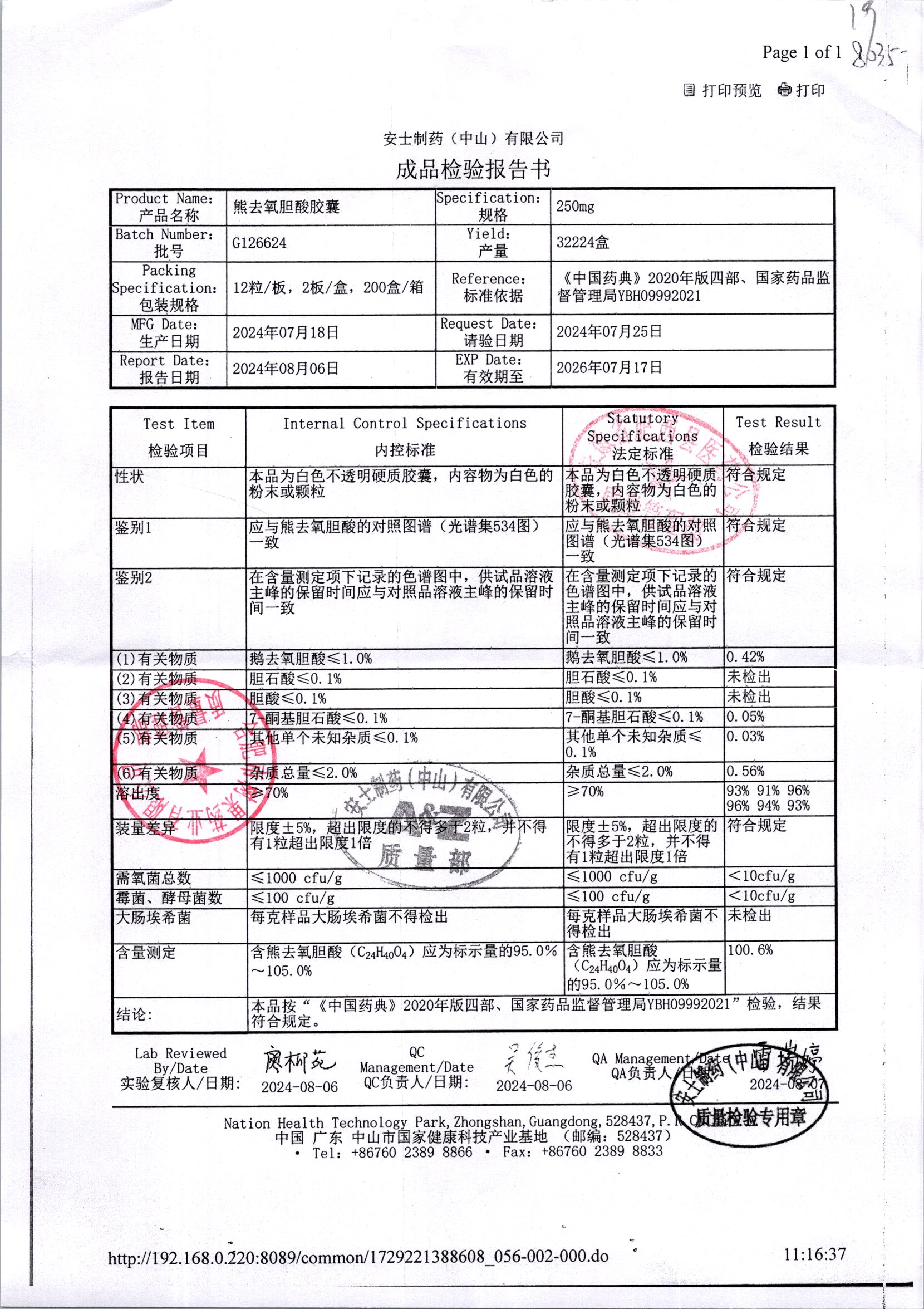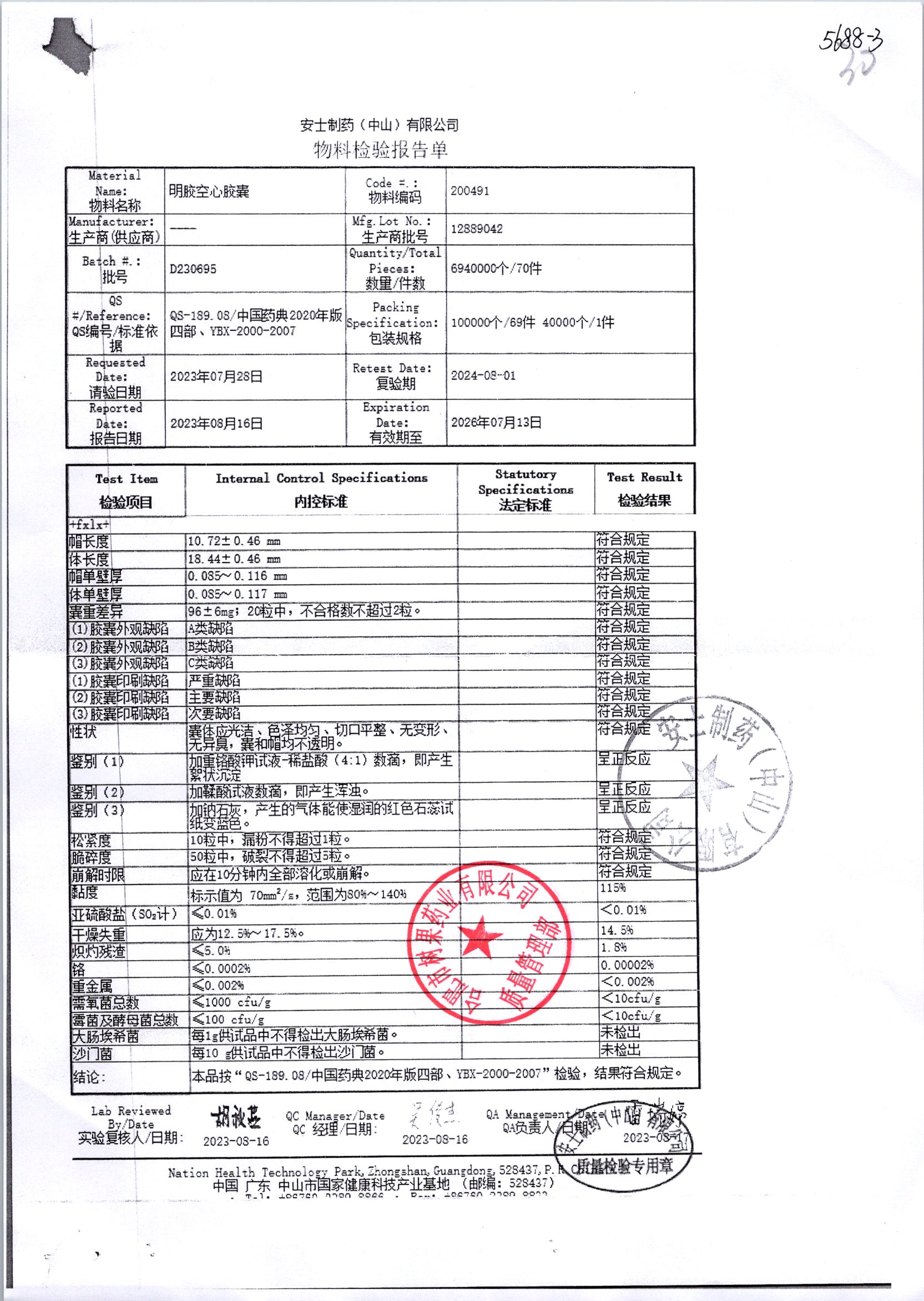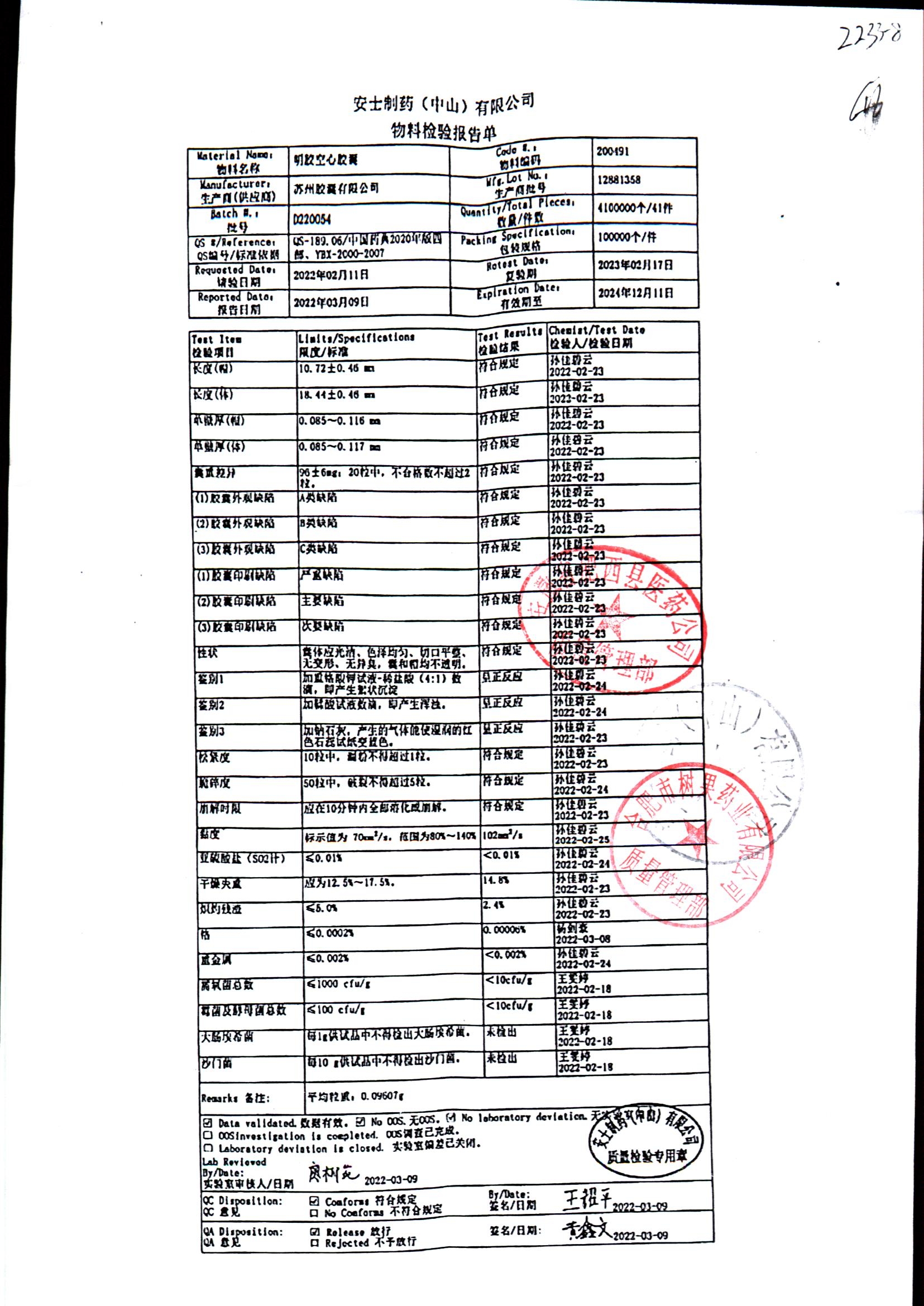 名称 | 规格 | 批号 | 药检报告 |