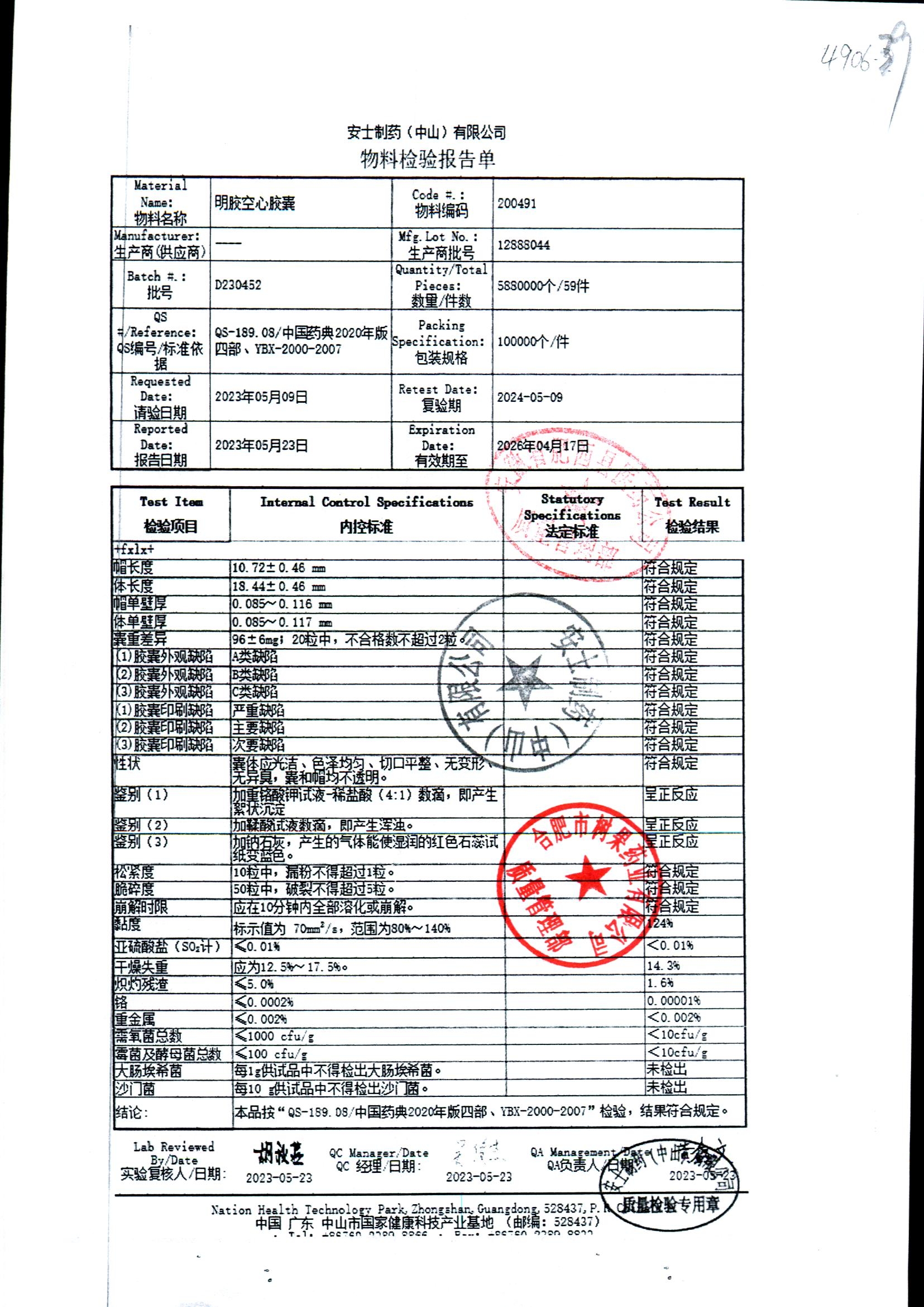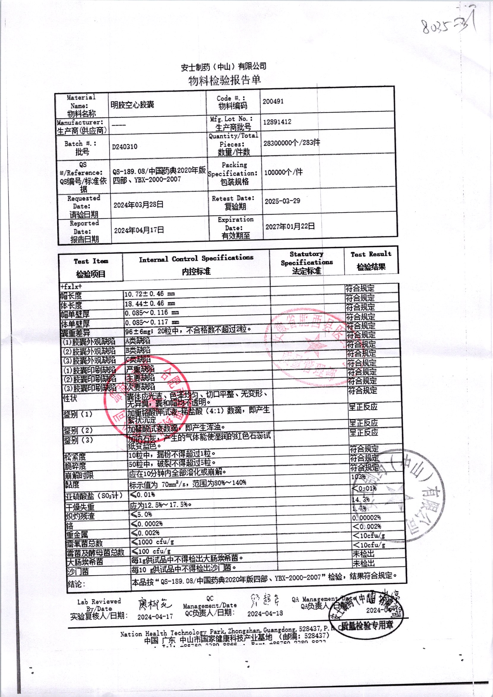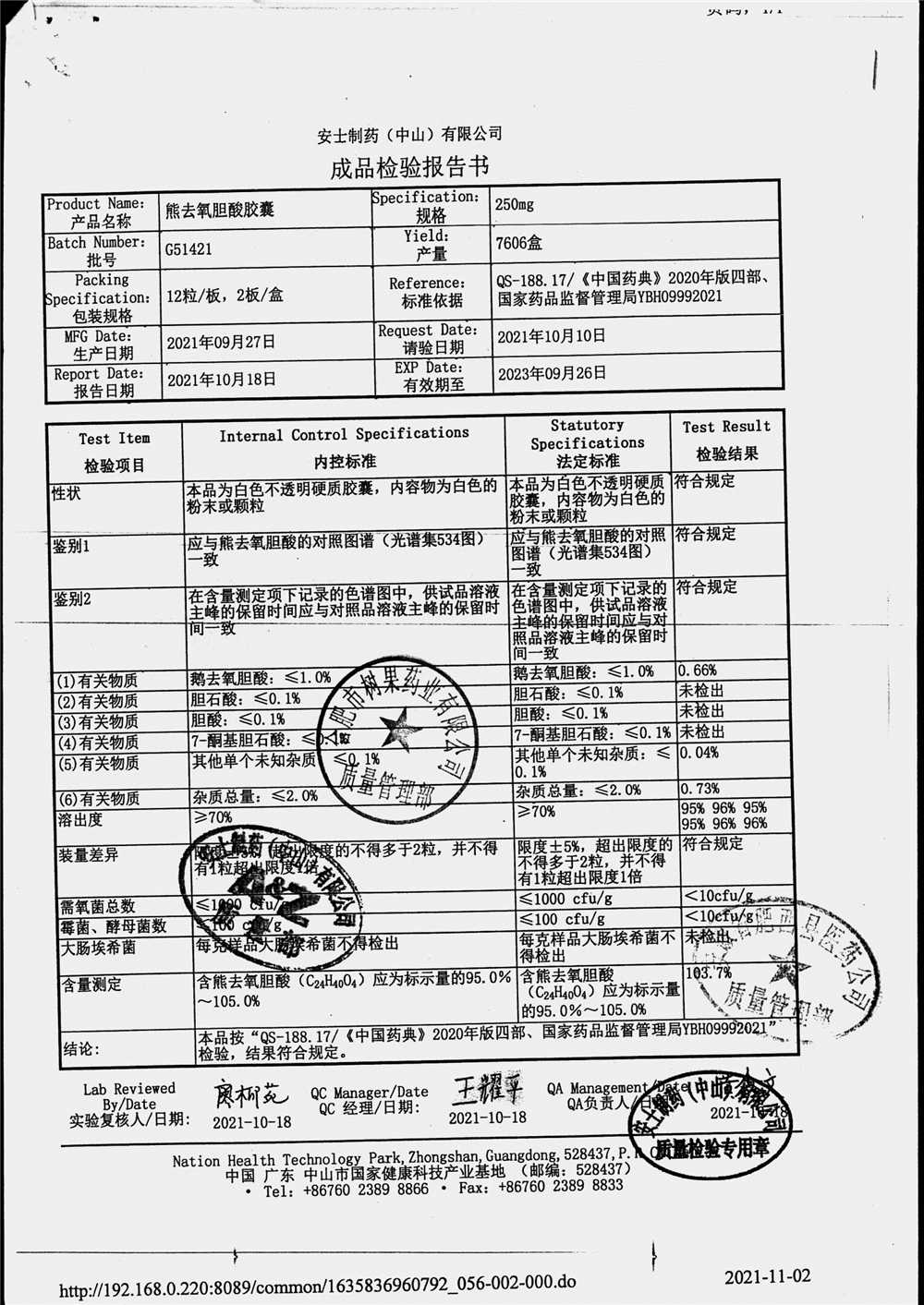 名称 | 规格 | 批号 | 药检报告 |