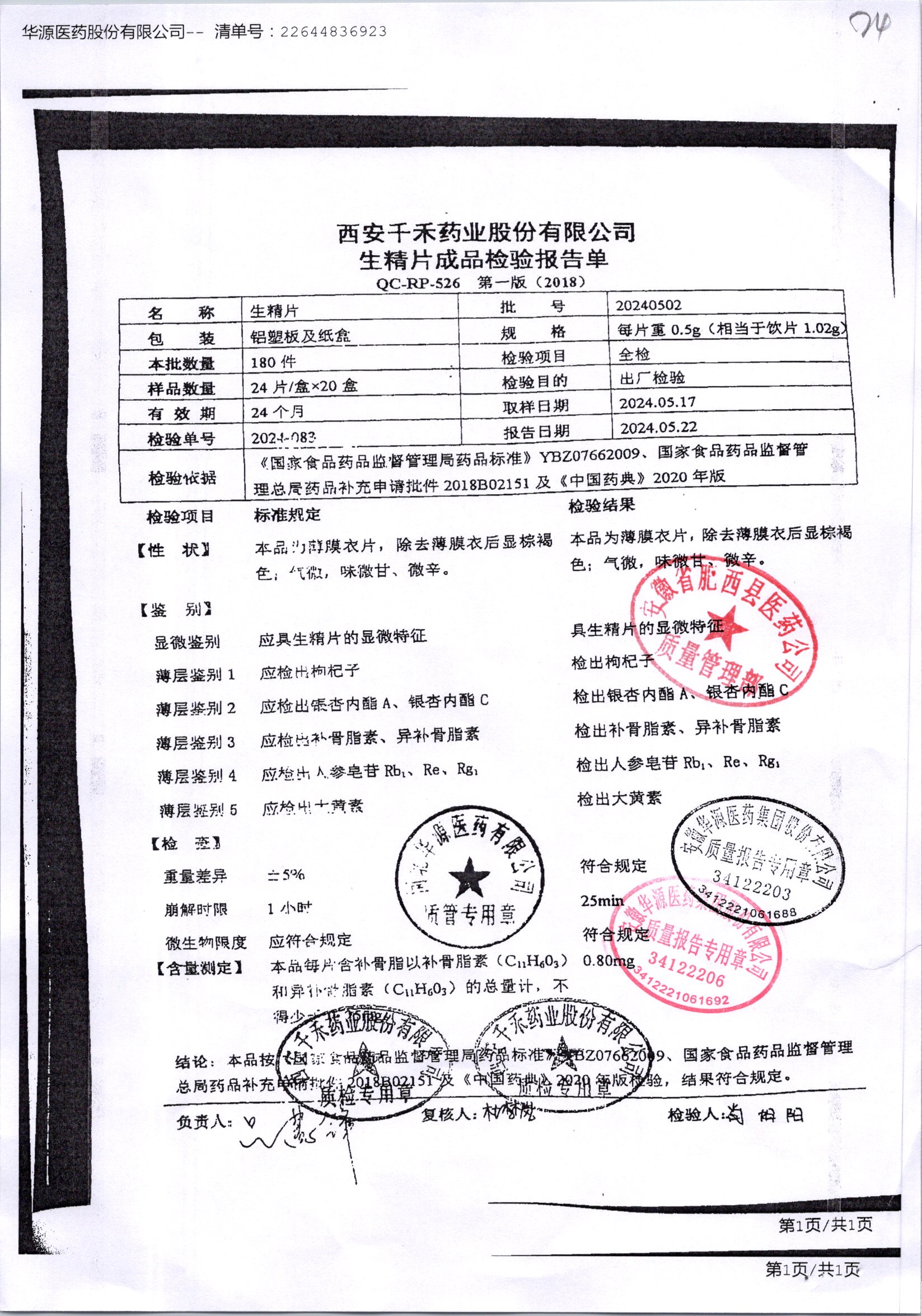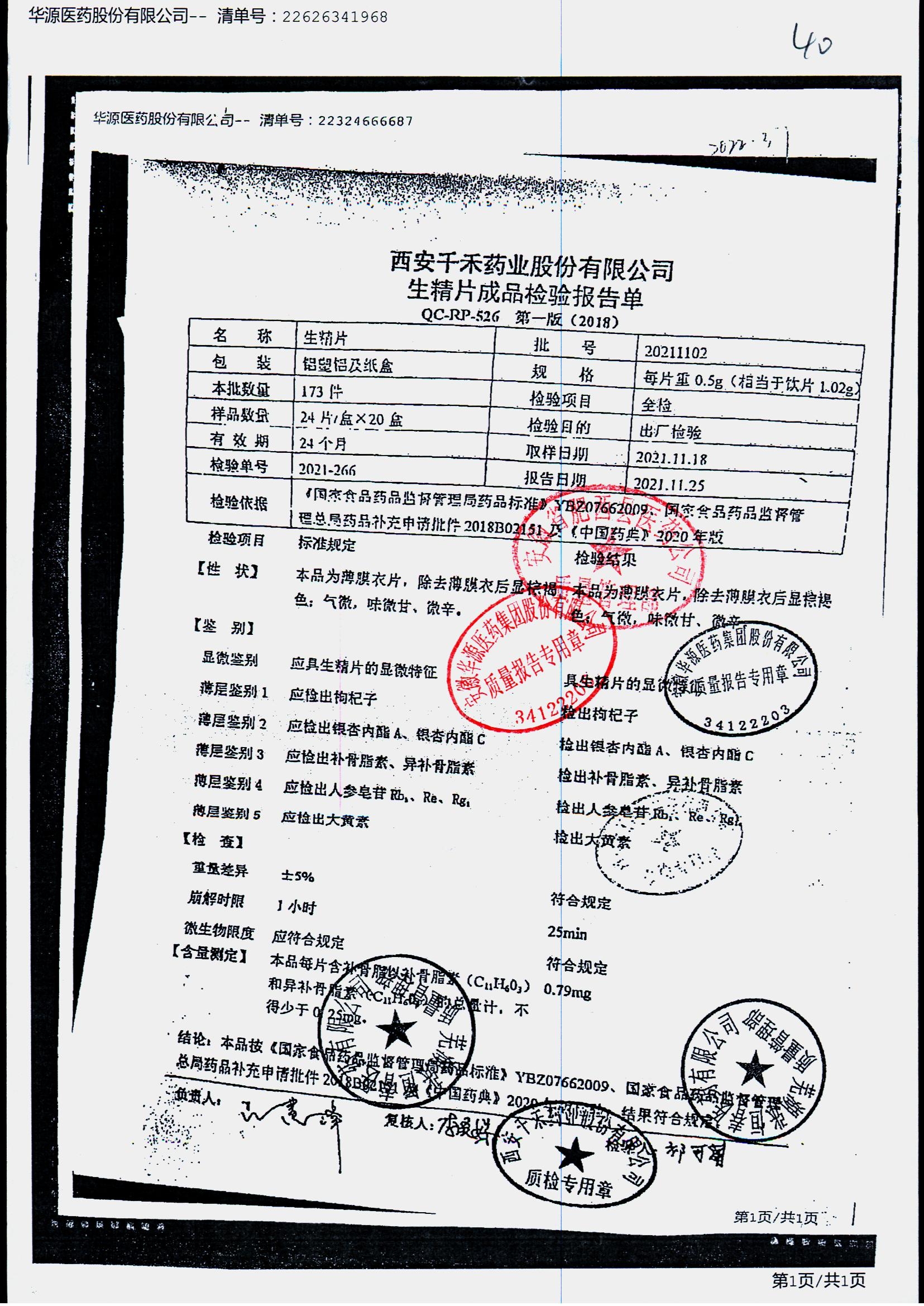 生精片 | 0.5g*2*12片 | 20240502 | 查看详情 |
