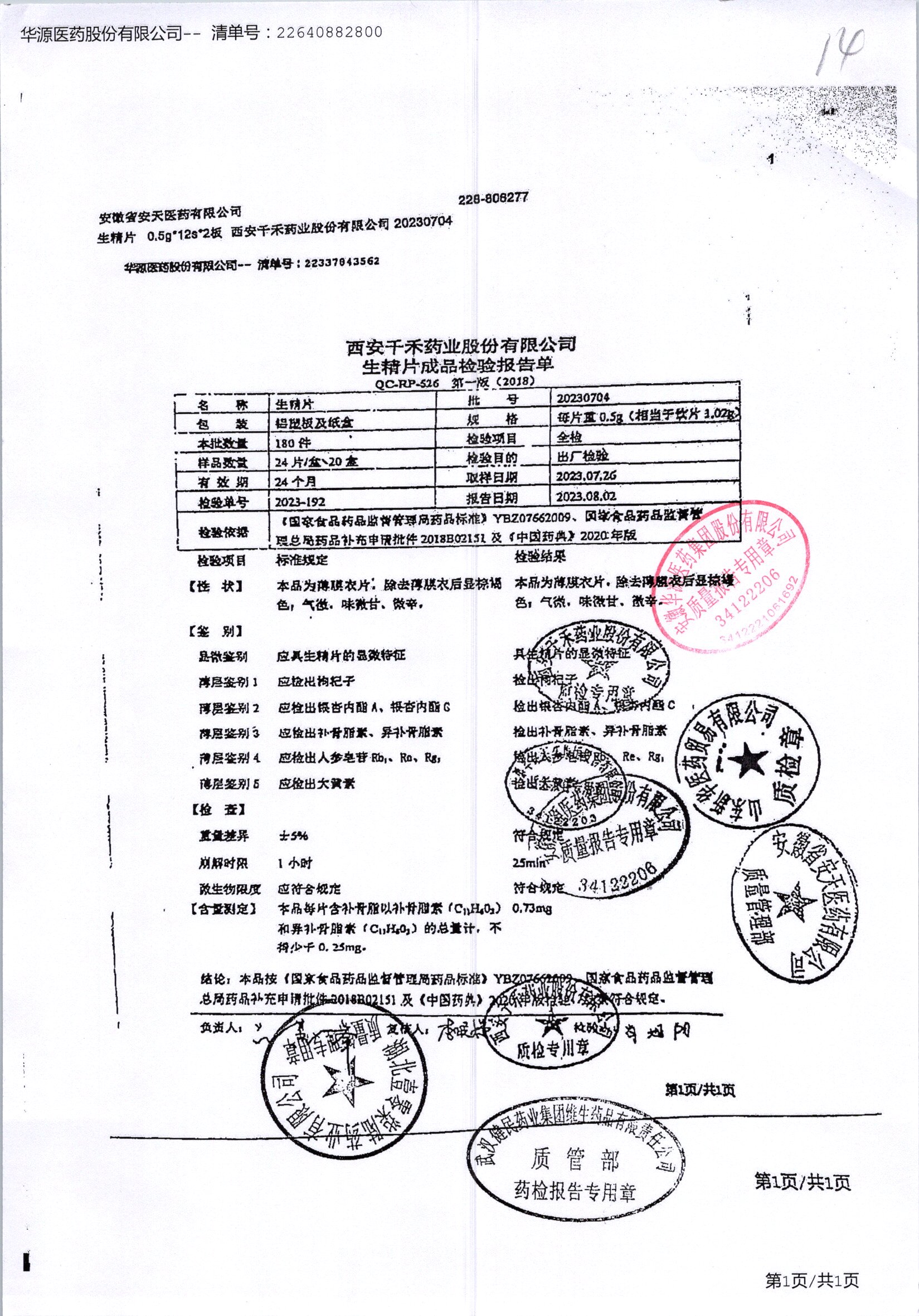 生精片 | 0.5g*2*12片 | 20230704 | 查看详情 |