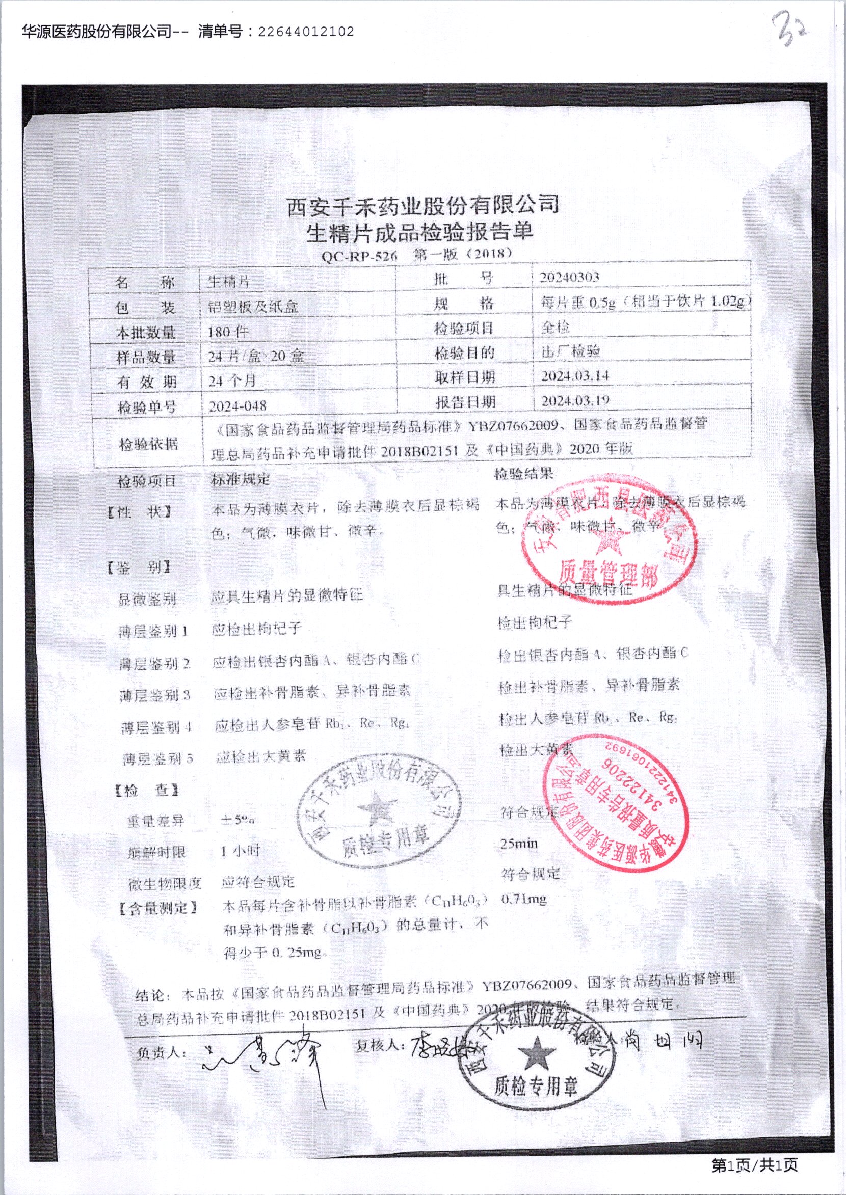 生精片 | 0.5g*2*12片 | 20240303 | 查看详情 |