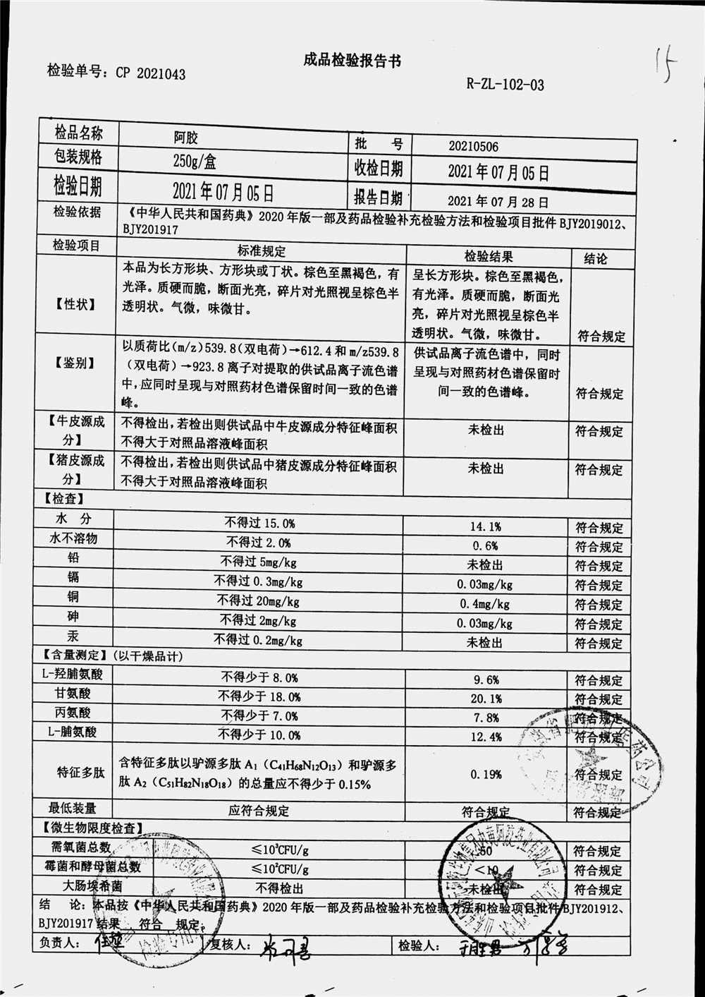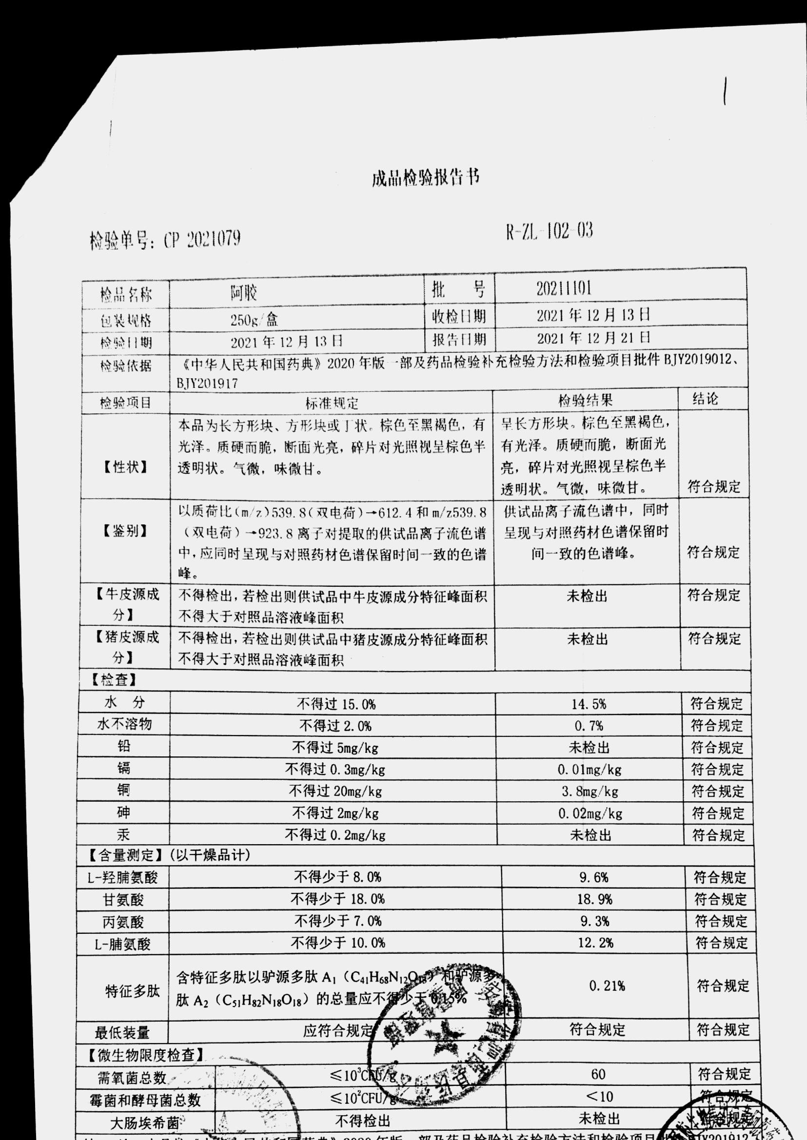 阿胶 | 250g(31.25g*4块*2板) | 20211101 | 查看详情 |