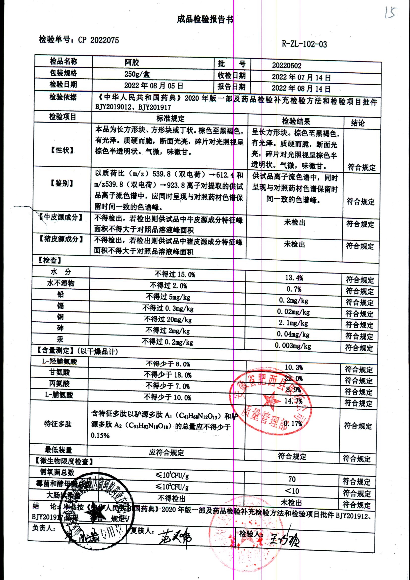 阿胶 | 250g(31.25g*4块*2板) | 20220502 | 查看详情 |