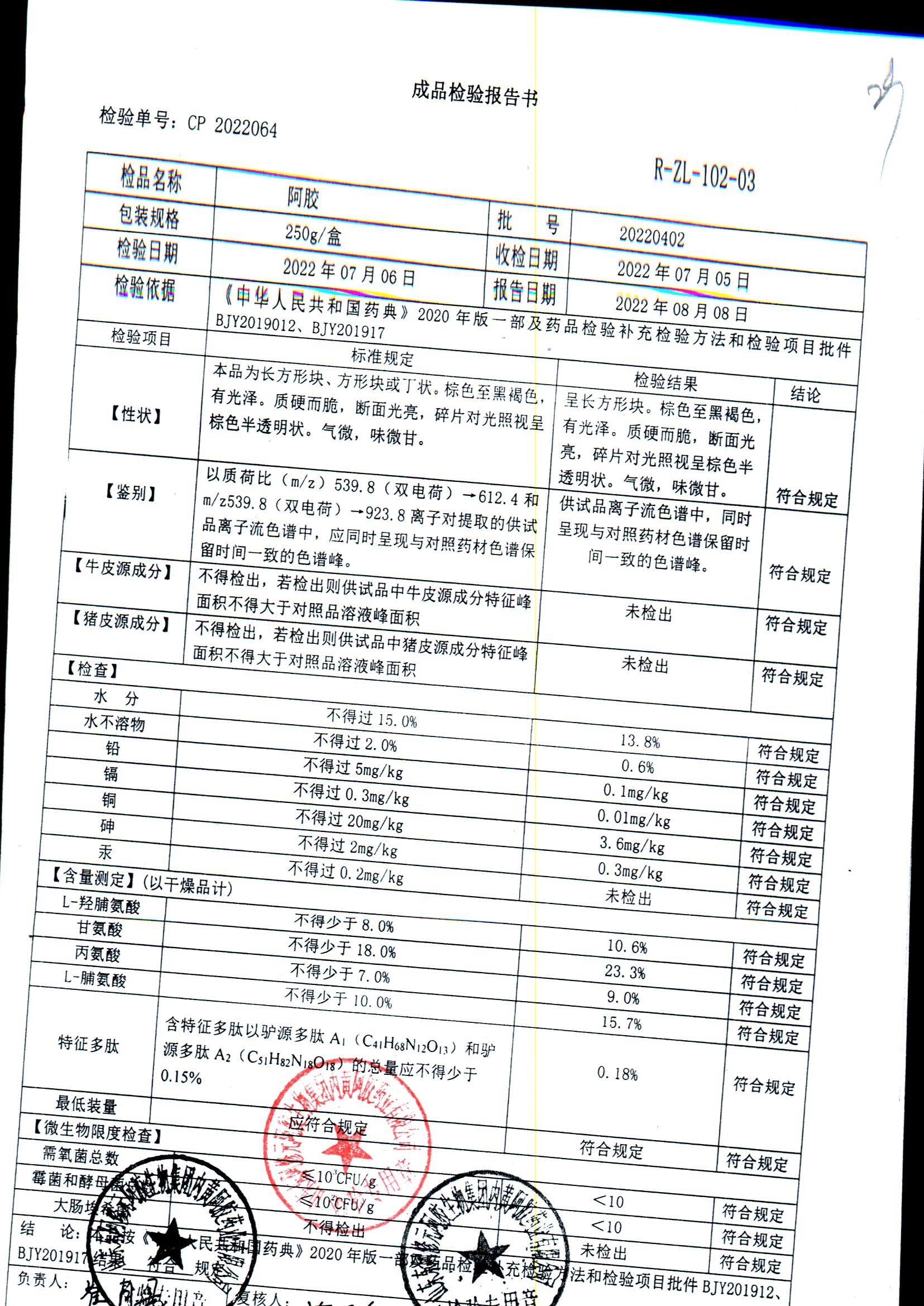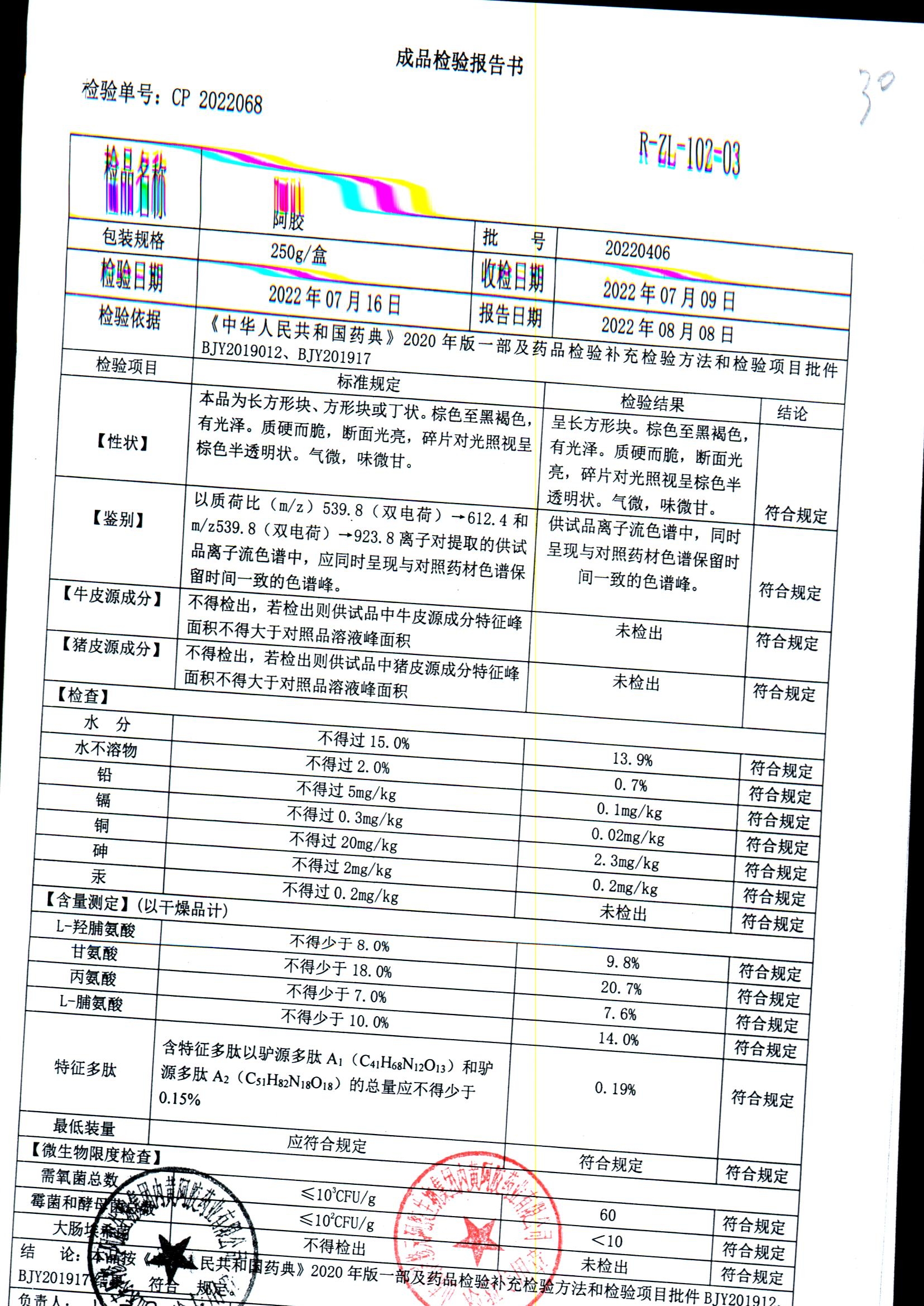 阿胶 | 250g(31.25g*4块*2板) | 20220406 | 查看详情 |