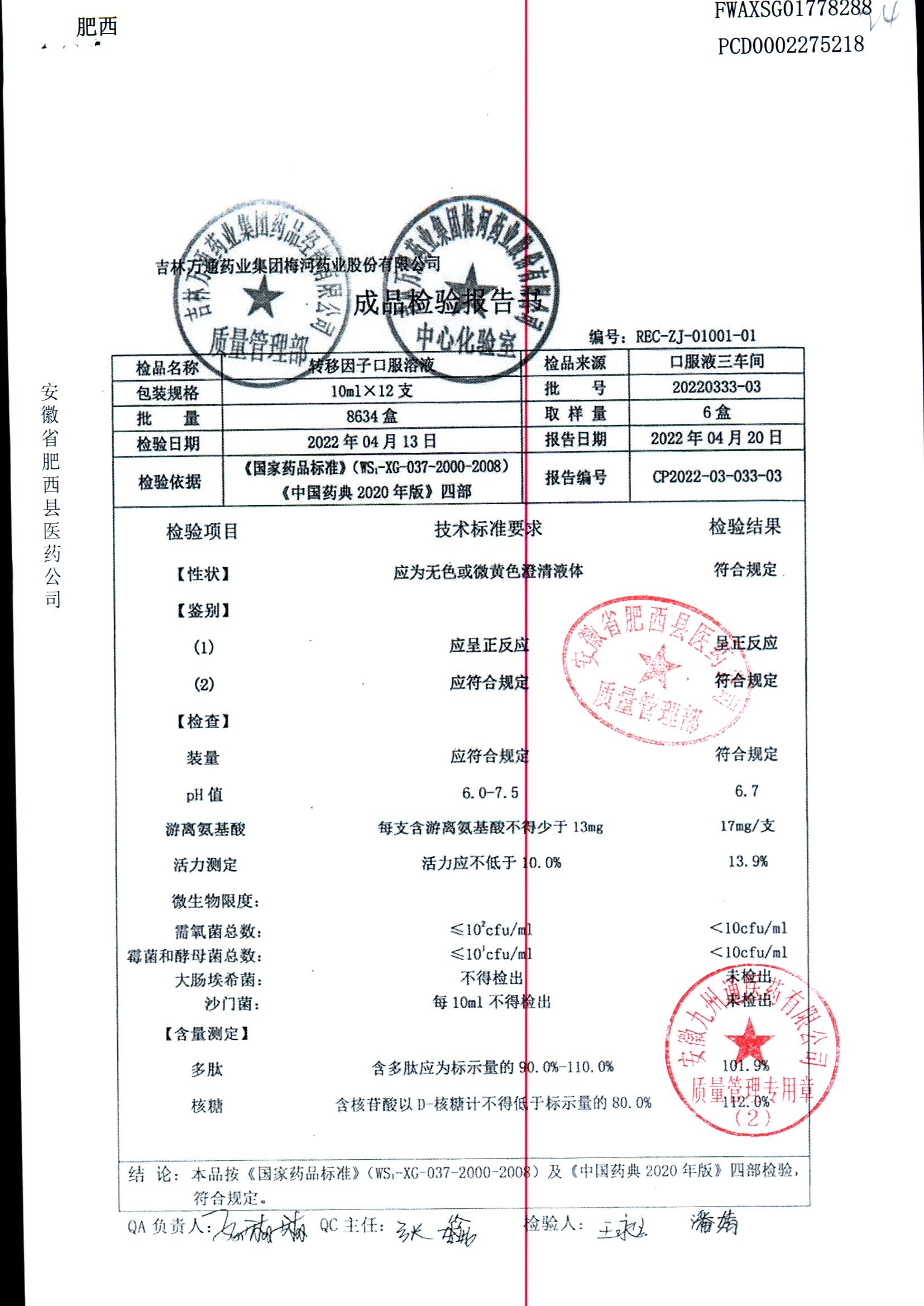 转移因子口服溶液 | 10ml:10mg(多肽):300μg(核糖)*12支 | 20221239-03 | 查看详情 |