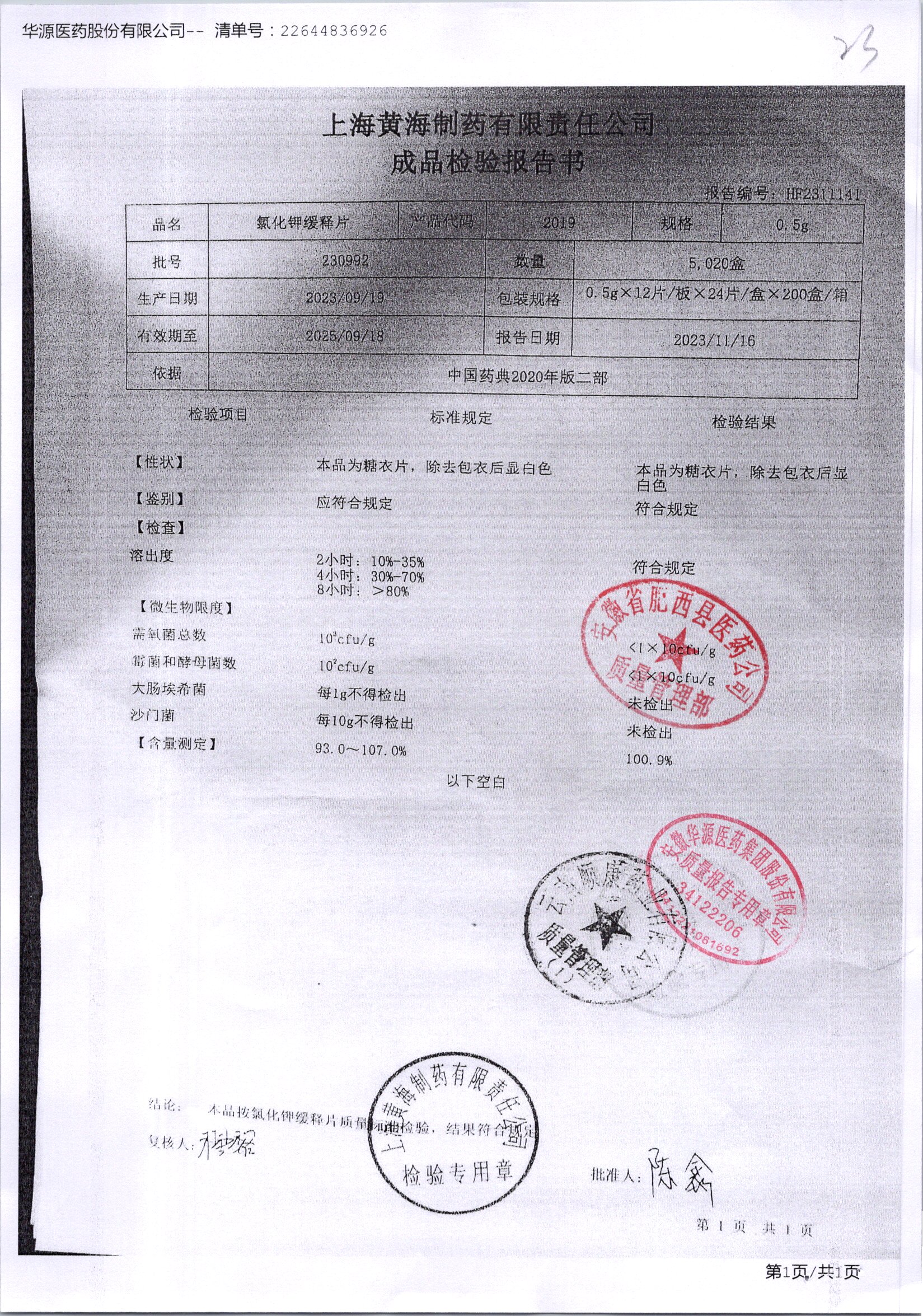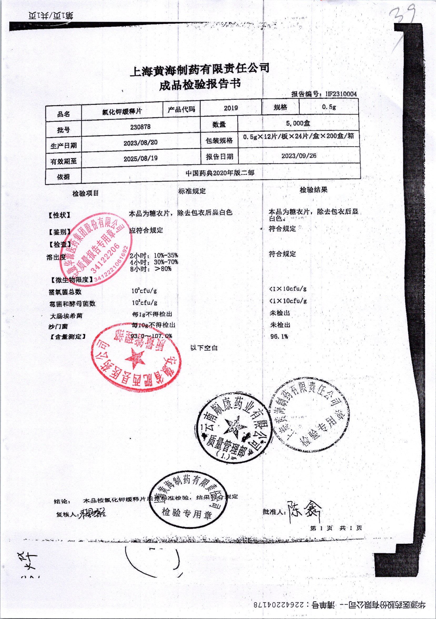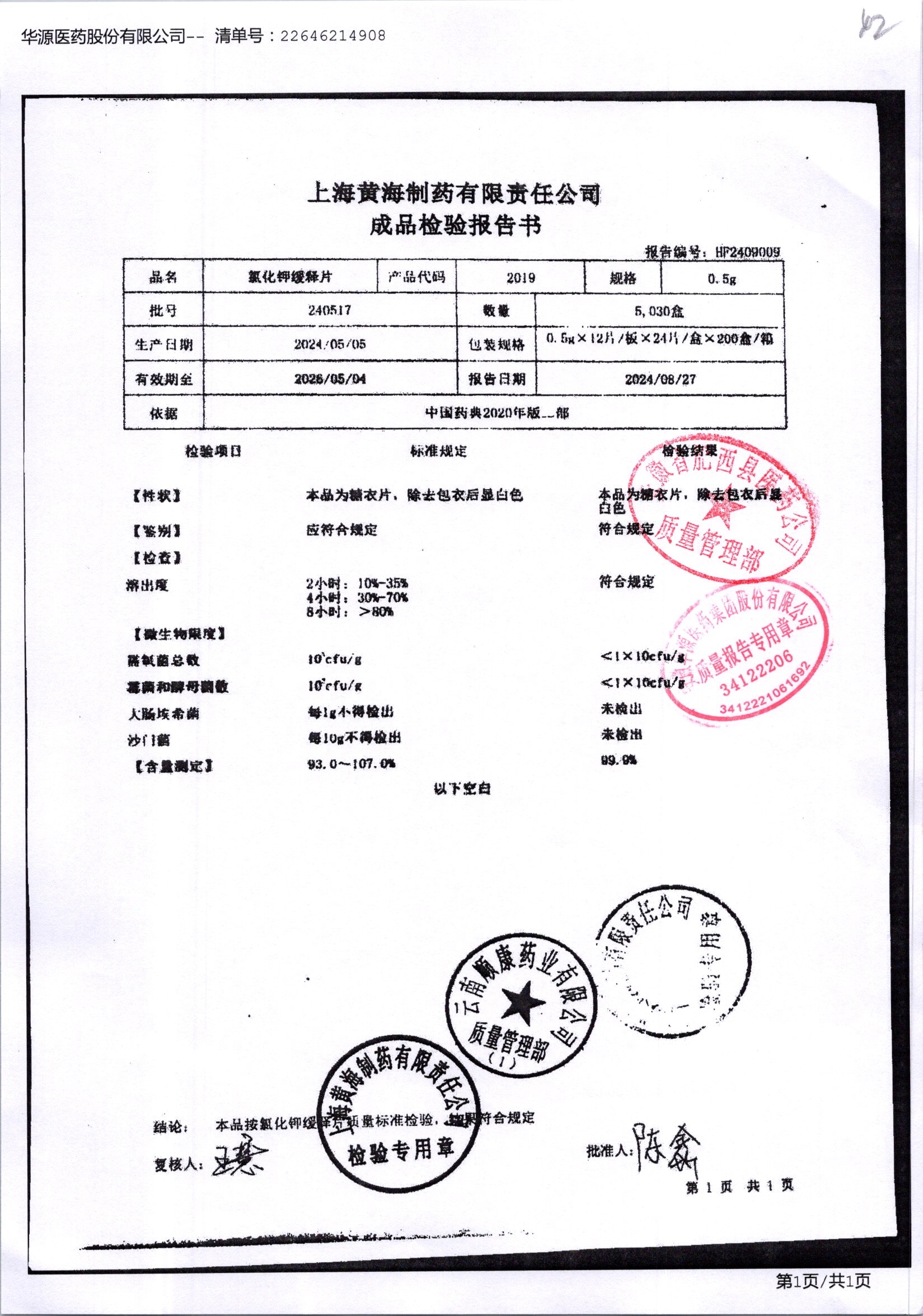 氯化钾缓释片 | 0.5gx12片/板x24片 | 240926 | 查看详情 |