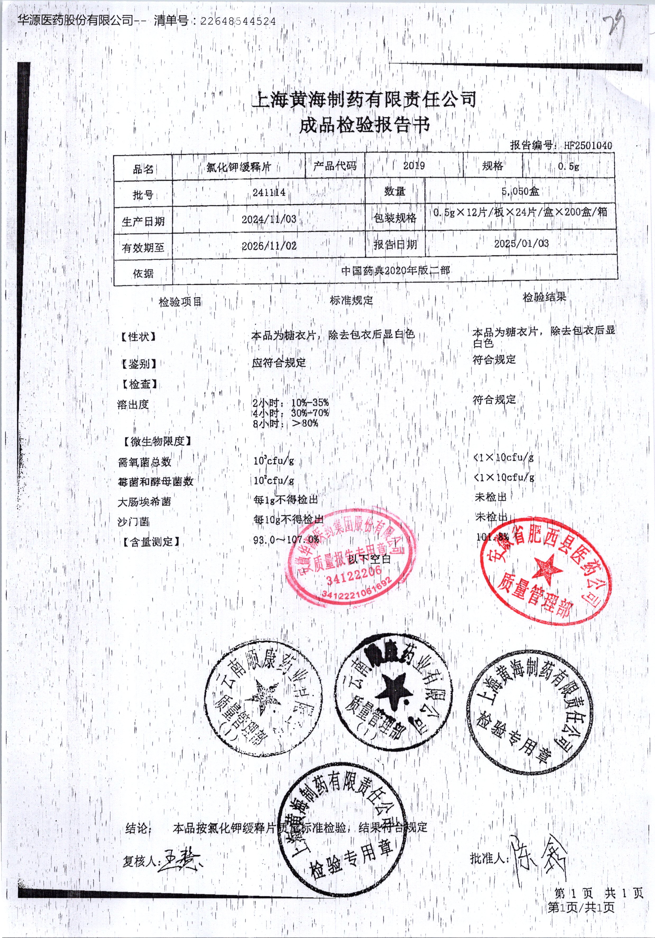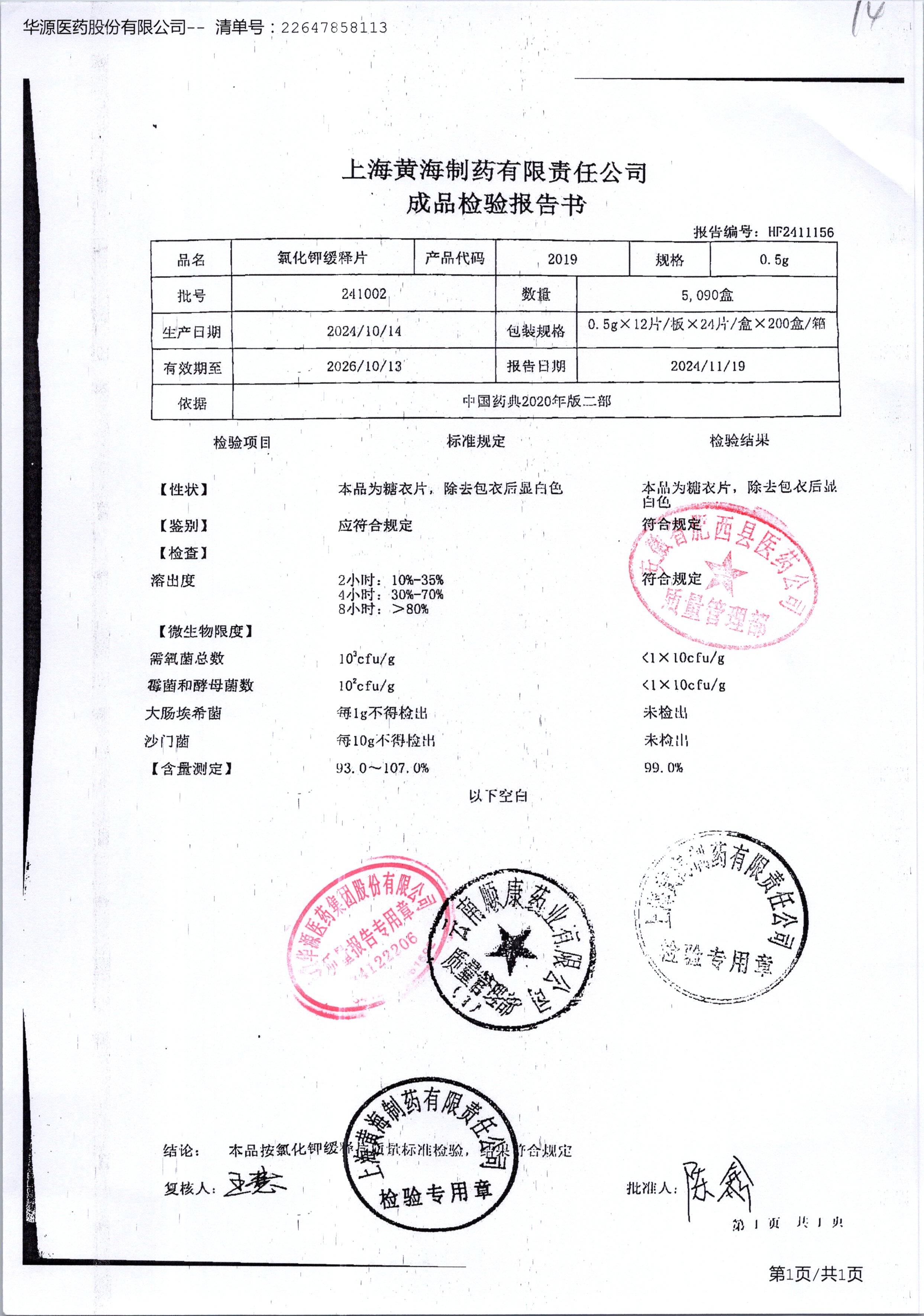 氯化钾缓释片 | 0.5gx12片/板x24片 | 241114 | 查看详情 |