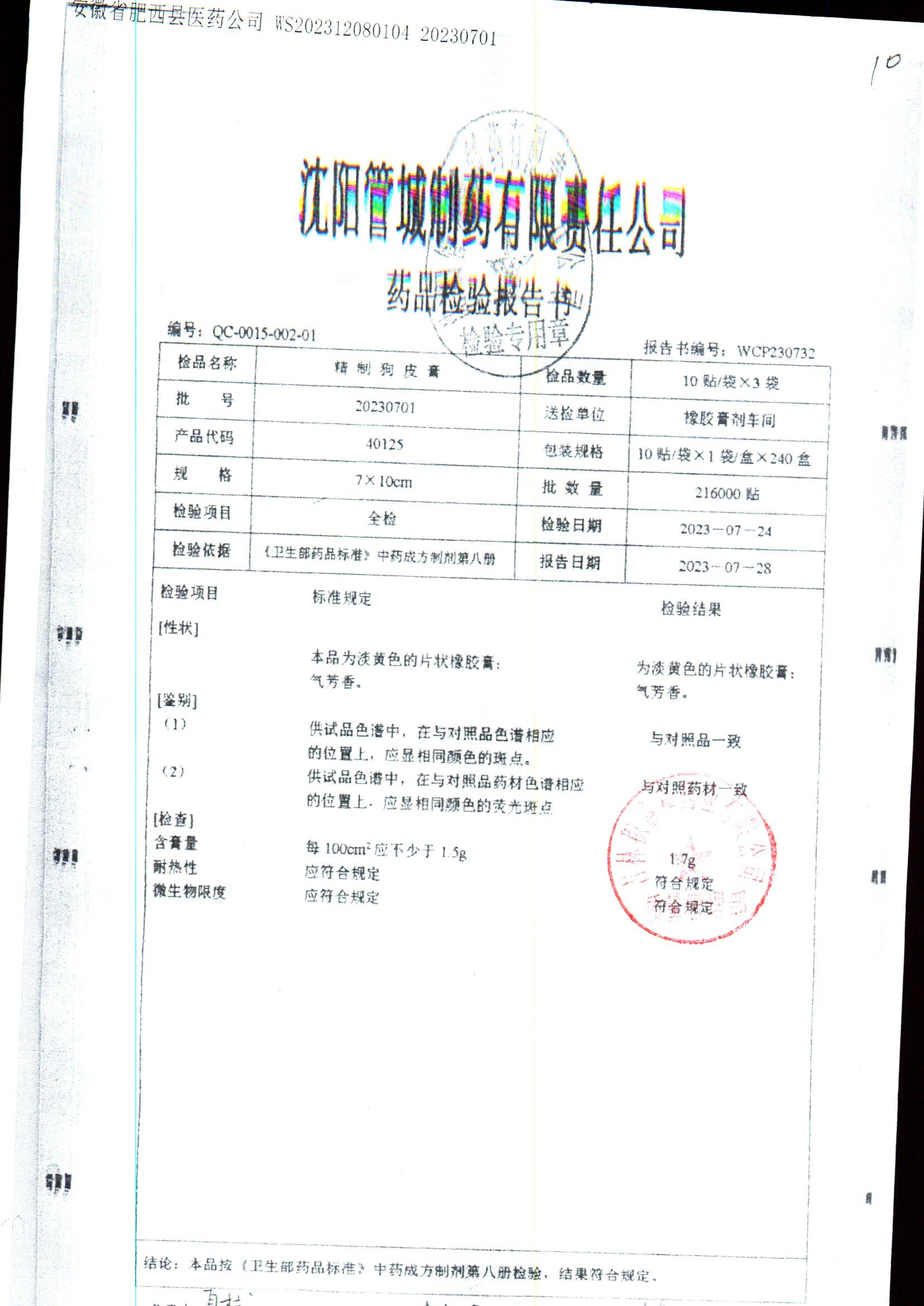 精制狗皮膏 | 7x10cm | 20230701 | 查看详情 |