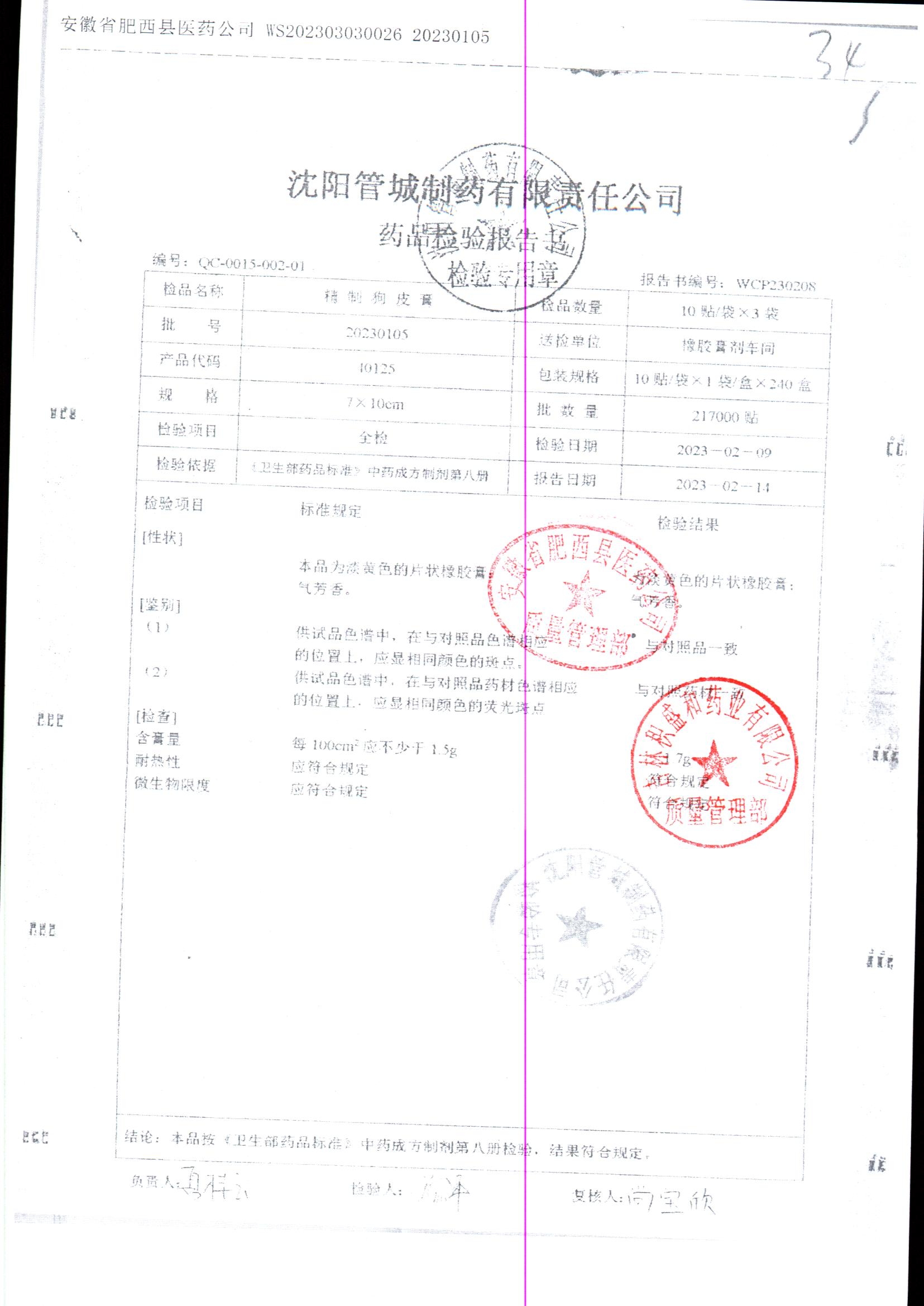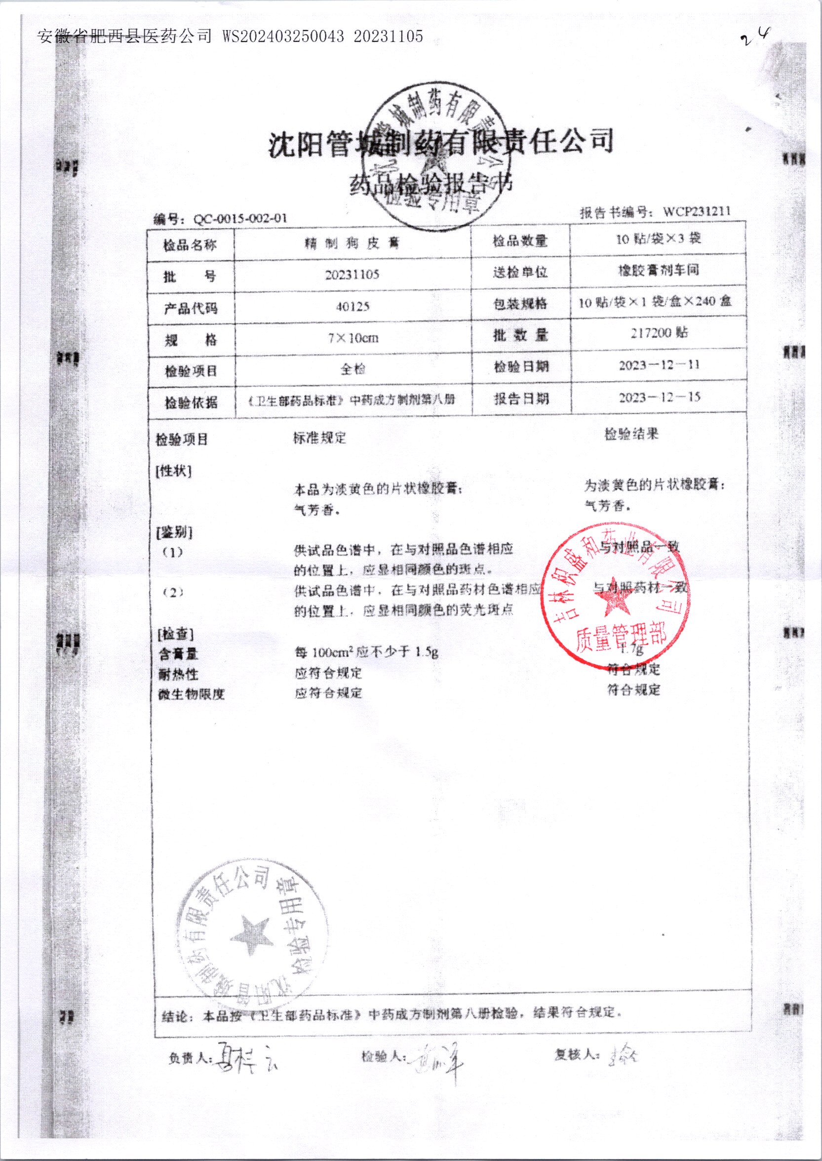 精制狗皮膏 | 7x10cm | 20231105 | 查看详情 |