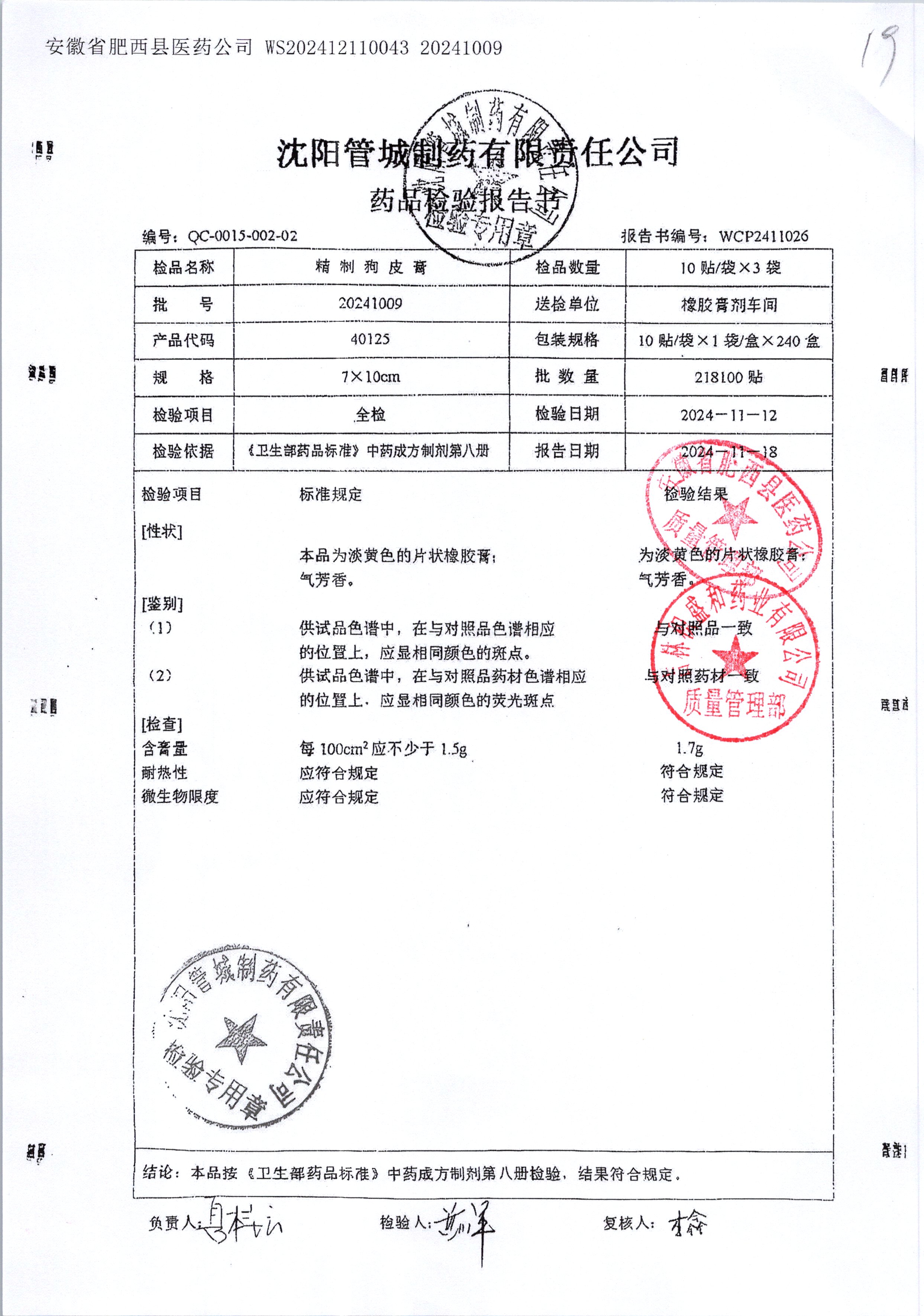 精制狗皮膏 | 7x10cm | 20241009 | 查看详情 |