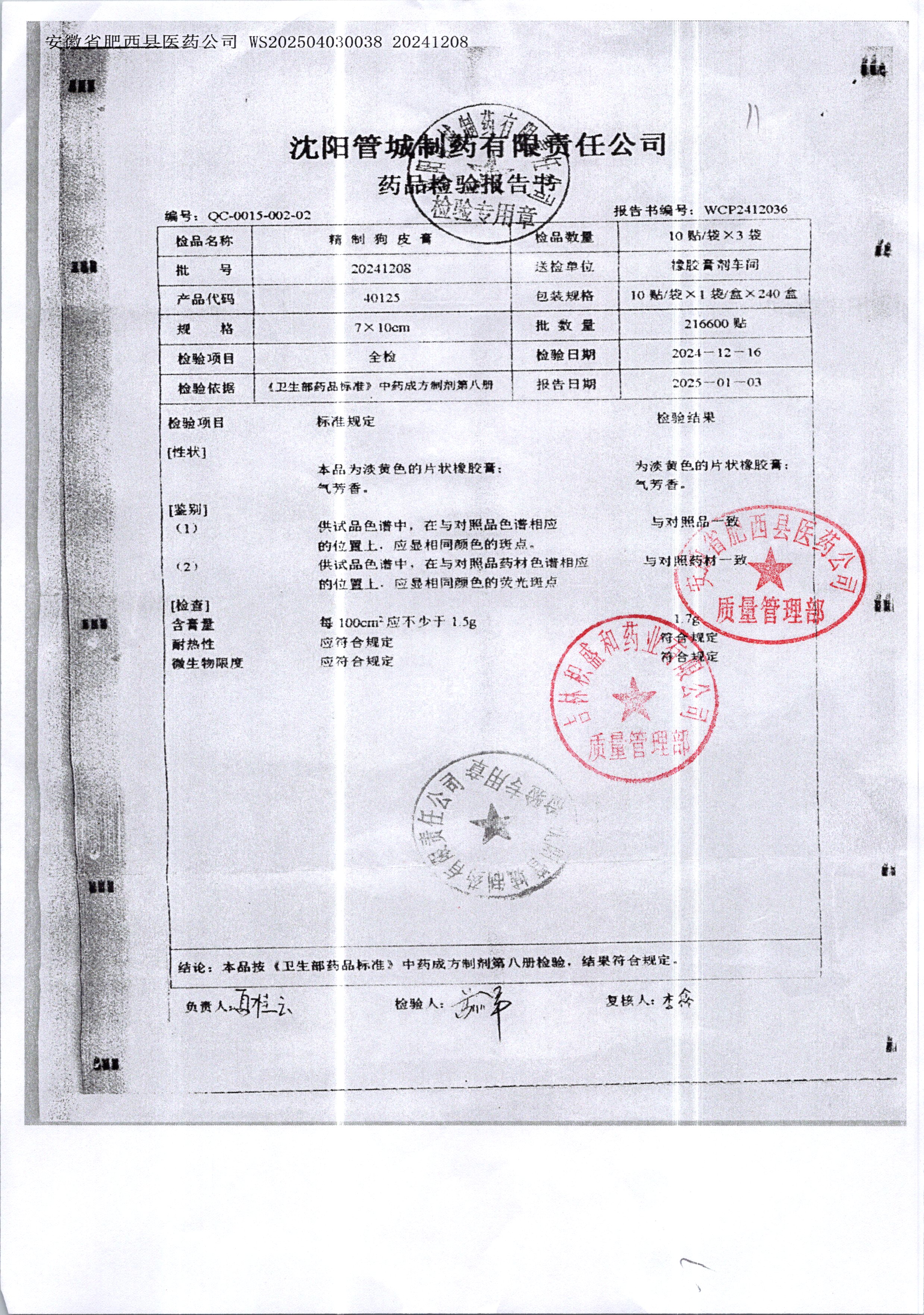 精制狗皮膏 | 7x10cm | 20241208 | 查看详情 |
