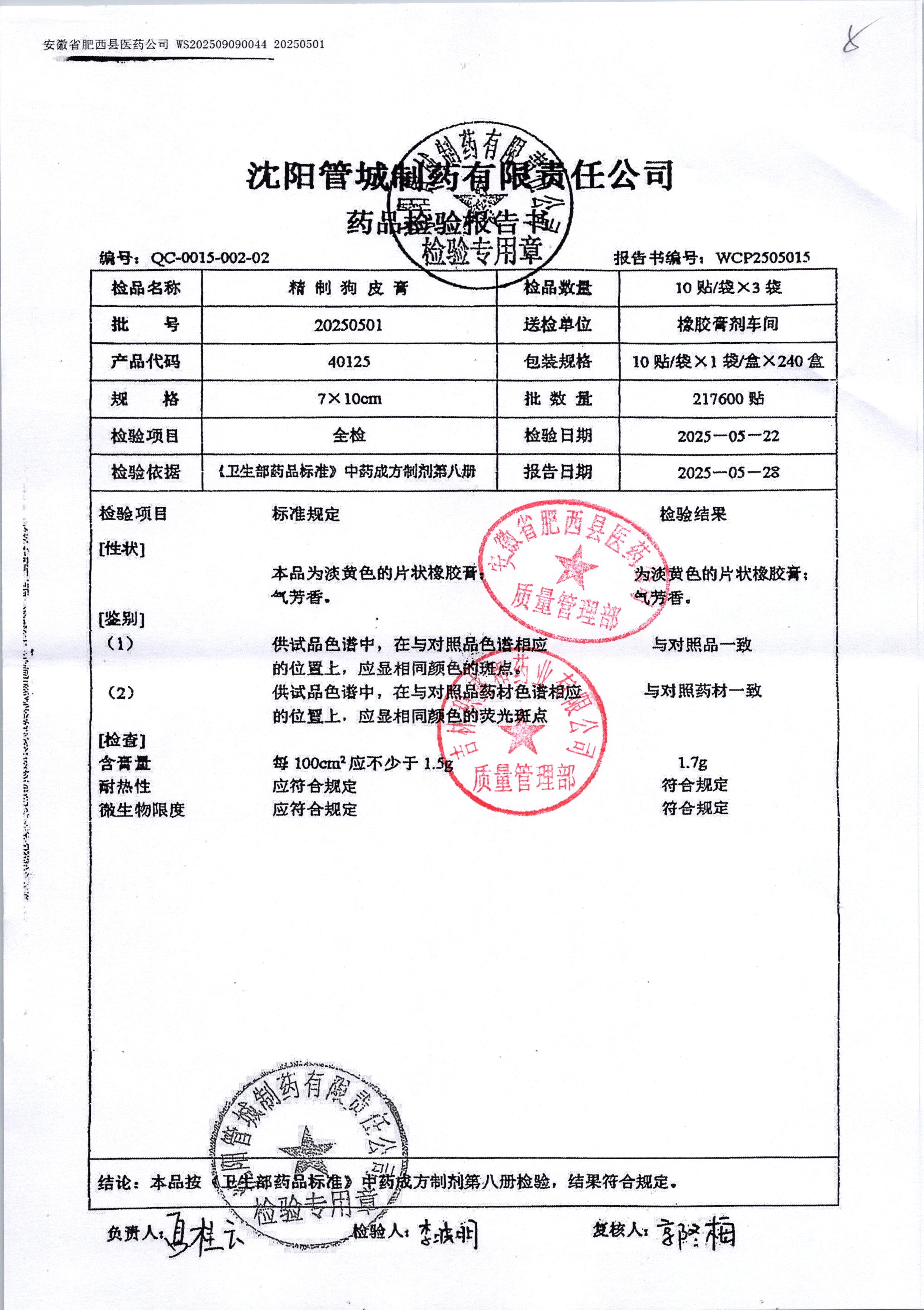 精制狗皮膏 | 7x10cm | 20250501 | 查看详情 |