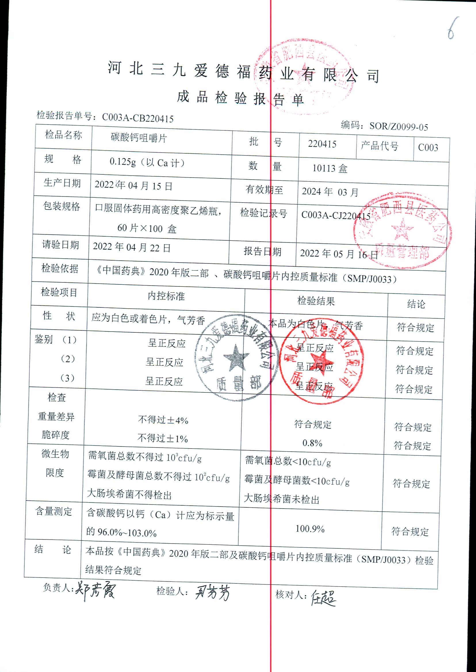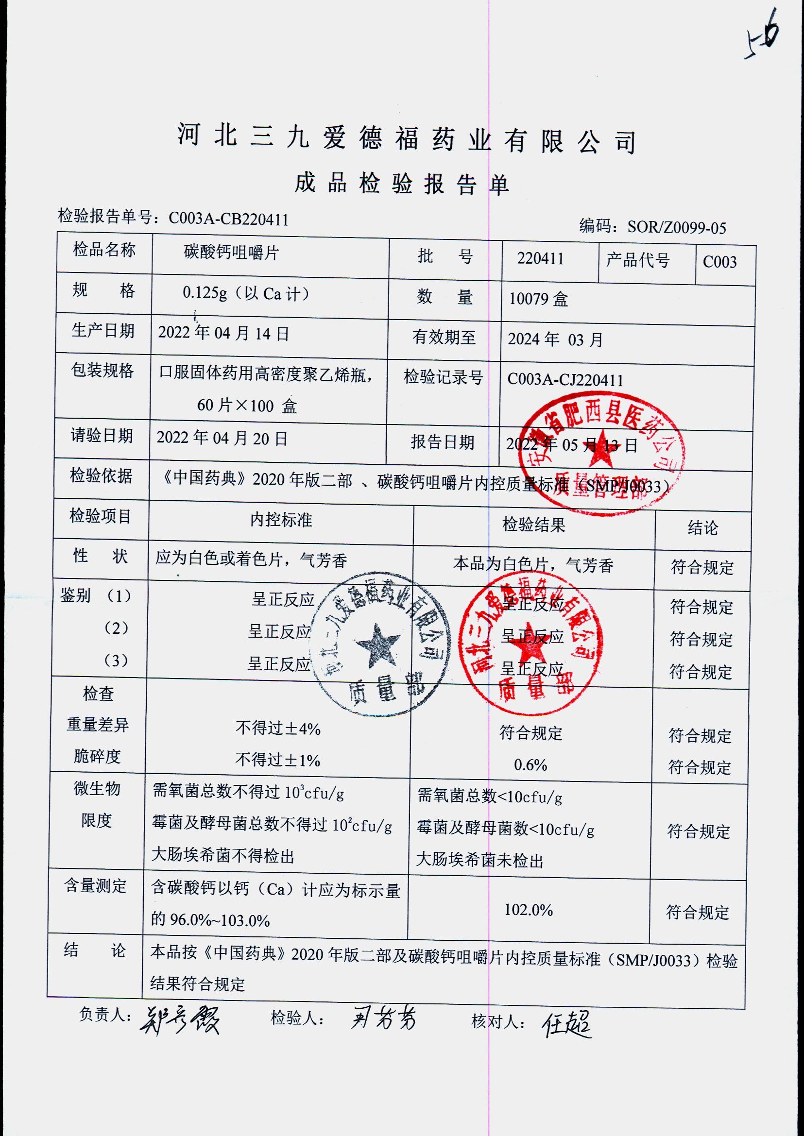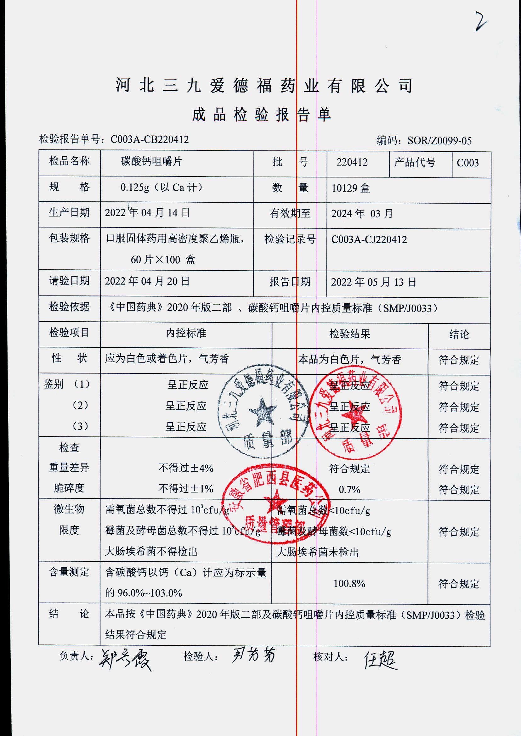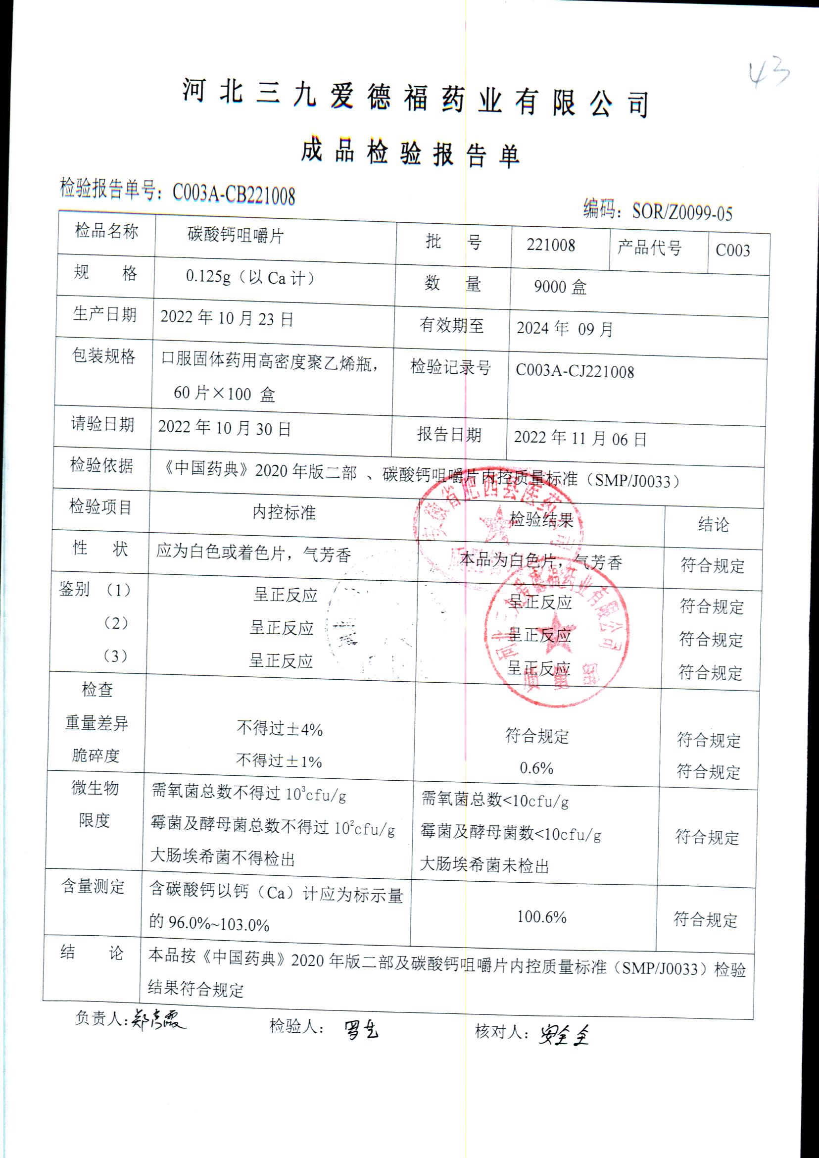 碳酸钙咀嚼片 | 0.125gx60片 | 220411 | 查看详情 |