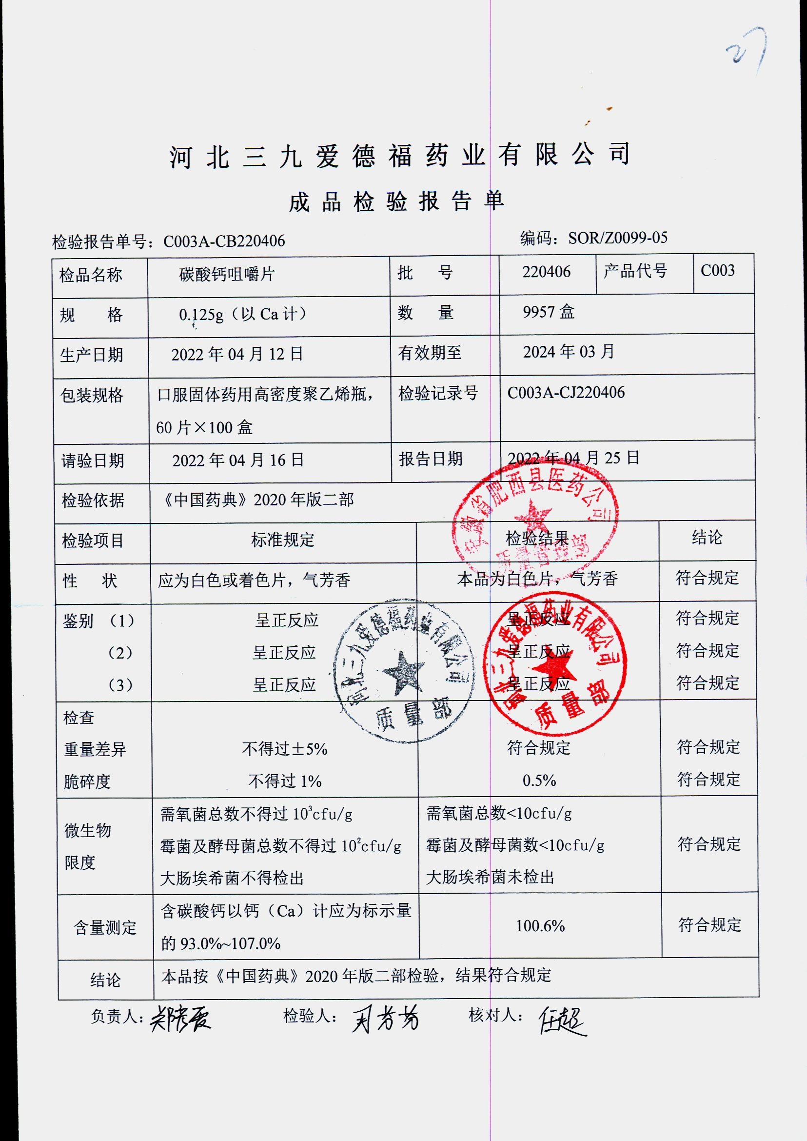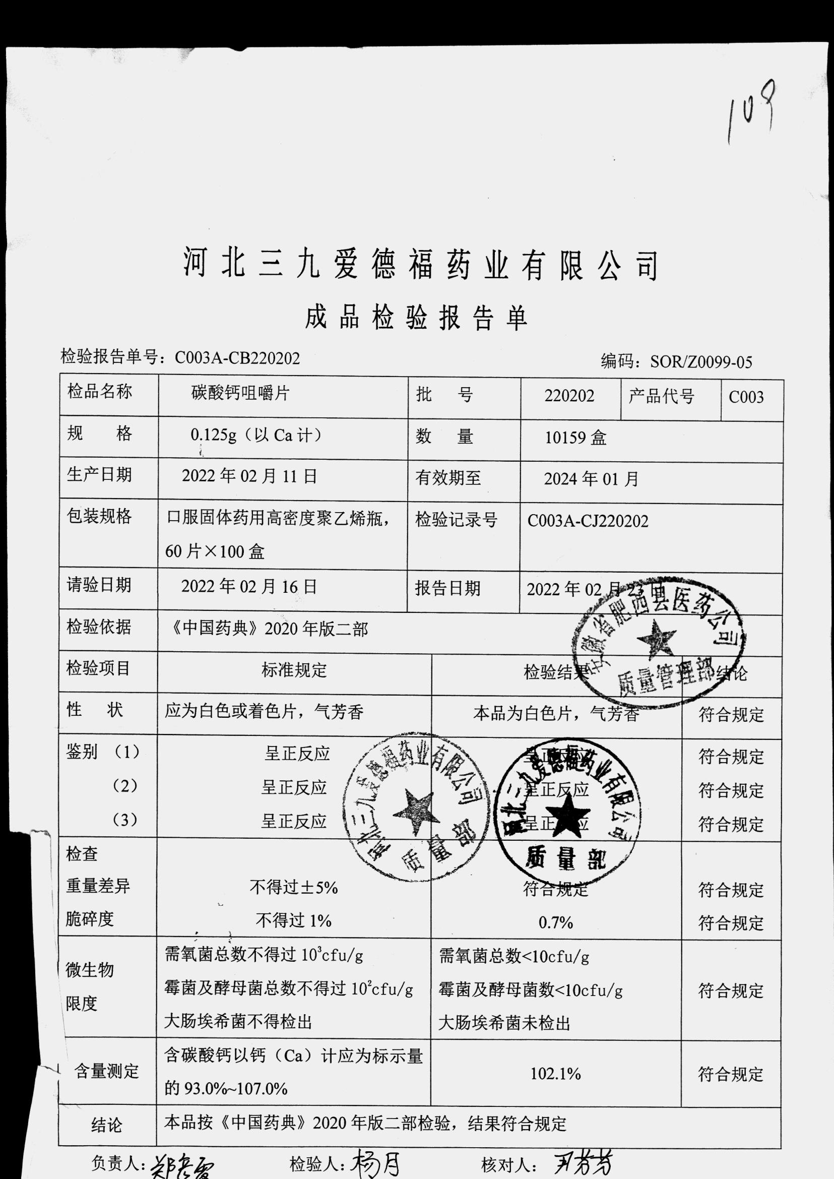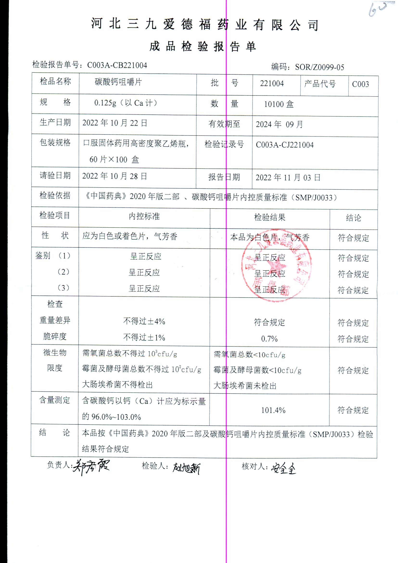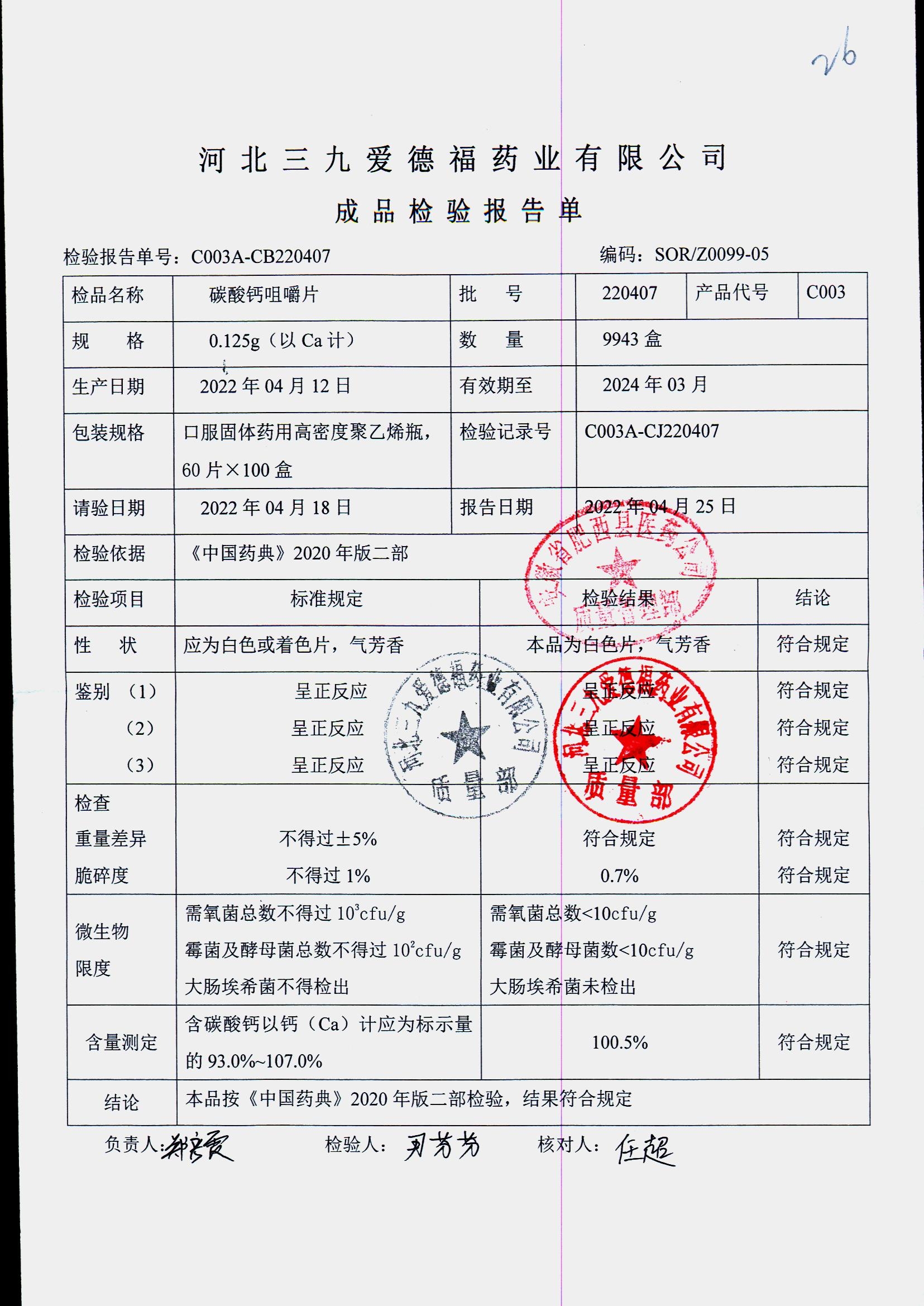 碳酸钙咀嚼片 | 0.125gx60片 | 220411 | 查看详情 |