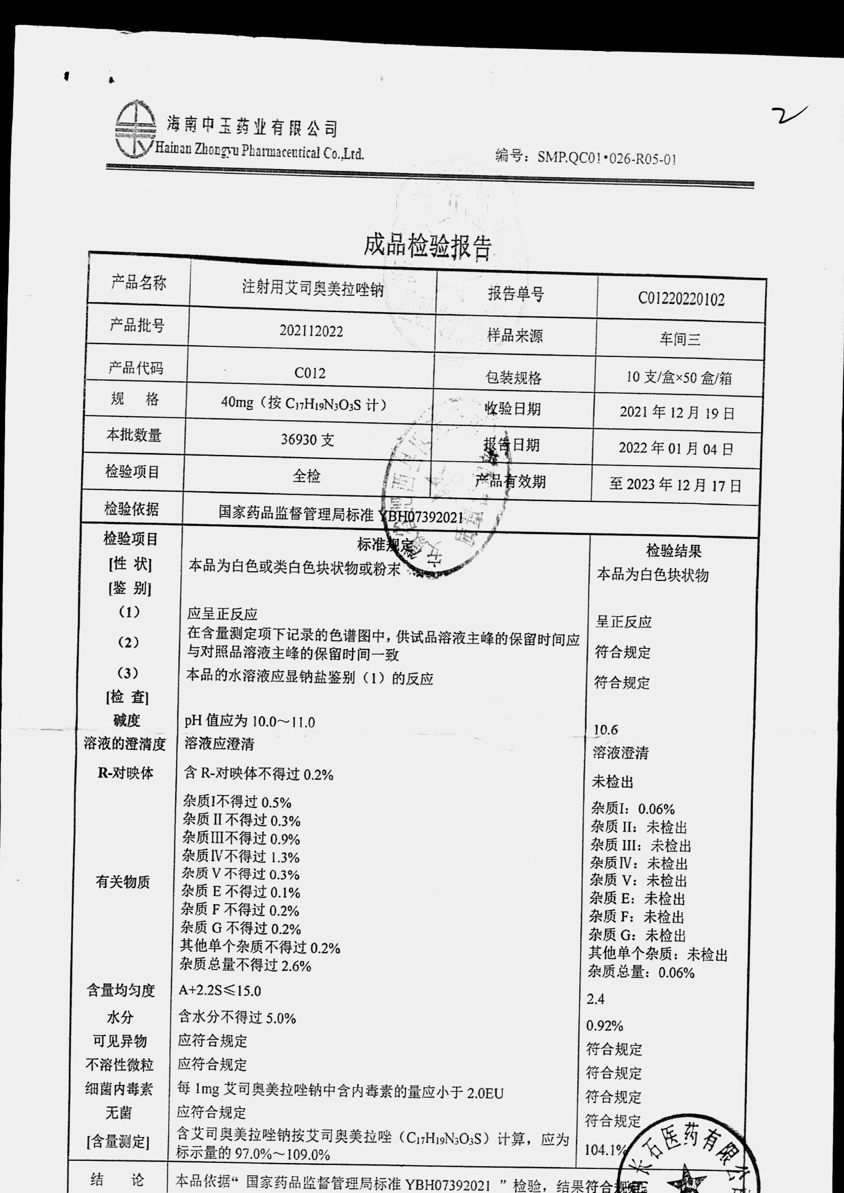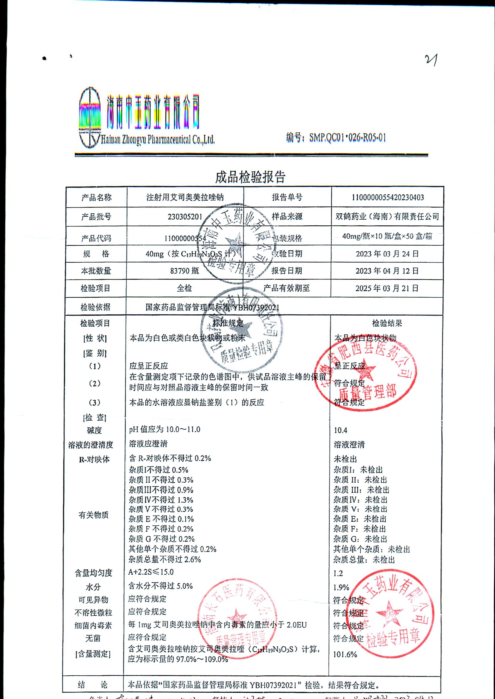 注射用艾司奥美拉唑钠 | 40mgx10支 | 202112022 | 查看详情 |