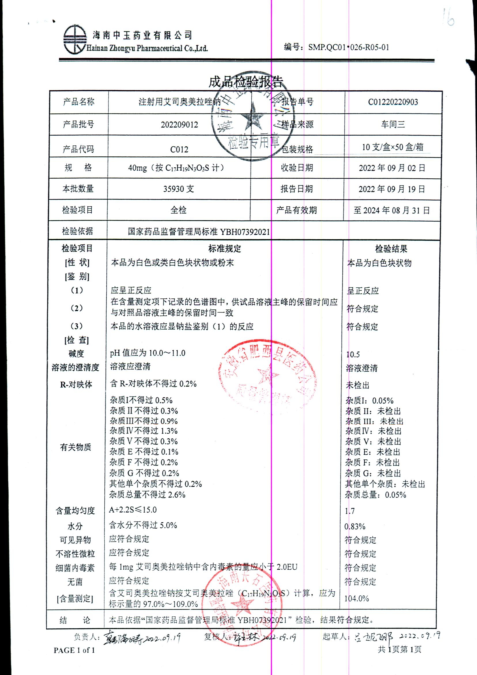 注射用艾司奥美拉唑钠 | 40mgx10支 | 202209012 | 查看详情 |