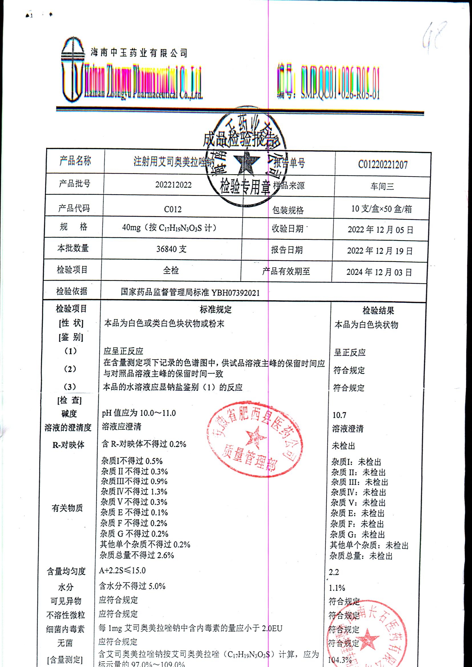 注射用艾司奥美拉唑钠 | 40mgx10支 | 202212022 | 查看详情 |