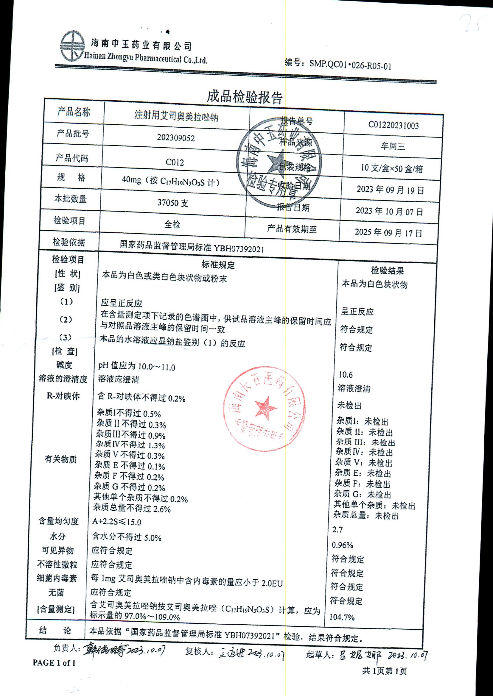 注射用艾司奥美拉唑钠 | 40mgx10支 | 202309062 | 查看详情 |
